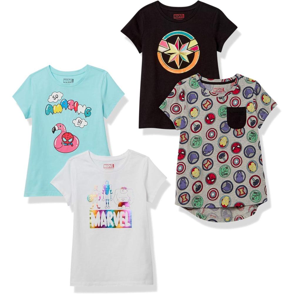 Amazon Essentials Disney | Marvel | Star Wars | Frozen | Princess Girls and Toddlers’ Short-Sleeve T-Shirts, Multipacks(Black/Blue/Grey/White Marvel Super Hero)