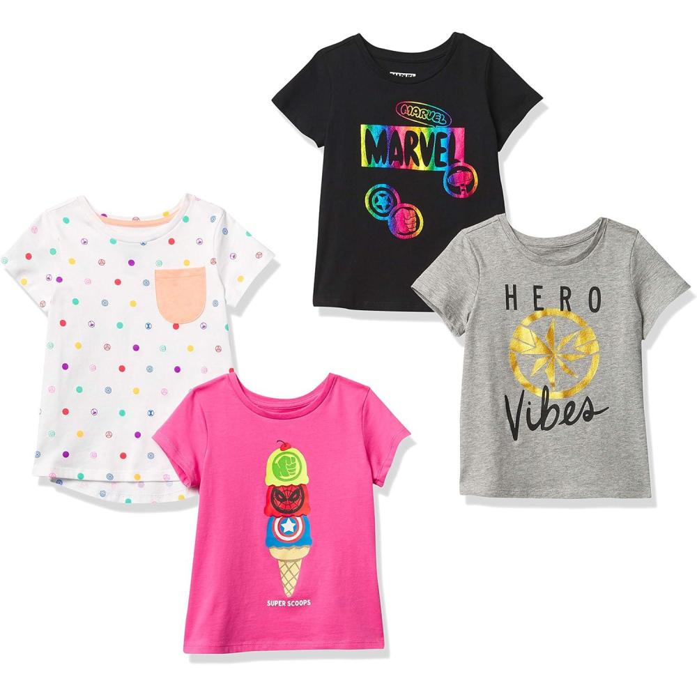 Amazon Essentials Disney | Marvel | Star Wars | Frozen | Princess Girls and Toddlers’ Short-Sleeve T-Shirts, Multipacks(Marvel Super Hero Print)