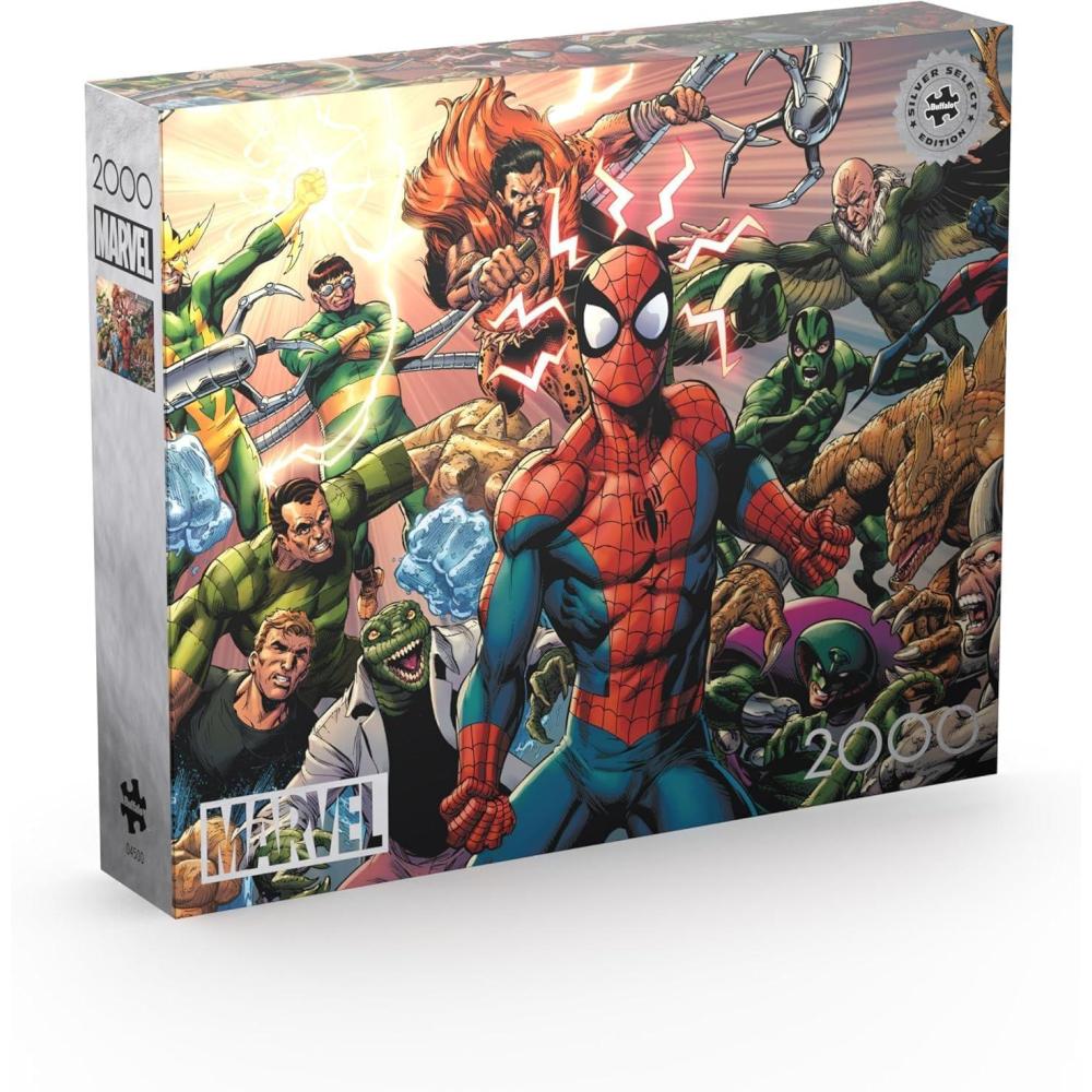 This 1000-piece Marvel Silver Select Puzzle is created for the Spider-Man fan. It features multiple alternative versions of Spider-Man – Miles Morales, Spider-Gwen, Spider-Man Noir, Peni Parker, Spider-Ham, Spider-Man 2099, and, of course, Peter Parker all make an appearance in this collage of epic proportions. Looks closely and you can even find some of Spider-man’s greatest nemeses like Venom, Rhino, and more! The Silver Select puzzles are curated and timeless images from Marvel, Charles Wysocki, and more. They are packaged in a giftable box with silver foil accents, use premium recycled puzzle board, and include a full-color diagram. Every Buffalo Games jigsaw puzzle is manufactured from recycled puzzle board. A precision cutting technique guarantees that every piece will fit soundly with the company's signature Perfect Snap™. A bonus puzzle poster is also included so that you have a handy reference of what the completed puzzle should look like while you put yours together. ©2023 MARVEL
