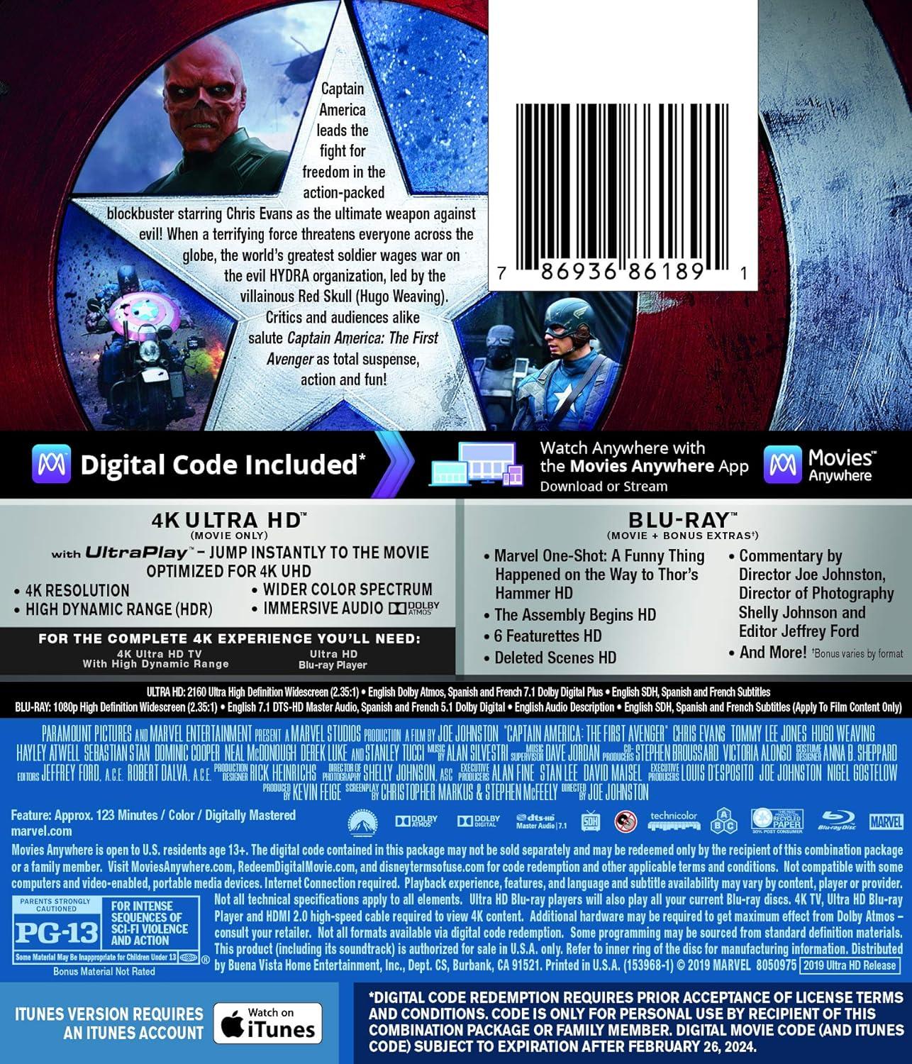 Captain America leads the fight for freedom in the action-packed blockbuster starring Chris Evans as the ultimate weapon against evil! When a terrifying force threatens everyone across the globe, the world's greatest soldier wages war on the evil HYDRA organization, led by the villainous red Skull (Hugo Weaving). Critics and audiences alike salute CAPTAIN AMERICA: THE FIRST AVENGER as total suspense, action and fun!