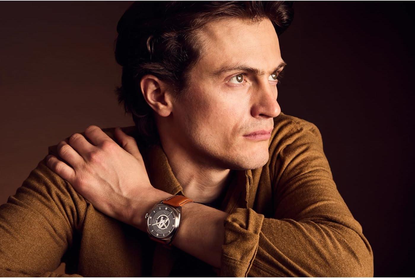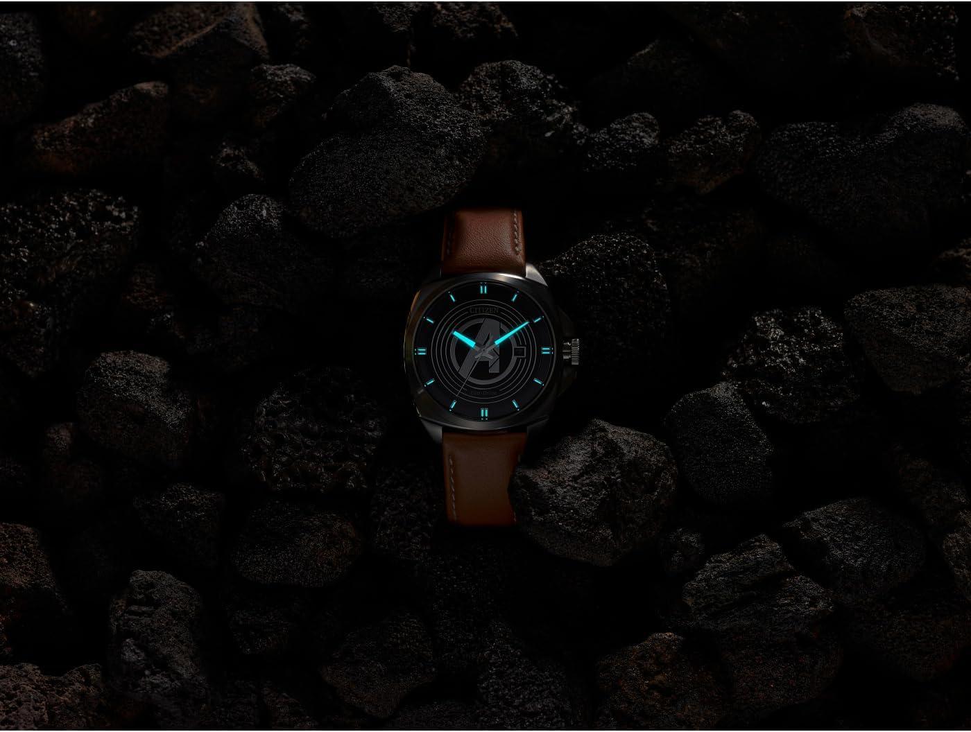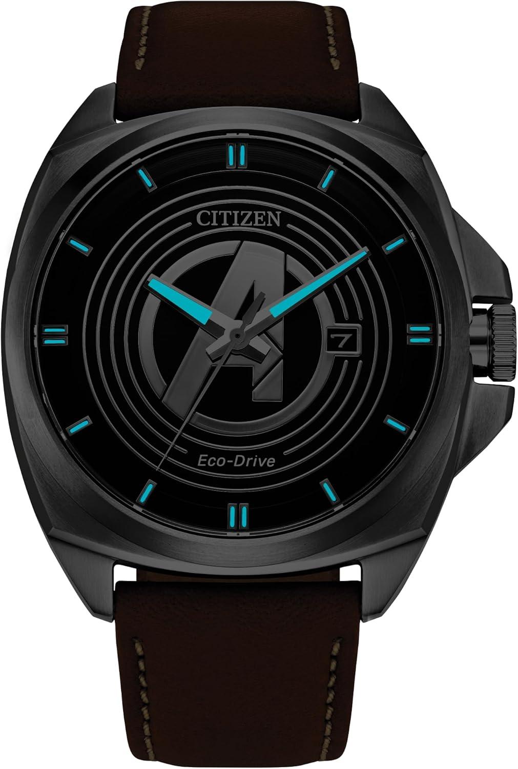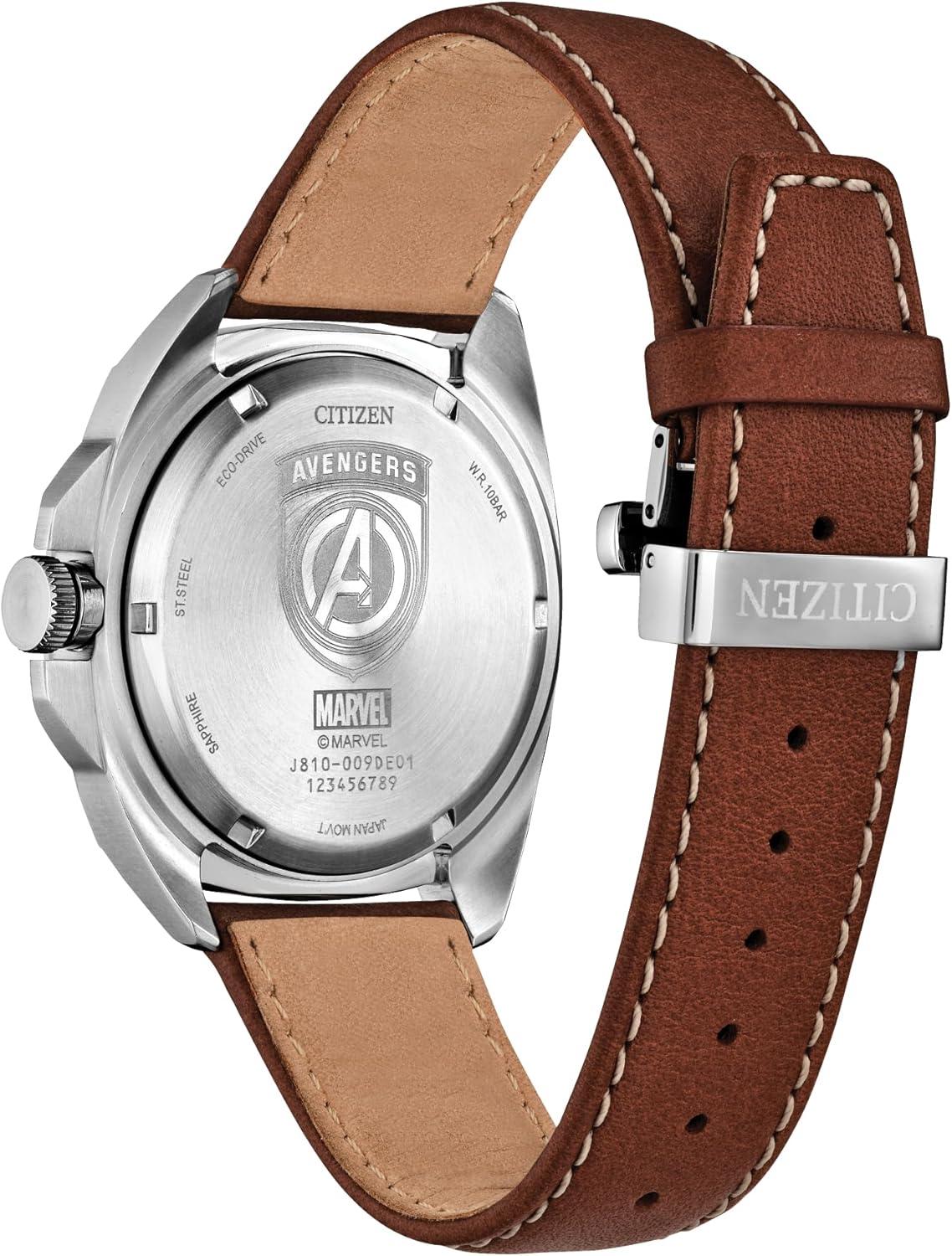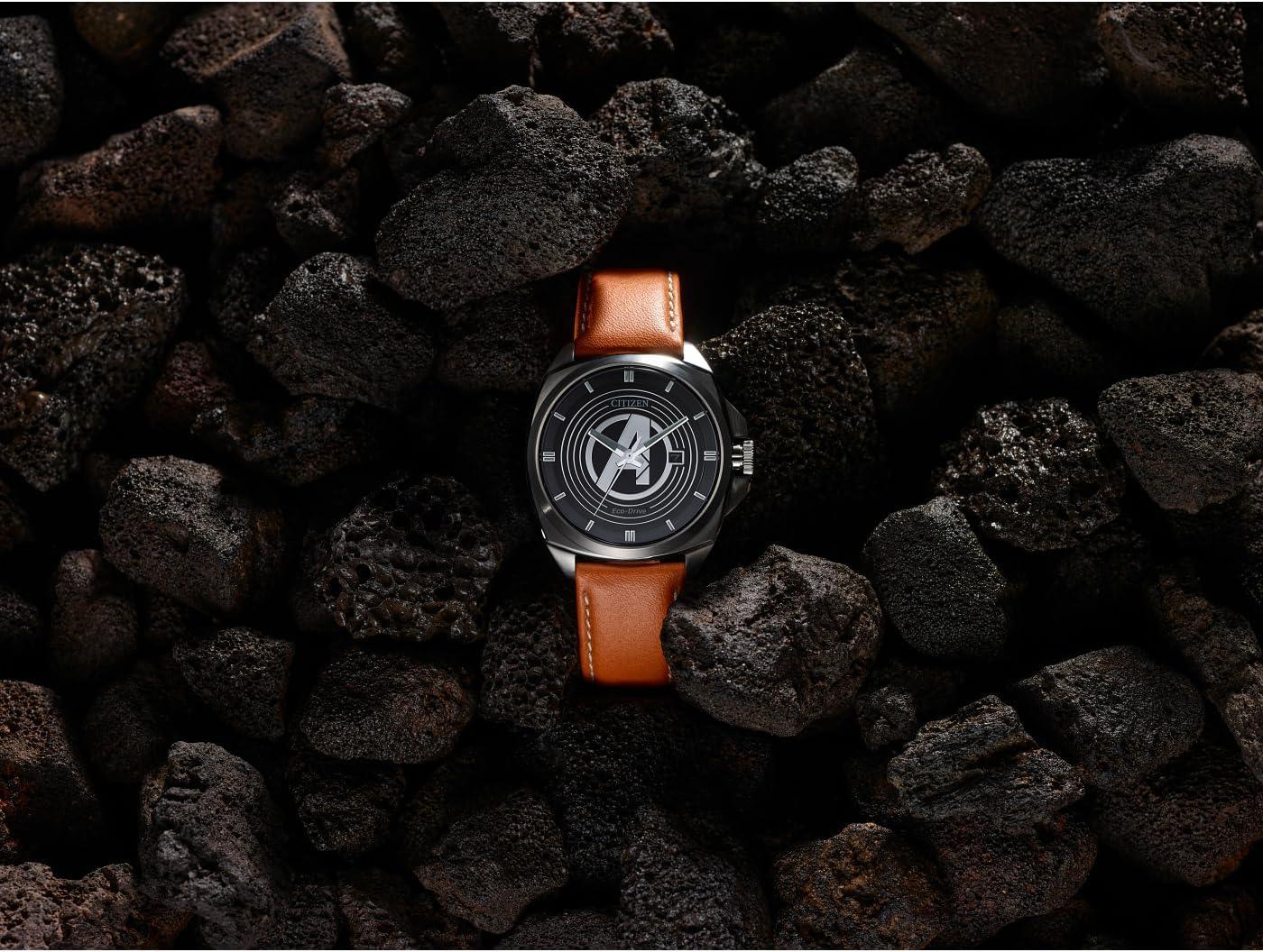 Avengers fans, assemble! It’s time to refresh your protecting-the-world wardrobe with a stunning new watch that pays tribute to the elite team of Marvel Super Heroes who come together to defeat evil-doers. The black dial strikingly showcases the iconic “A” crossed with an arrow logo in silver-tone stainless steel that produces a three-dimensional effect, enhanced by surrounding concentric circles that appear to be in motion along with luminous hands and markers. The faceted brushed 42mm case and brown leather strap with contrast stitching elevate the look. Heroes deserve a watch that’s sustainably sustainably powered by any light with Eco-Drive technology and never needs a battery. © 2024 MARVEL