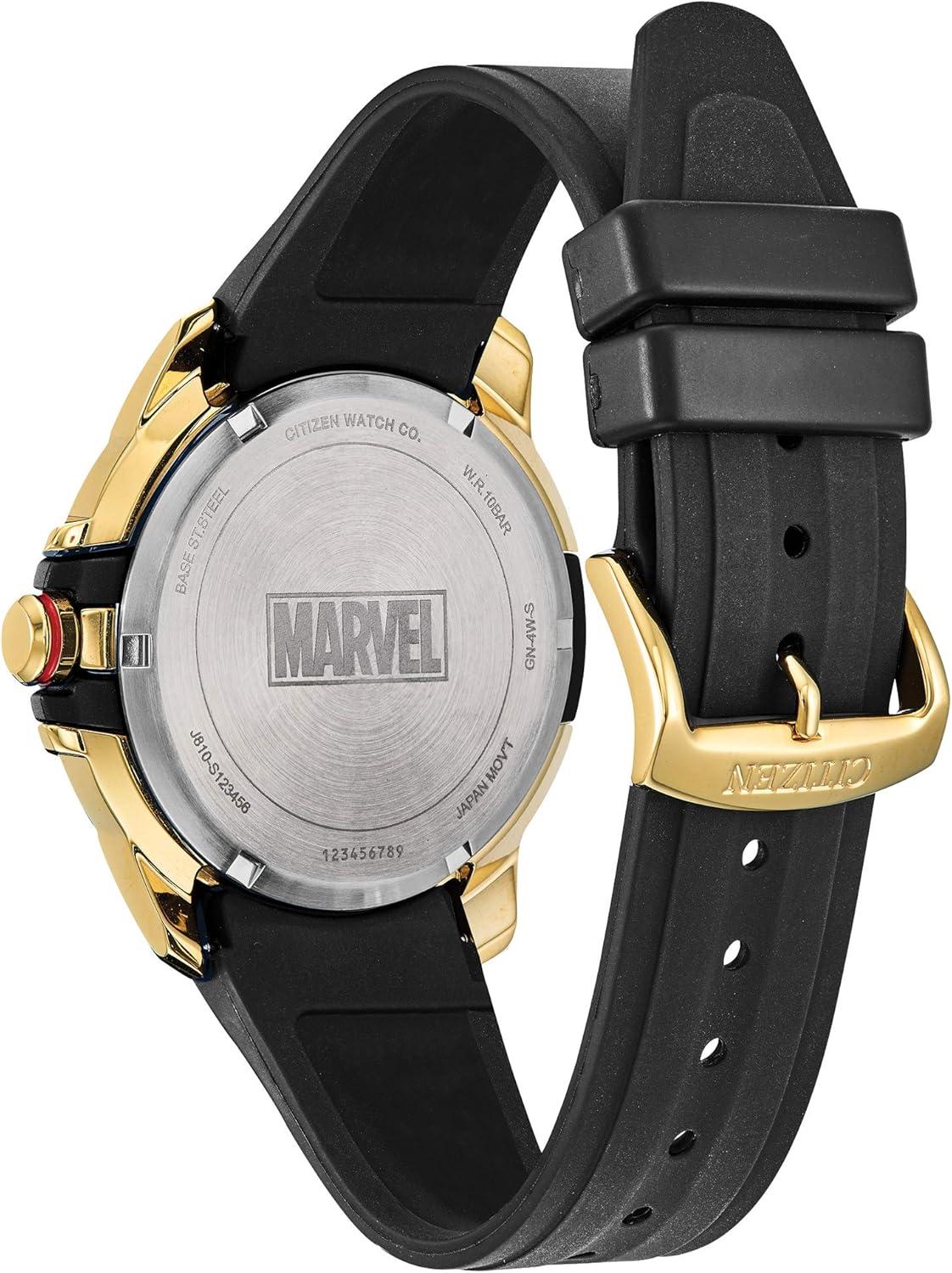Wear your Super Hero on your wrist with the new Marvel Avengers timepiece by Citizen. The iconic Avengers logo showcased on a black patterned dial within a black ion-plated stainless steel case with a gold-tone chroma finish and black silicone strap with date. Featuring our Eco-Drive technology – powered by light, any light. Never needs a battery. 2019 MARVEL