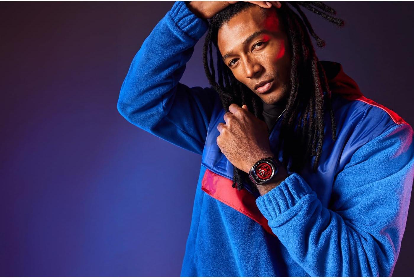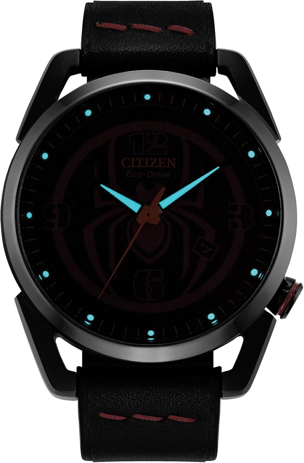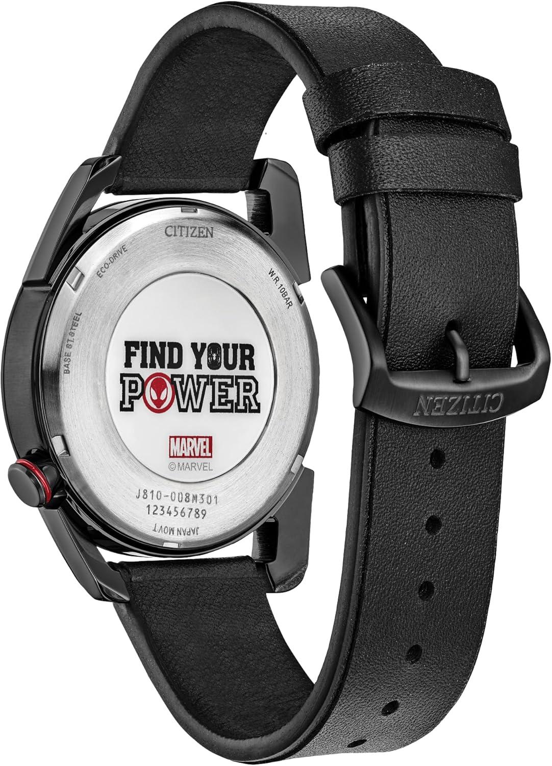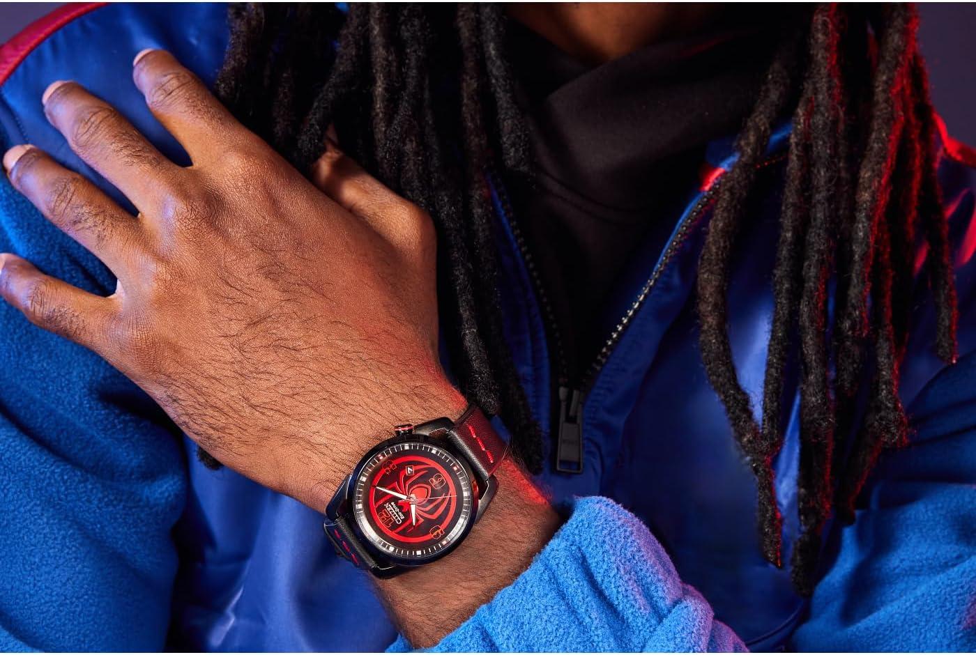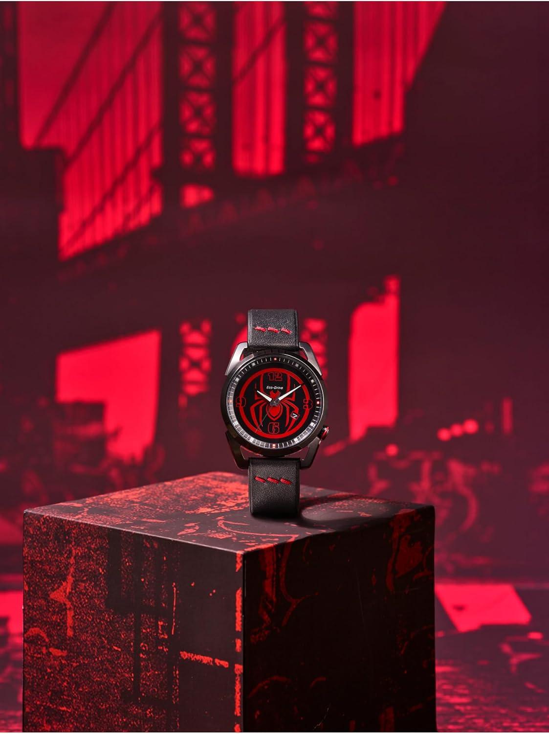 A new Marvel | Citizen Spider-Man watch has swung into town. The Miles Morales timepiece is a stunning showcase for the teen Super Hero and science prodigy from Brooklyn who has the power to produce bio-electrical charges at will. The character’s logo and luminous hands and markers adorn the deep black dial, while the 42mm black IP stainless steel case features distinctive arachnid-style lugs. Red contrast stitches are a striking detail on the black leather strap, and the case back features a colorful insert that encourages you to “Find Your Power.” No need to worry about that with this watch: it’s powered by any light with Citizen’s proprietary Eco-Drive technology and never needs a battery. © 2023 MARVEL