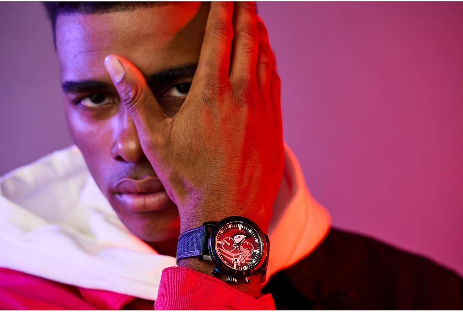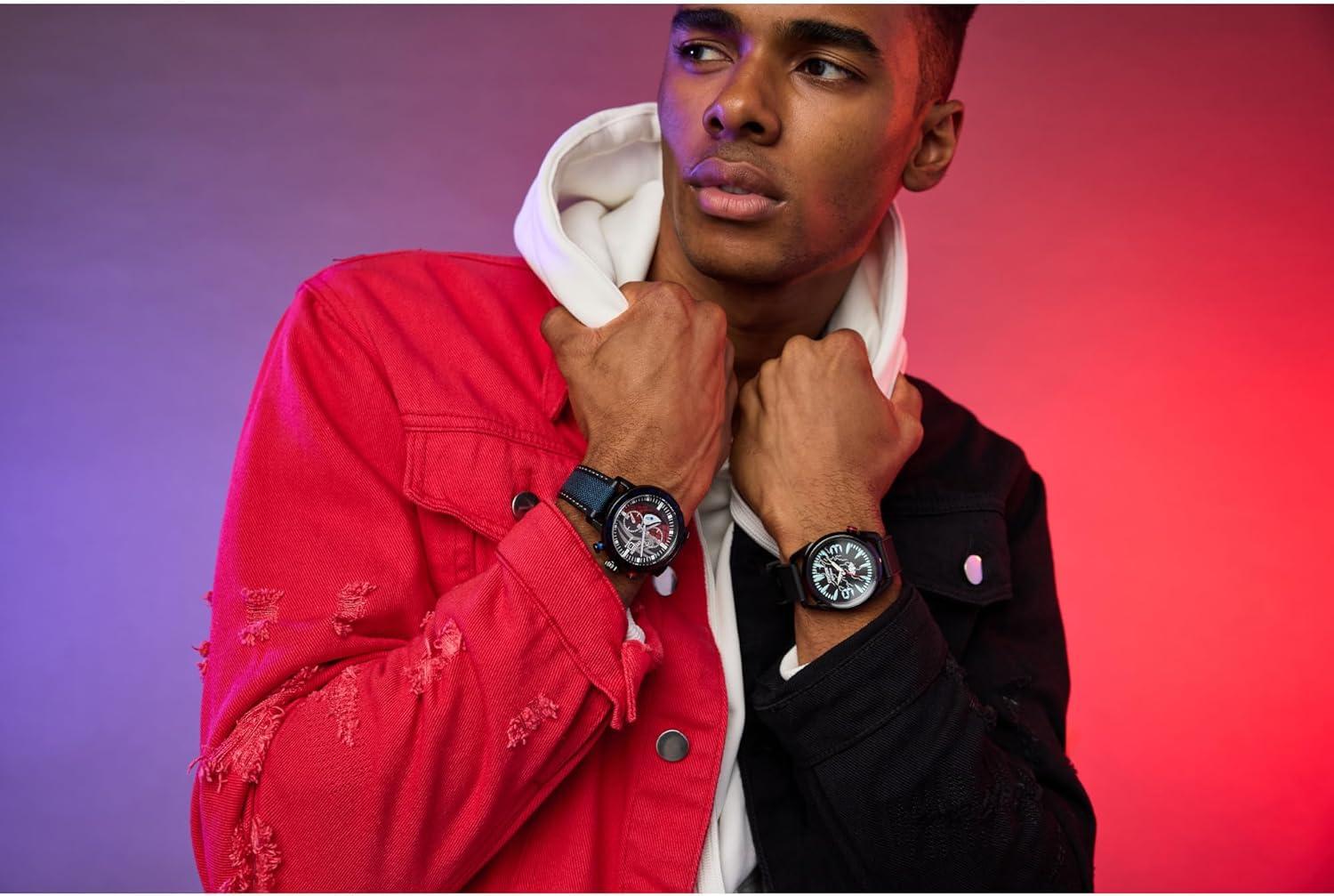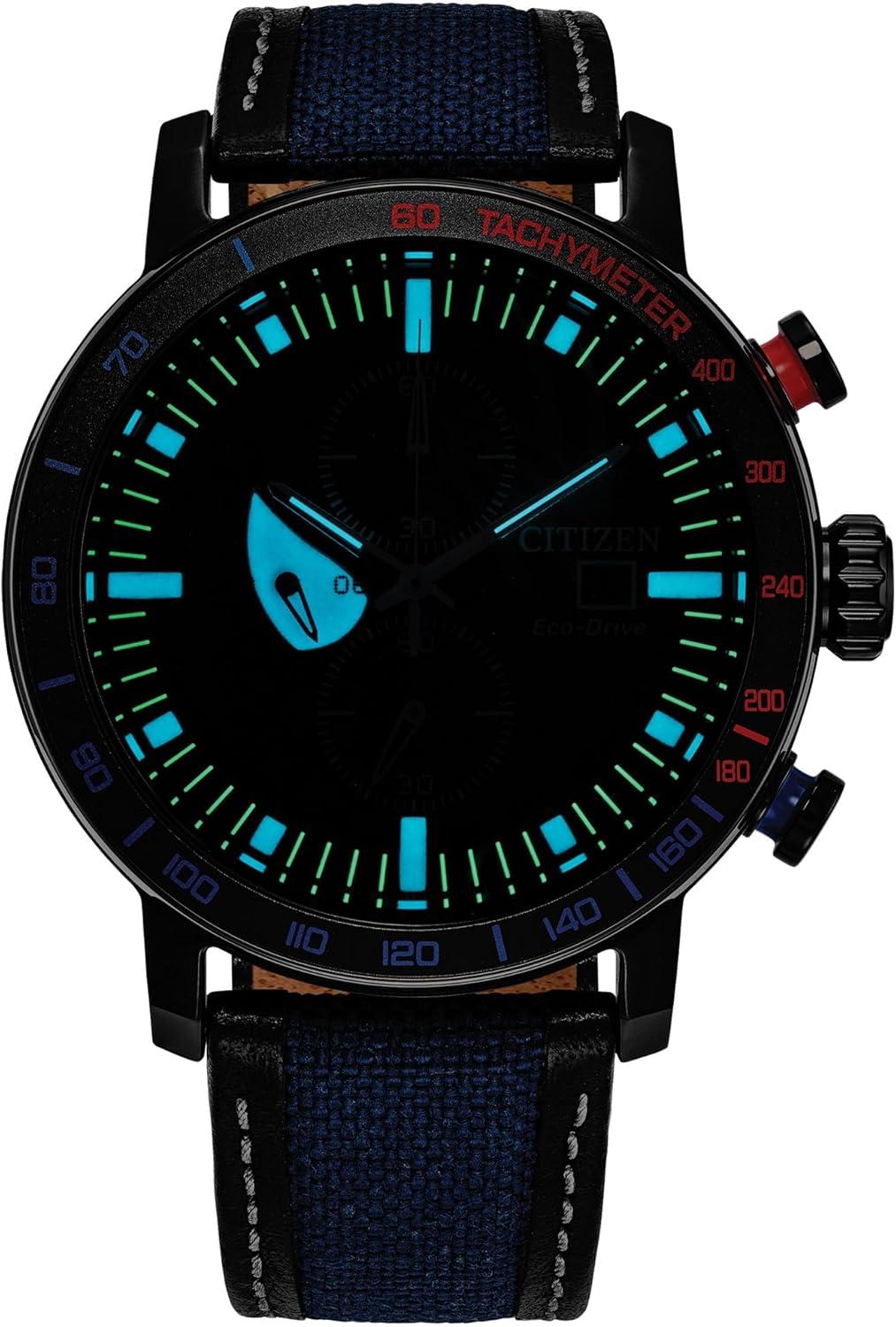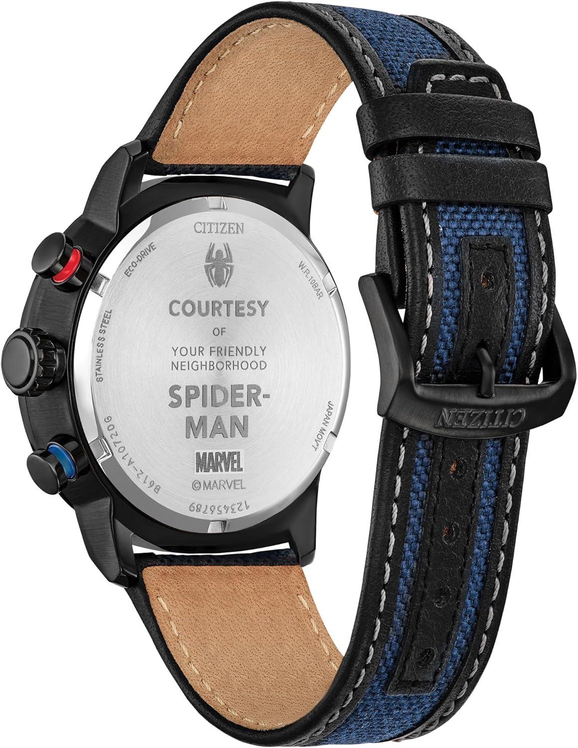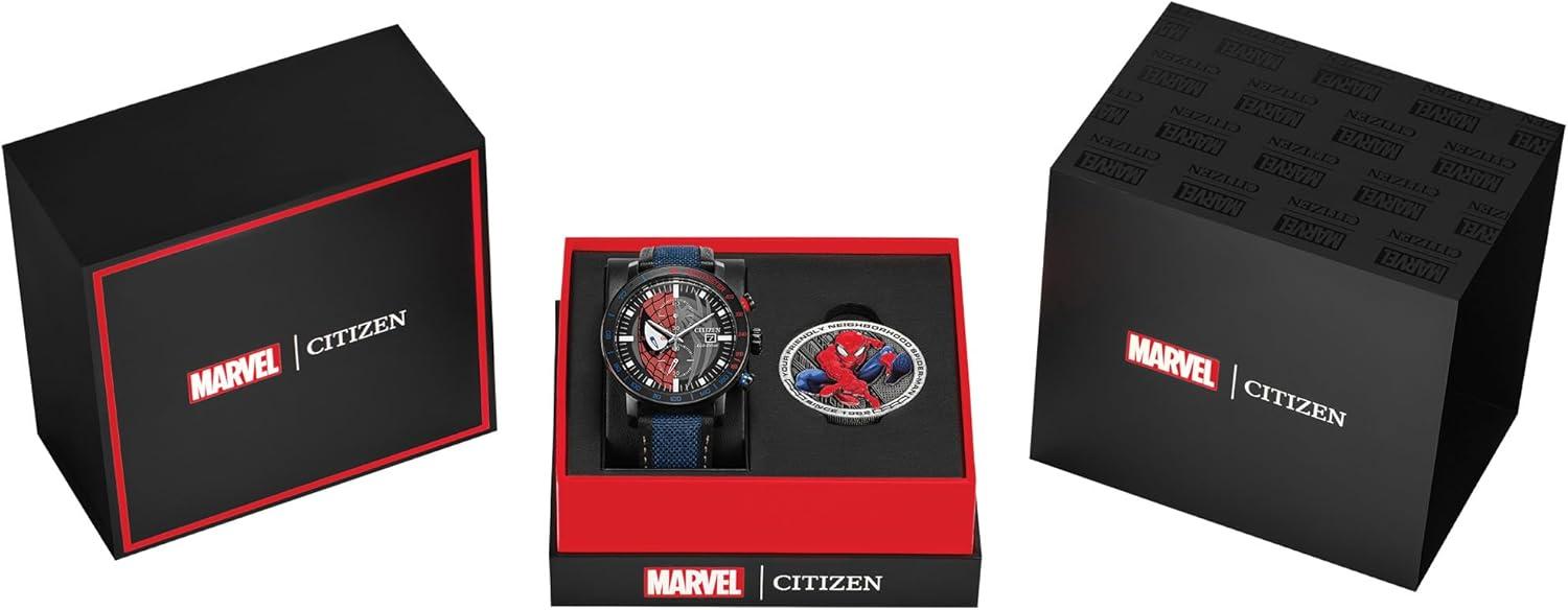 With his amazing abilities, disarming sense of humor, and innate goodness, it’s no (lab) accident that Peter Parker, aka Spider-Man, is one of the world’s most popular Super Heroes. An all-new boxed set with a chronograph watch and collectible coin conveys the essence of the young web-slinger with 44mm black IP stainless steel case containing a divided black matte dial: on the left is his partially depicted mask, and the right showcases half of the famed arachnid symbol. The markers and his eye are illuminated, and a tachymeter appears on the bezel. Etched on the stainless steel case back is “Courtesy Of Your Friendly Neighborhood Spider-Man,” and the watch features a blue Cordura nylon and black leather strap. The set is completed by a collectible coin that showcases Spider-Man on one side and his nemesis Venom on the back. And this timepiece is Earth-friendly, too: it’s powered by any light with Eco-Drive technology and never needs a battery. © 2025 MARVEL