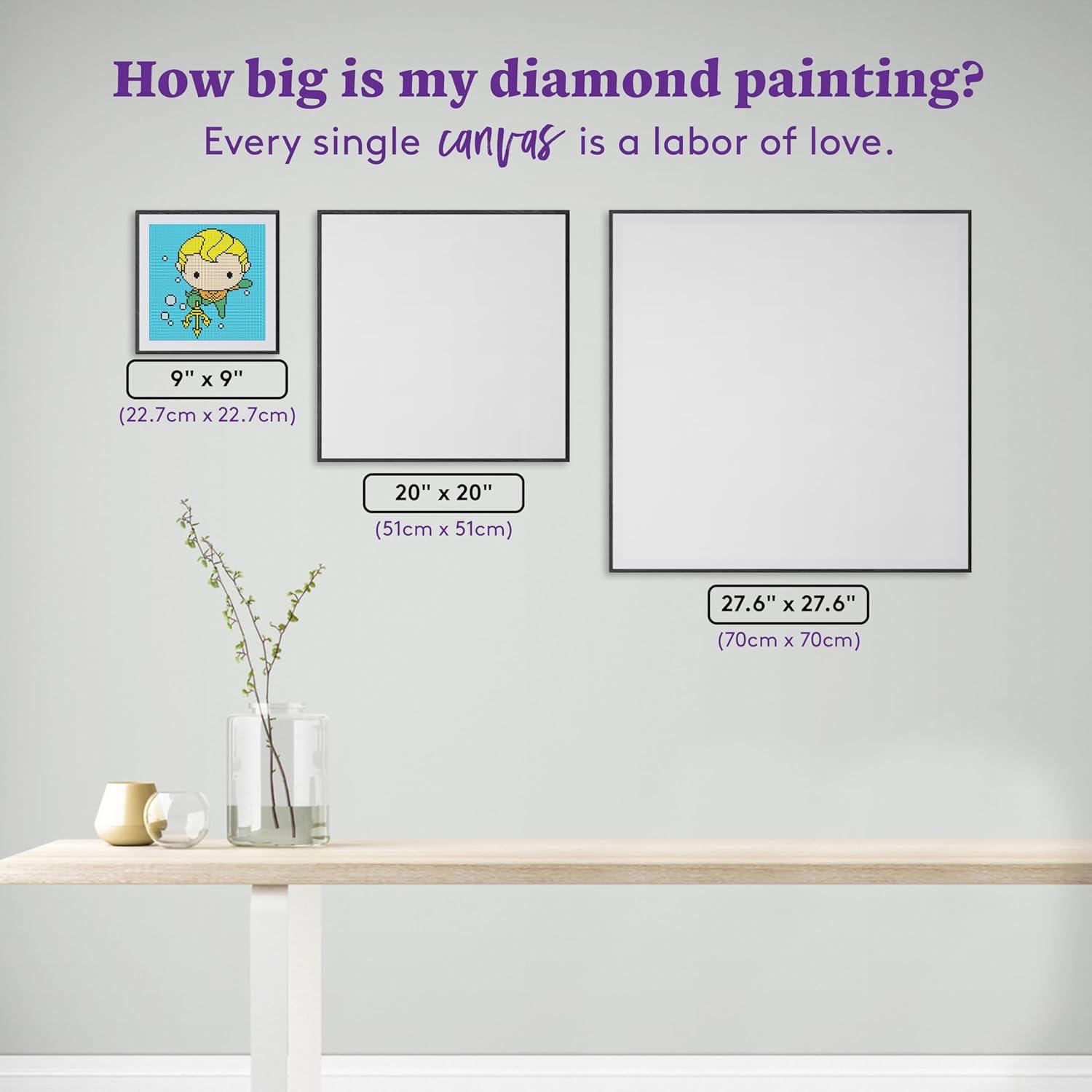 INCLUDED: A 13″ x 18″ (32.8 x 46 cm) full-drill canvas, round diamonds in 15 colors with 3 aurora borealis diamonds, 1 applicator with grip, 2 multi-placers, 1 cover minder, 1 tray with stopper, 1 wax container, 2 wax pads, washi tape, resealable baggies, sticker labels, and instructions. Diamond count: 19,188.