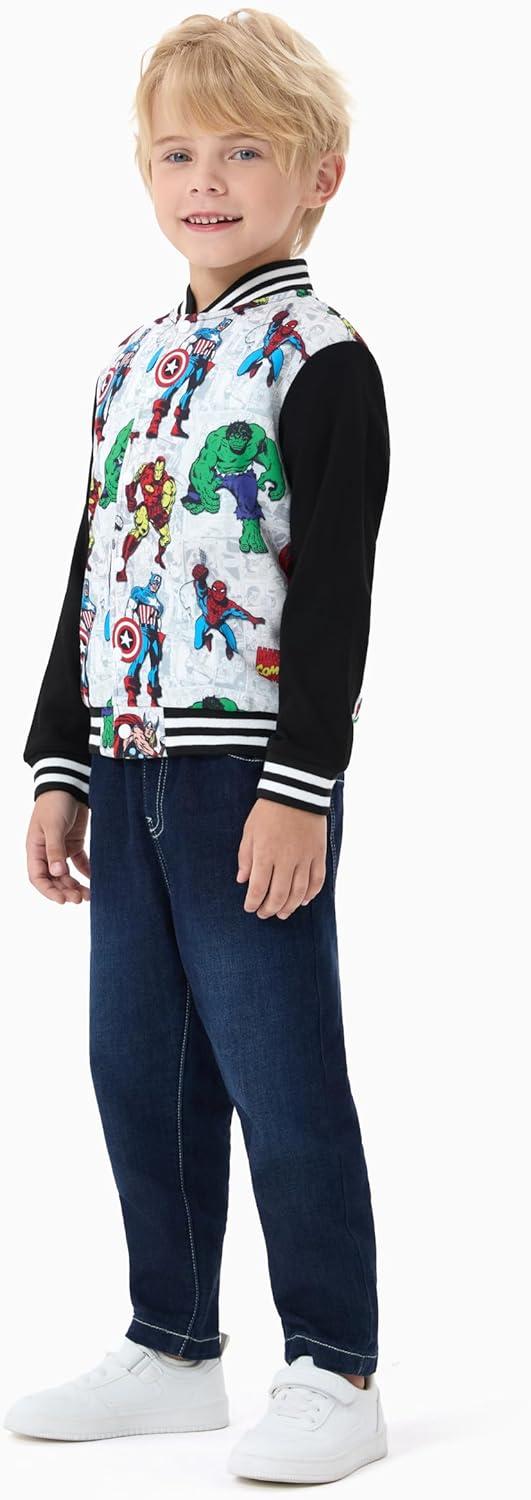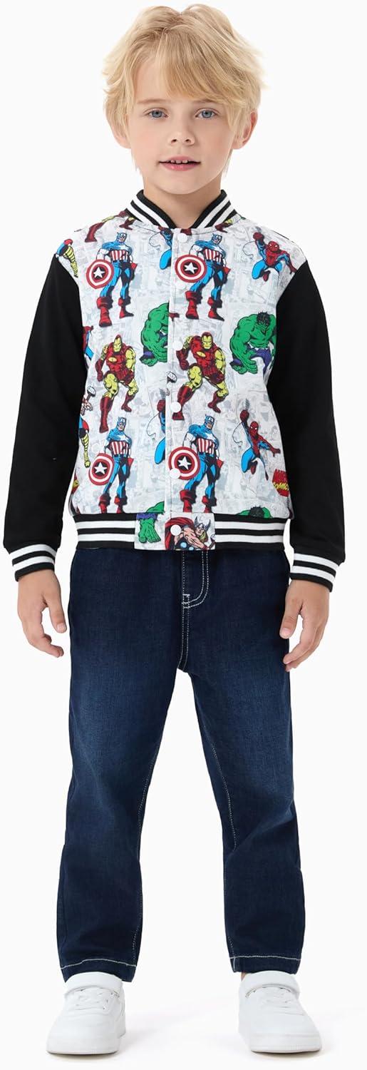 Gear up for an epic adventure with this officially licensed Marvel Comics varsity jacket. Designed for boys ages 2-13, this bomber jacket features vibrant graphics of Marvel heroes like Spiderman, Iron Man, Captain America, Thor, and Hulk. The perfect letterman jacket for Spring, Fall, and Winter wear, it adds a heroic touch to any boy’s wardrobe, making it ideal for school jackets, playdates, or family outings.