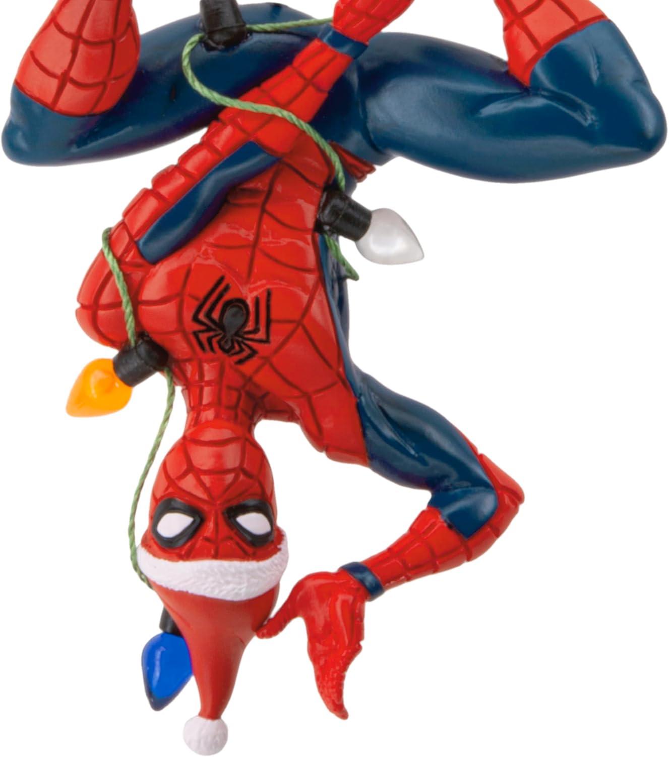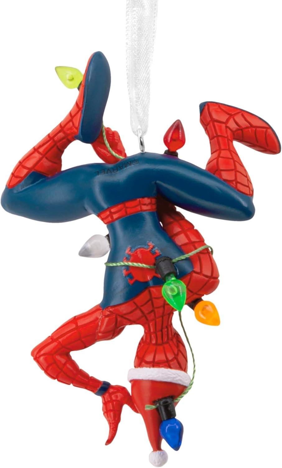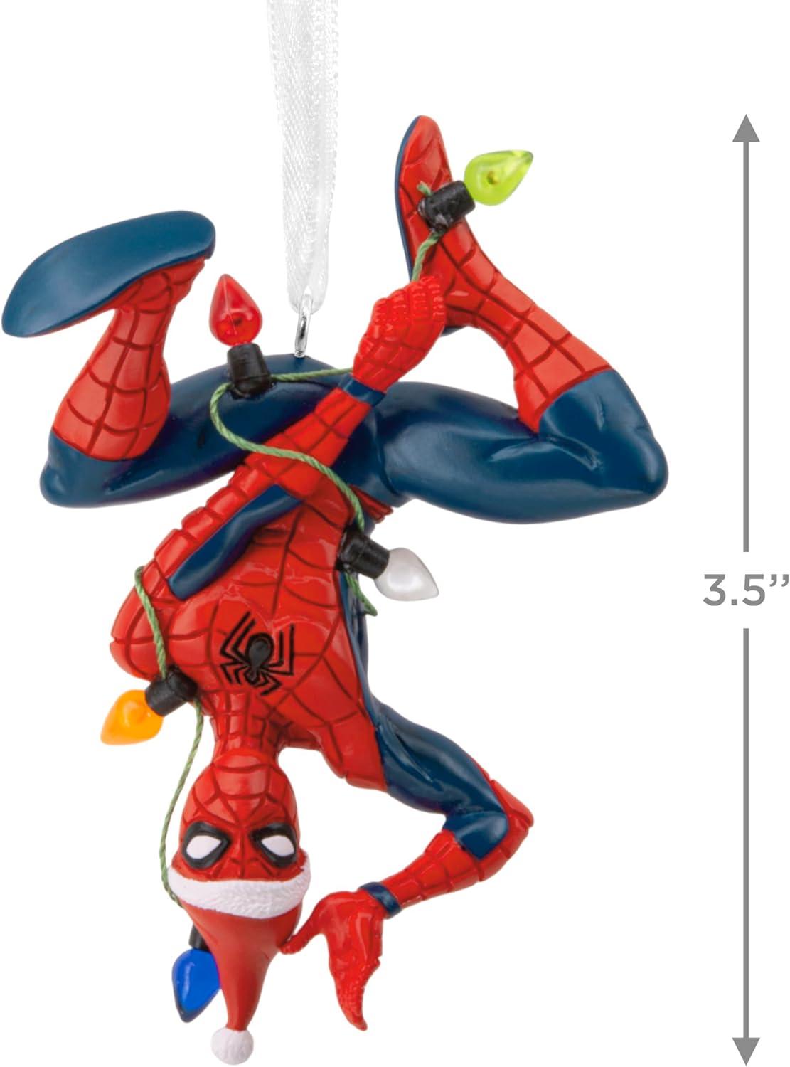 Get ready for holiday adventure with your friendly neighborhood Spider-Man. This festive Hallmark Christmas ornament features the Super Hero hanging from a string of Christmas lights.