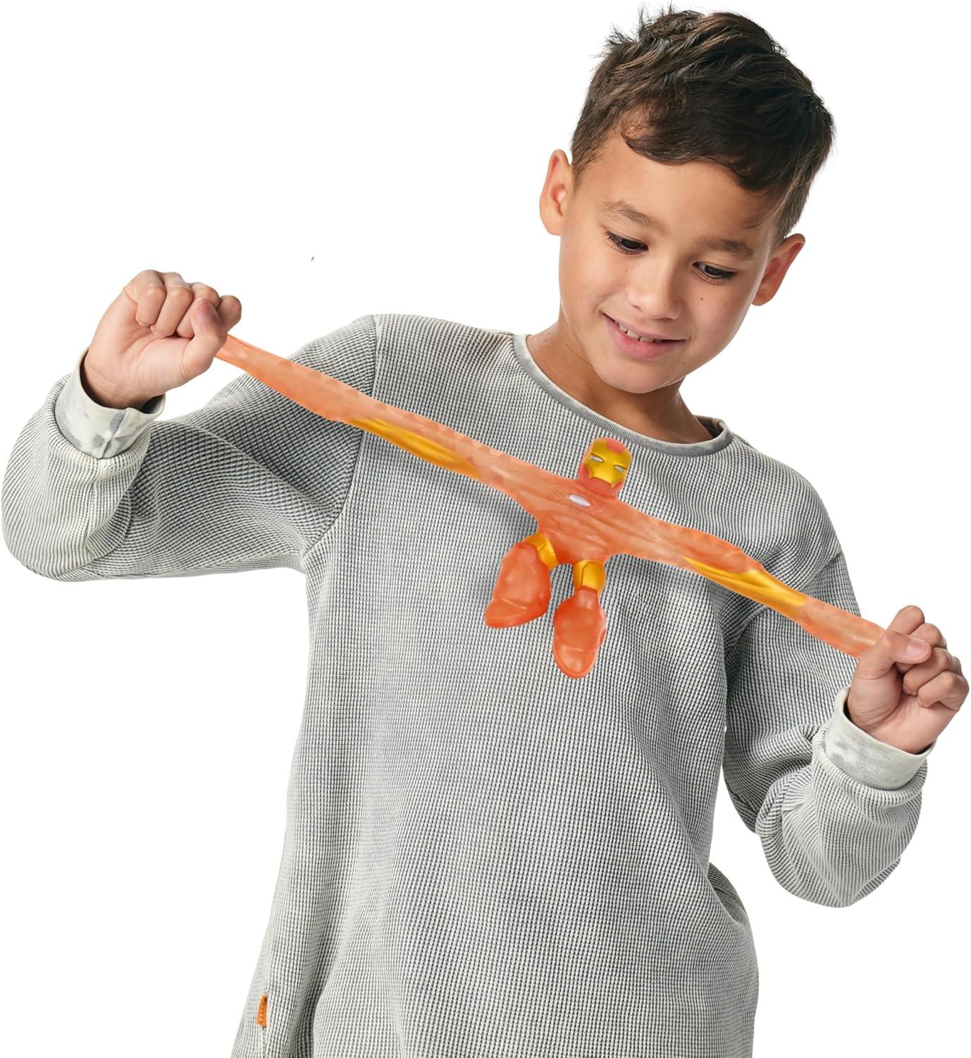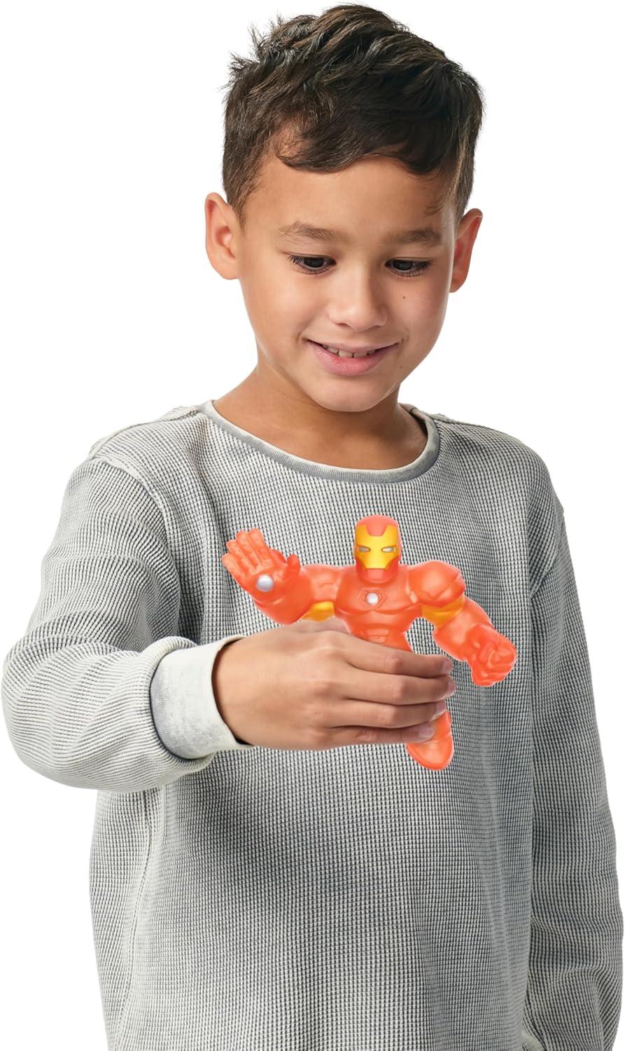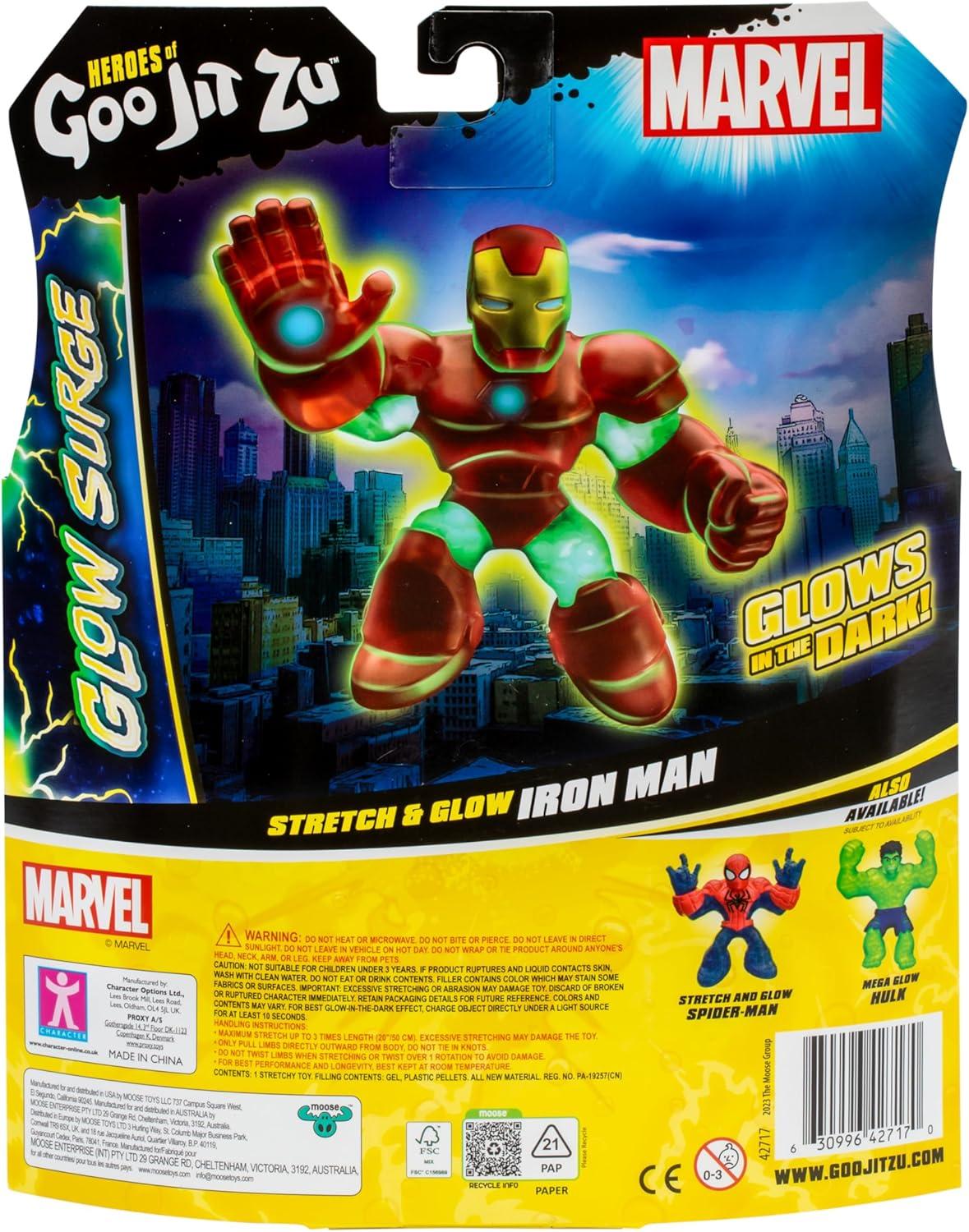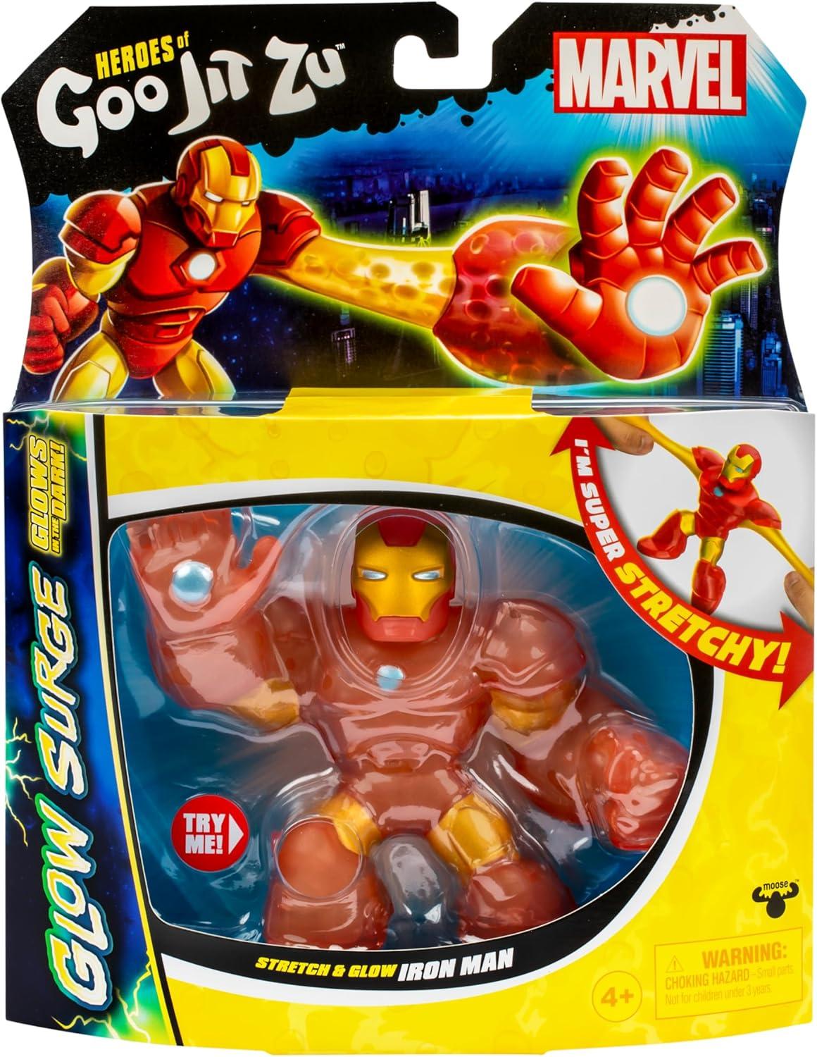 Marvel Superheroes and the Heroes of Goo Jit Zu have combined forces again to bring you the ultimate glowing, stretchiest Superheroes ever! Introducing Heroes of Goo Jit Zu GLOW SURGE! Now all your child's favorite Marvel Superheroes have the power to Glow-in-the-Dark! Stretch And Glow Iron Man has a unique goo filling that glows and has a scrunchy texture and feel. Kids can battle, play and fight through the night as they stretch and squeeze Stretch and Glow Iron Man's amazing glowing body. Collect all 4.5″ Marvel Heroes including the Stretch And Glow Spider-Man, Mega Glow Hulk and Stretch and Glow Iron Man! Play with your favorite Marvel heroes in a new GOOEY glowing way and with NO mess! Boys will love to squeeze, squish and stretch their arms, legs and bodies of these incredible toys! Their amazing stretchy bodies can stretch up to 3 times their size and then return to their original shape and size! Discover a new way to play and save the day with this cool collectible Glow Surge Stretch and Glow Iron Man Hero of Goo Jit Zu! Collect them all!