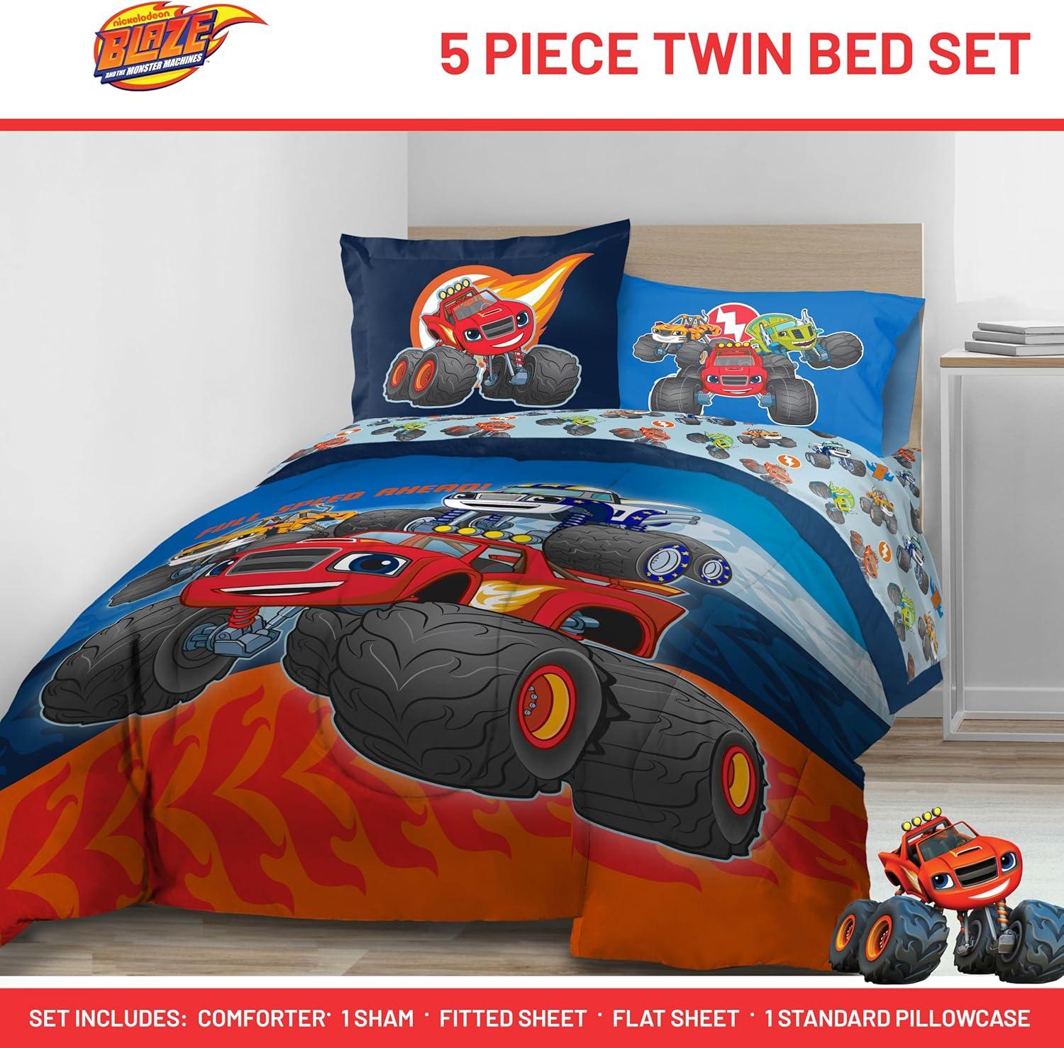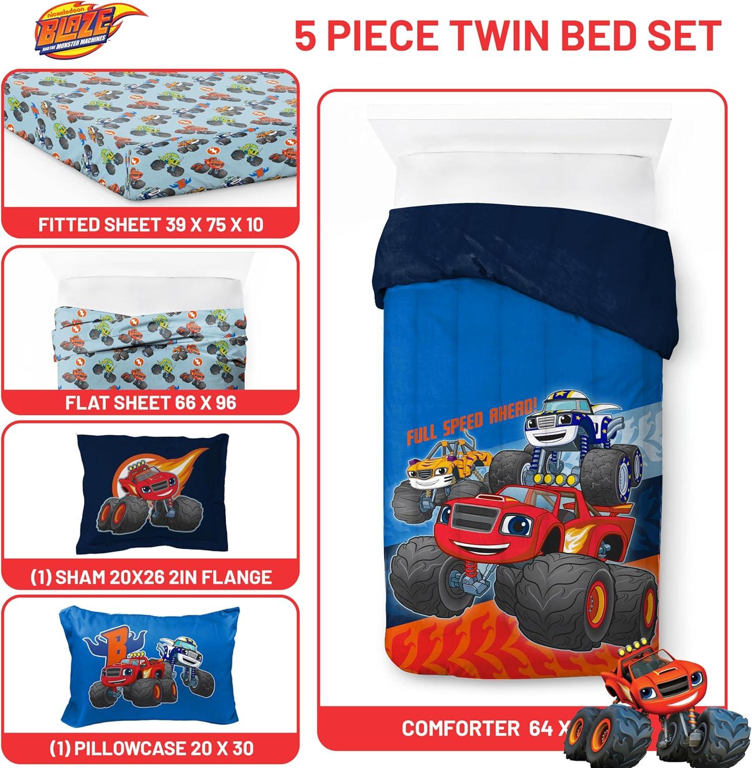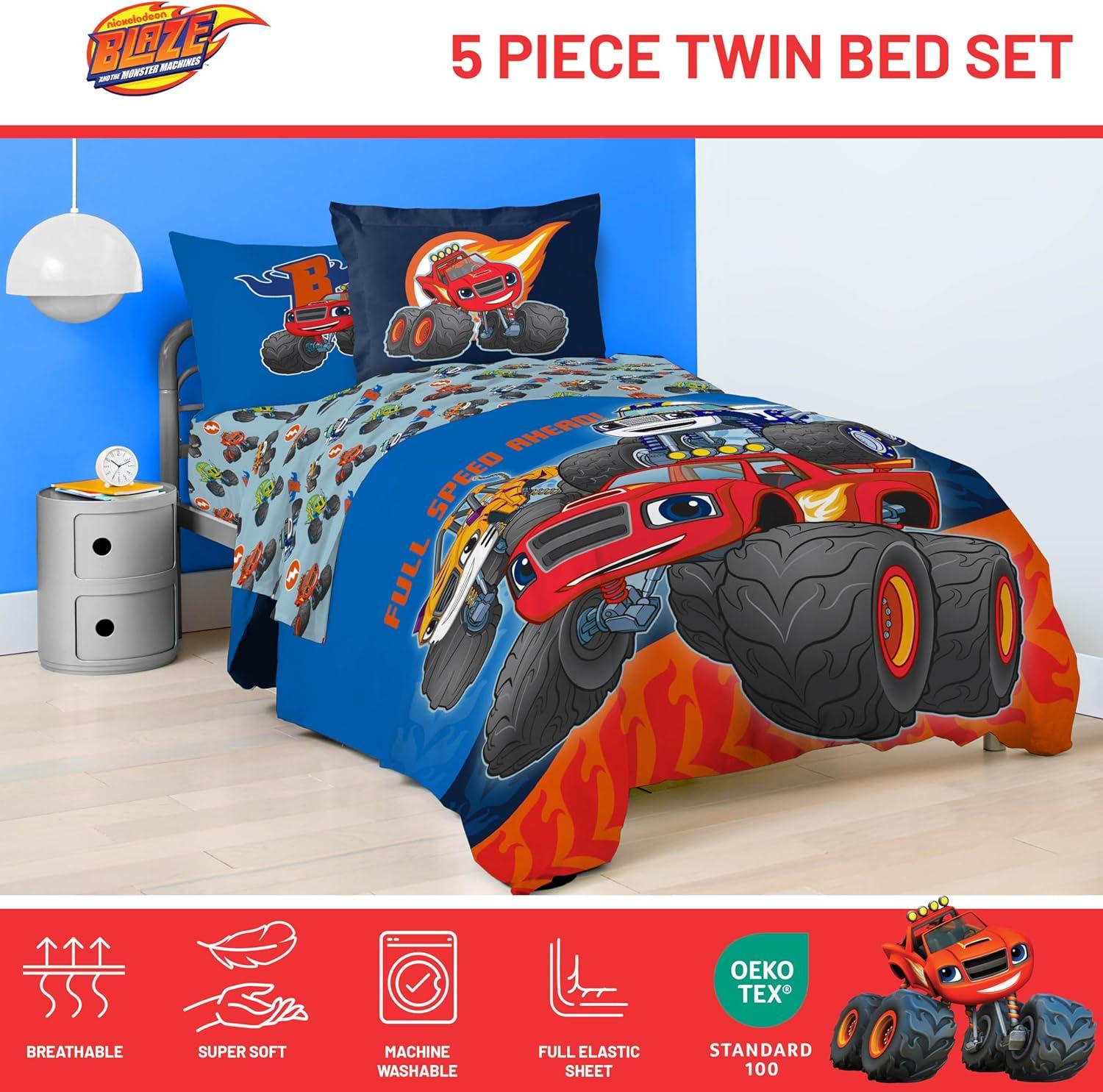 Jay Franco Comforter Set Includes Sheets and Pillow Covers - Soft and Cozy Bed Set for Stylish Room Decor, Blue - The Fantastic Four, 5 Piece Twin Size Bedding(Blue - Blaze & the Monster Machines)