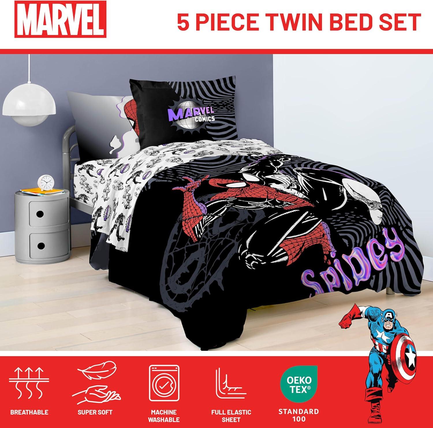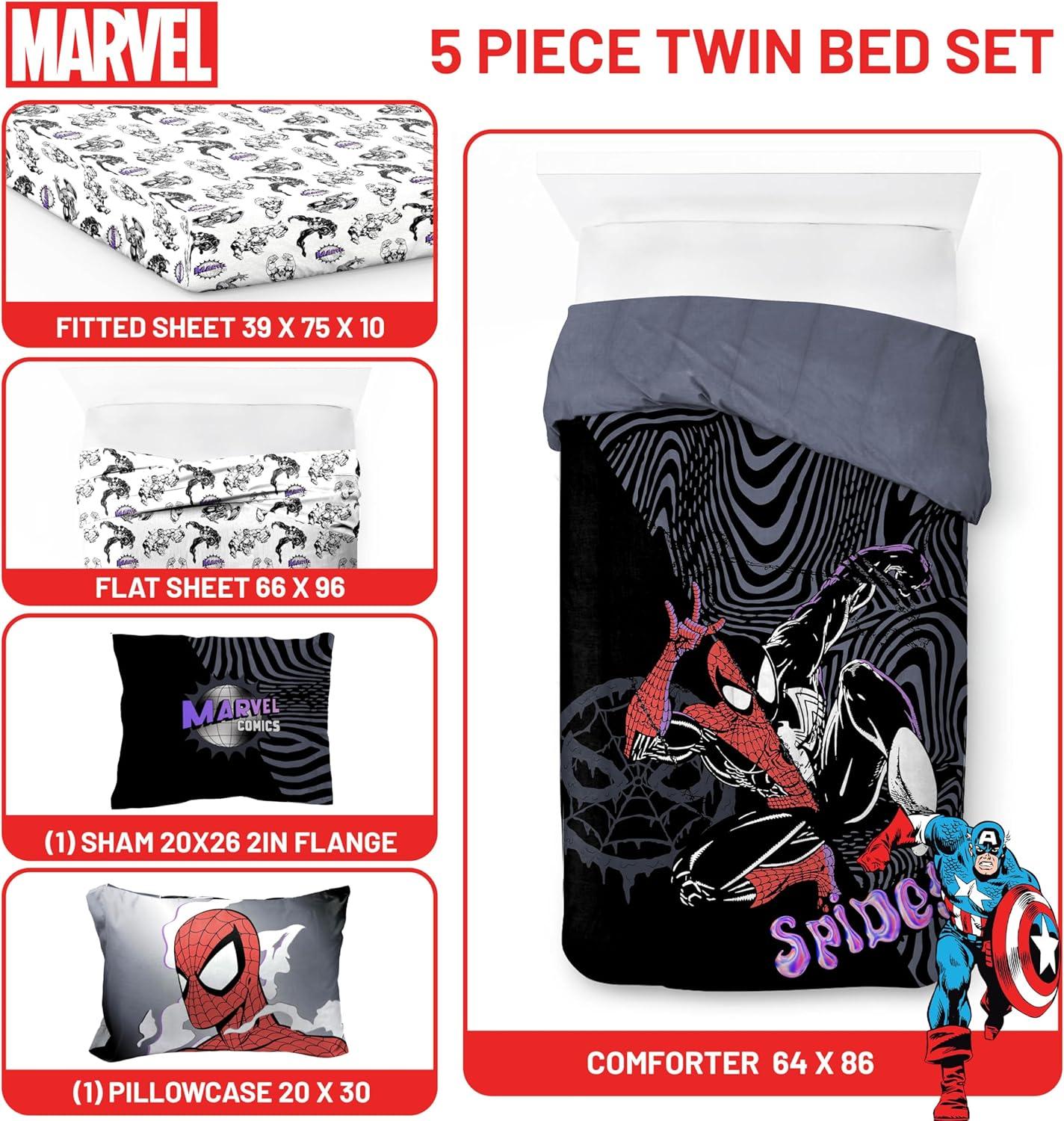 Transform your child's bedroom with our exciting 5-Piece Twin Bedding Set! This complete kids' bedding collection brings your favorite Spiderman, Hulk and Captain America characters to life, turning bedtime into an adventure. Our set includes a cozy comforter (64″ x 86″), a fitted sheet with 10″ deep pockets (39″ x 75″ x 10″), a flat sheet (66″ x 96″), a decorative pillow sham (20″ x 26″), and a standard pillowcase (20″ x 30″). Each piece is designed to create a comfortable and stylish sleep environment for your little one. Crafted from premium 100% brushed microfiber polyester, this bedding set offers the perfect blend of softness and durability. The breathable fabric ensures a restful night's sleep, helping your child wake up refreshed and ready for new adventures. Featuring vibrant designs with your favorite comic characters, this set sparks imagination and adds a playful touch to any children's room decor. Your child will love snuggling up with their favorite Marvel Avengers every night. Parents will appreciate the easy-care nature of this set. It's machine washable and long lasting, keeping the colorful designs looking great wash after wash. Simply machine wash in cold water and tumble dry on low heat. Perfect for everyday use, sleepovers, or as a thoughtful gift for birthdays and holidays. Suitable for both boys and girls, this versatile bedding set is more than just bedding – it's a ticket to dreamland adventures! Give your child the gift of magical nights and restful sleep with our Marvel Comics Twin Bedding Set. It's the ideal addition to any kid's room, combining comfort, style, and beloved characters in one fantastic package.