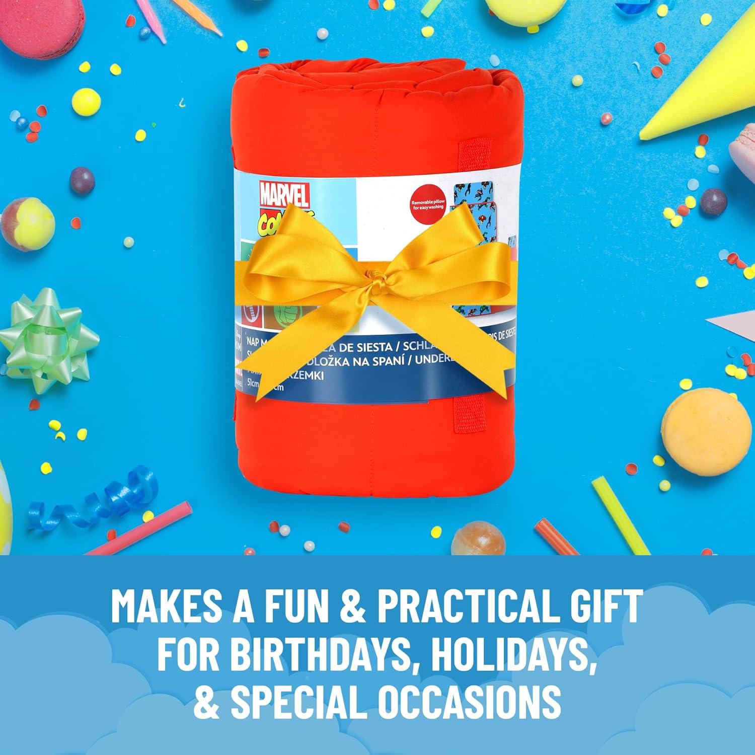 Make naptime effortless with the Marvel Comics Nap Mat, perfect for kids ages 3-5. This all-in-one sleeping mat features a soft built-in blanket (34 x 35 inches) and a cushioned, removable pillow (9.5 x 20 inches) for the ultimate comfort. With its cozy design and convenient removable pillow, it’s perfect for naps, sleepovers, and travel. Featuring vibrant Avengers Superheros like Hulk, Captain America, and all your favorites, it makes quiet time more fun while keeping your child warm and cozy.. Designed for convenience, this nap mat features a Velcro closure and carry handle, making it perfect for daycare, preschool, or travel. Designed with safety in mind, this nap mat has no zipper and includes a removable pillow insert. Plus, it's easy to clean—simply toss it in the washing machine! Customize your child's sleep mat by writing their name on the name plaque with a waterproof marker and say goodbye to nap time mix-ups! For indoor use only, this Marvel sleeping bag can be used on a bed, on the floor or on a small cot. Crafted from durable 100% polyester, this Avengers nap mat is a perfect gift for birthdays, holidays, or any occasion!