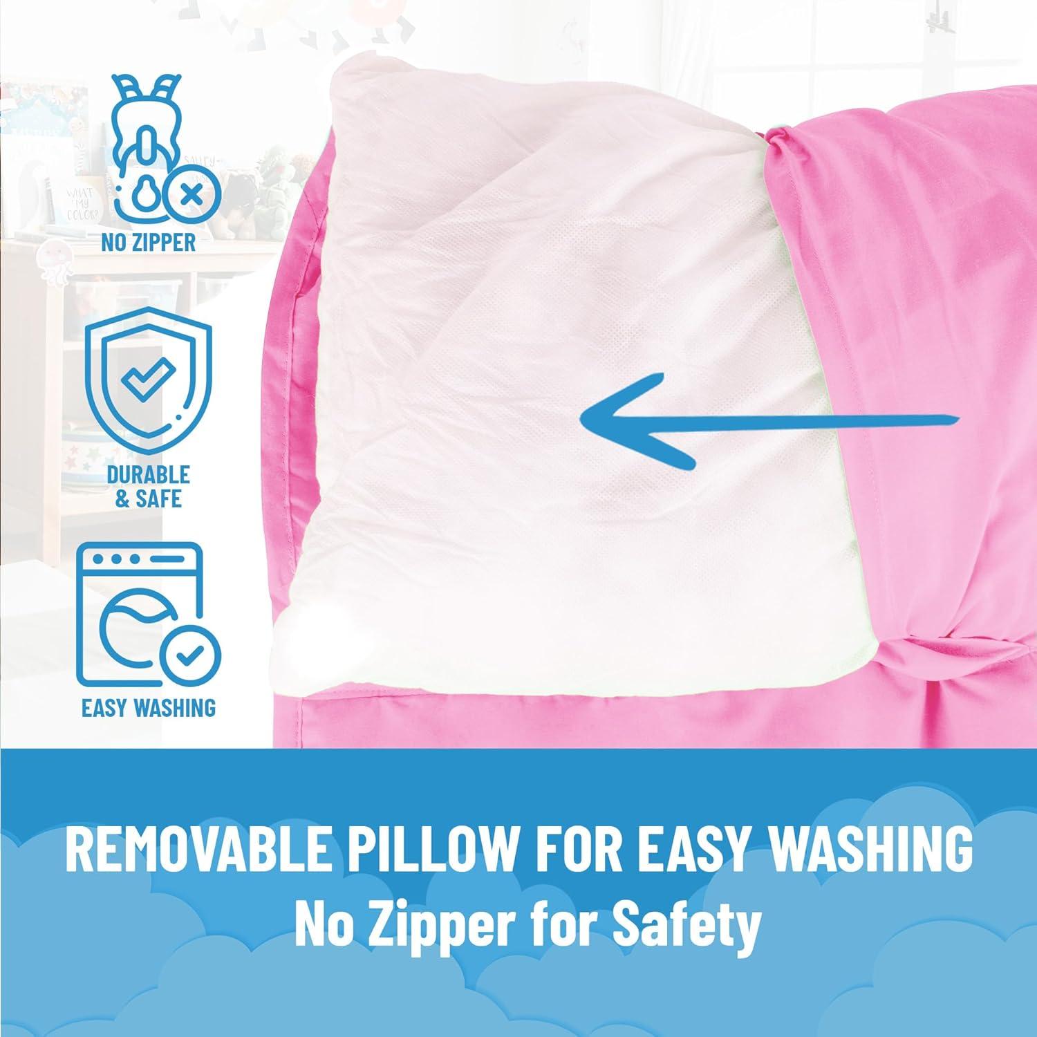 ALL-IN-ONE: Includes 46″ x 20″ sleeping surface with built-in 20″ x 9.5″ pillow and 35″ x 34″ blanket—ideal size for toddlers and young children.