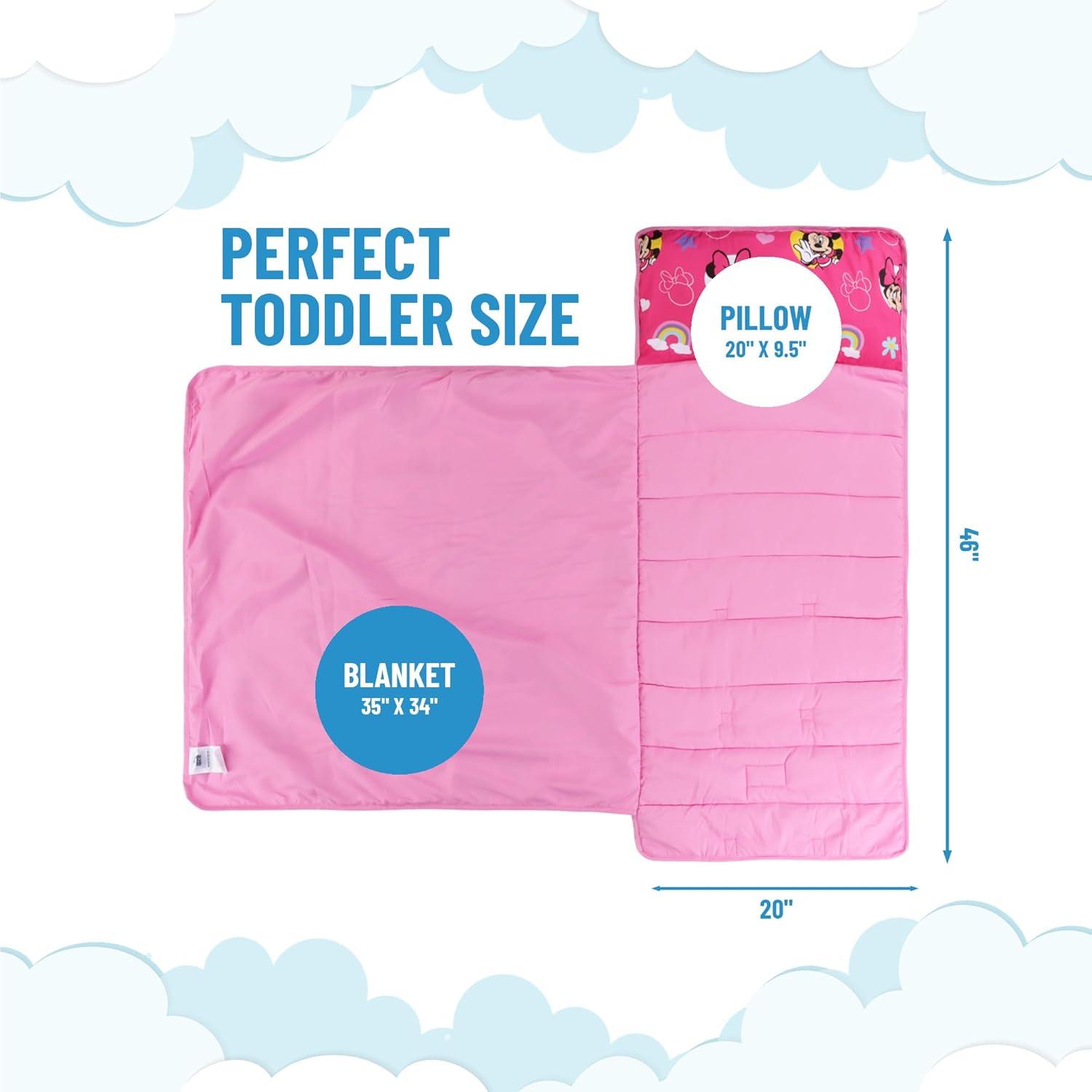Jay Franco Kids Nap Mat with Embedded Pillow & Blanket – Soft 46"x20" Microfiber Sleeping Bag with Name Tag & Handle for School, Travel, Sleepover, Blue - Marvel Comics(Pink - Minnie Mouse)