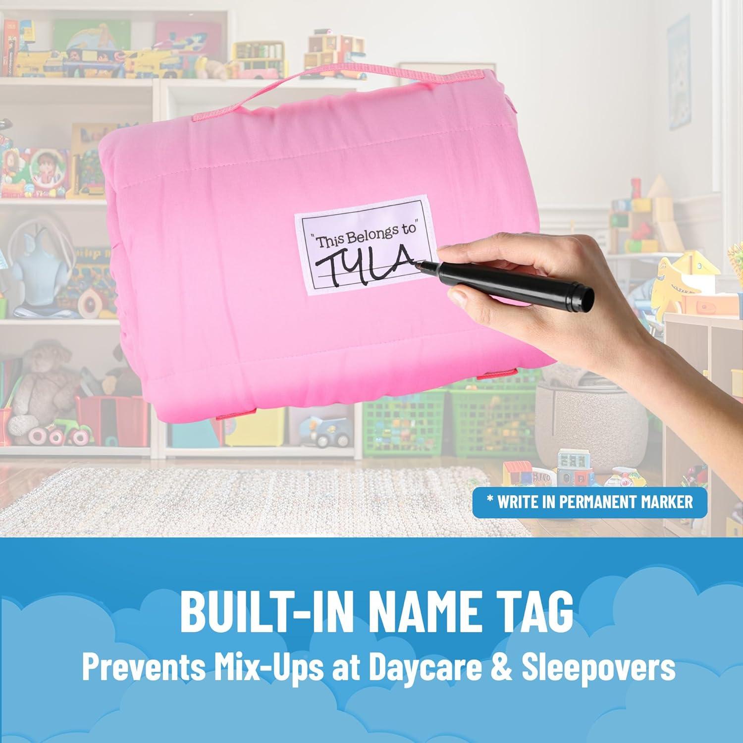 Jay Franco Kids Nap Mat with Embedded Pillow & Blanket – Soft 46″x20″ Microfiber Sleeping Bag with Name Tag & Handle for School, Travel, Sleepover, Blue – Marvel Comics(Pink – Disney Princess)