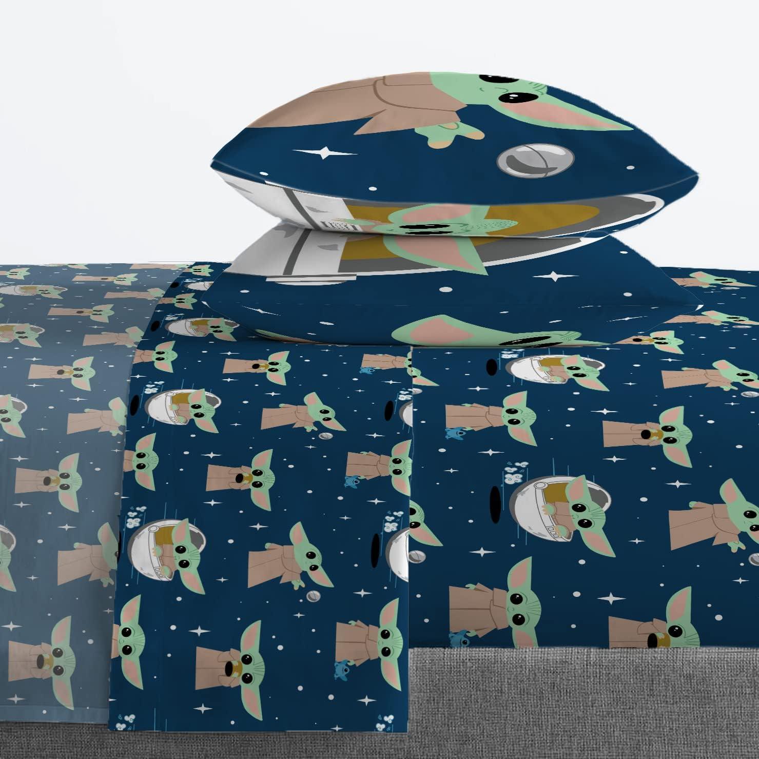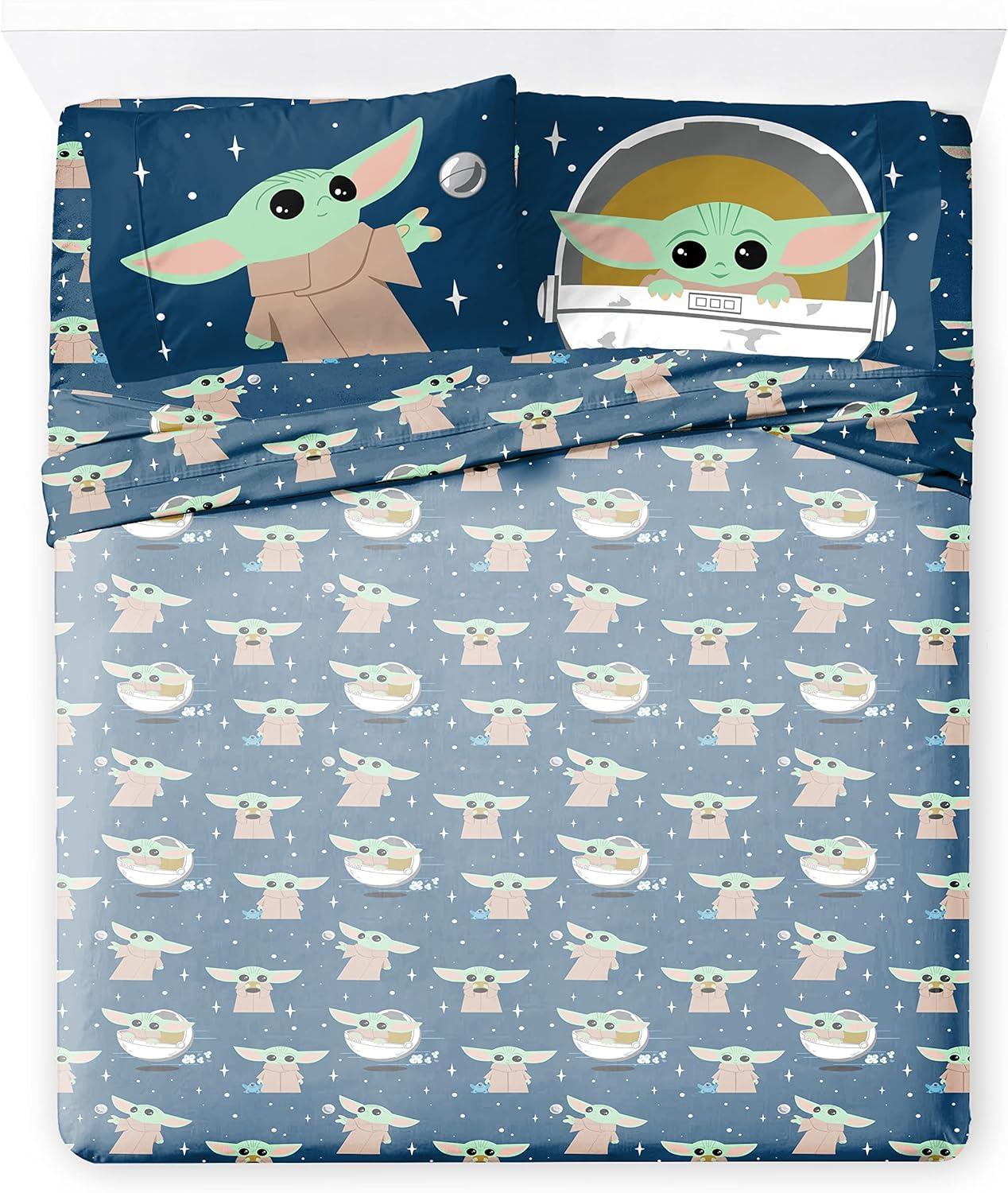 Jay Franco Kids Sheet Set with Fitted, Flat Sheets & Pillow Cover - Ultra-Soft Bedding with Pillowcase for Room Decor, White - Avengers, 4 Piece Queen(Blue - Mandalorian)