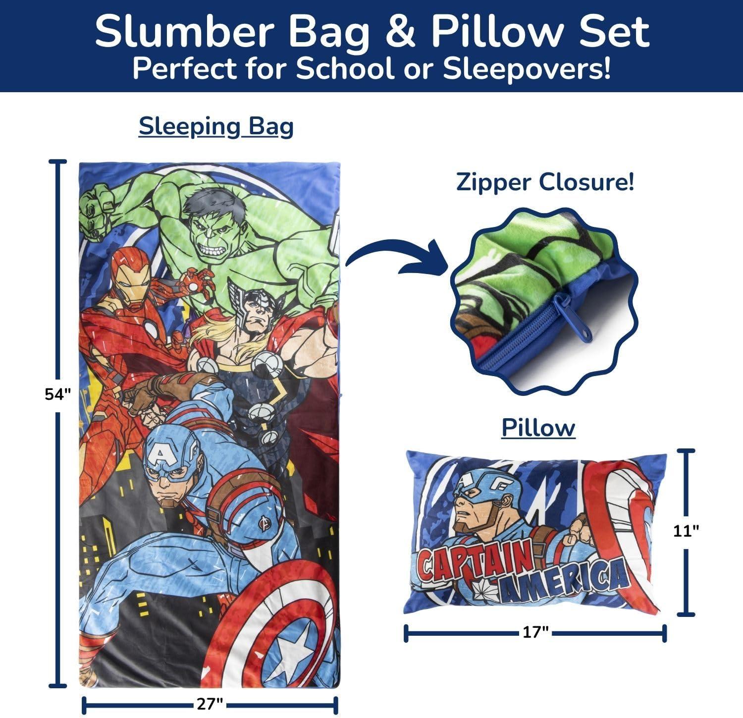 Jay Franco Kids Slumber Bag and Pillow - 54 x 27 Inch Comfy Indoor Sleeping Bag for School and Sleepovers, 2 Piece Set, Blue - Spiderman(Blue - Avengers)