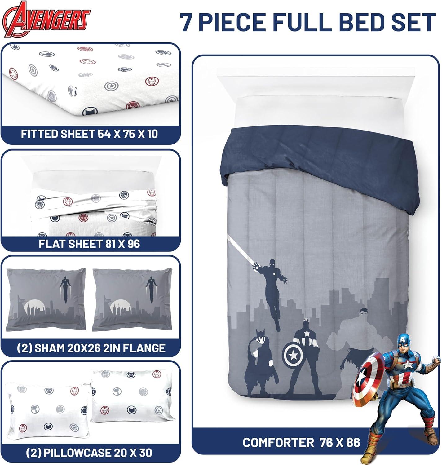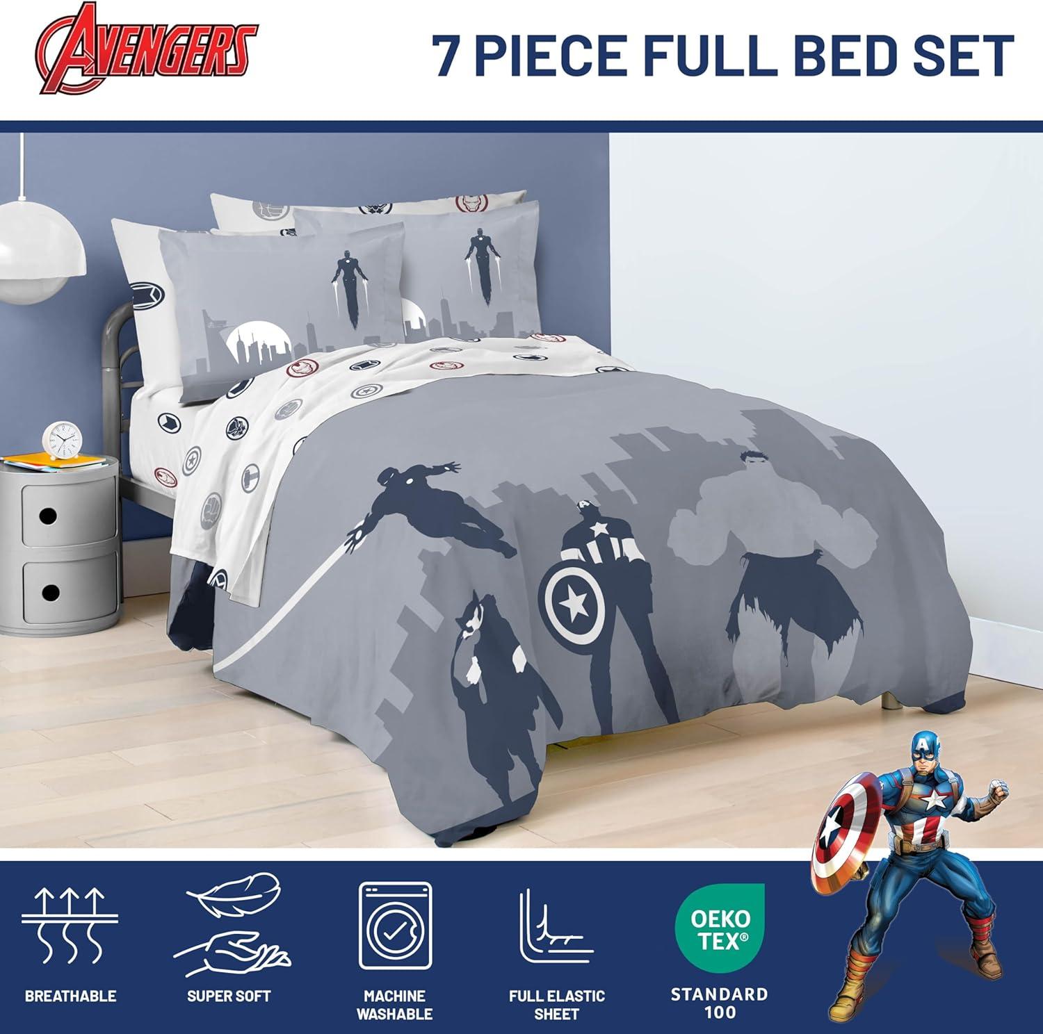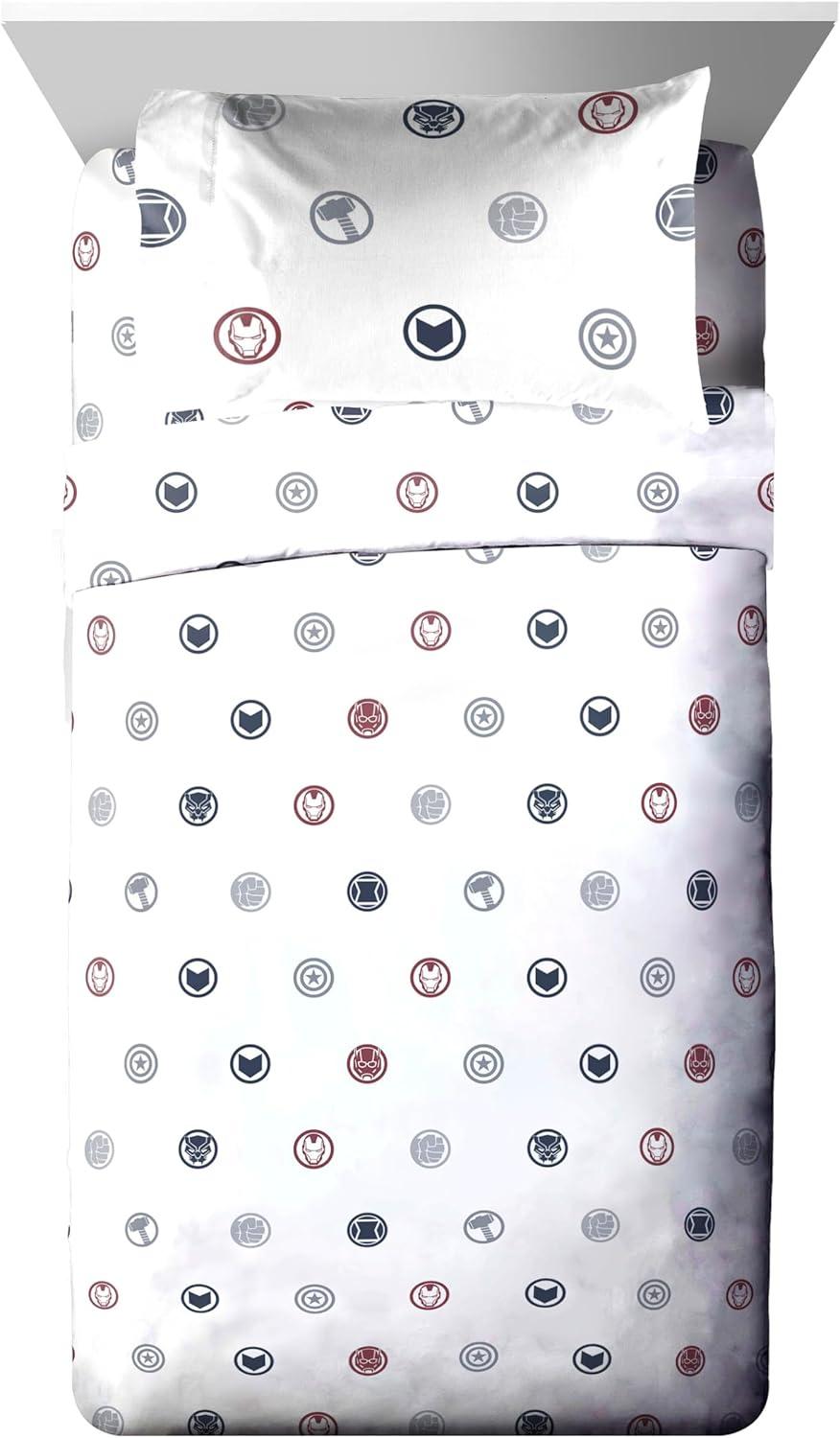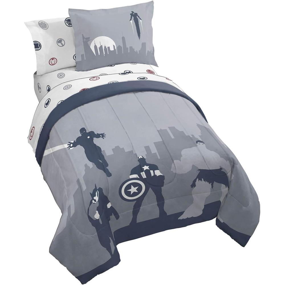Transform your child's bedroom with our exciting 5-Piece Twin Bedding Set! This complete bedding collection brings favorite Avengers to life, turning bedtime into an adventure. Our set includes a cozy comforter (64″ x 86″), a fitted sheet with 10″ deep pockets (39″ x 75″ x 10″), a flat sheet (66″ x 96″), a decorative pillow sham (20″ x 26″), and a standard pillowcase (20″ x 30″). Each piece is designed to create a comfortable and stylish sleep environment for your loved one. Crafted from premium 100% brushed microfiber polyester, this bedding set offers the perfect blend of softness and durability. The breathable fabric ensures a restful night's sleep, helping you wake up refreshed and ready for new adventures. Featuring vibrant designs with Captain America, Hulk, Thor and Iron Man, this set sparks imagination and adds a playful touch to any room decor. You will love snuggling up with your favorite friends every night. Parents will appreciate the easy-care nature of this set. It's machine washable and long lasting, keeping the colorful designs looking great wash after wash. Simply machine wash in cold water and tumble dry on low heat. Perfect for everyday use, sleepovers, or as a thoughtful gift for birthdays and holidays. Suitable for both boys and girls, this versatile bedding set is more than just bedding – it's a ticket to dreamland adventures! Give your loved one the gift of magical nights and restful sleep with our Avengers Twin Bedding Set. It's the ideal addition to any room, combining comfort, style, and beloved superheroes in one fantastic package.