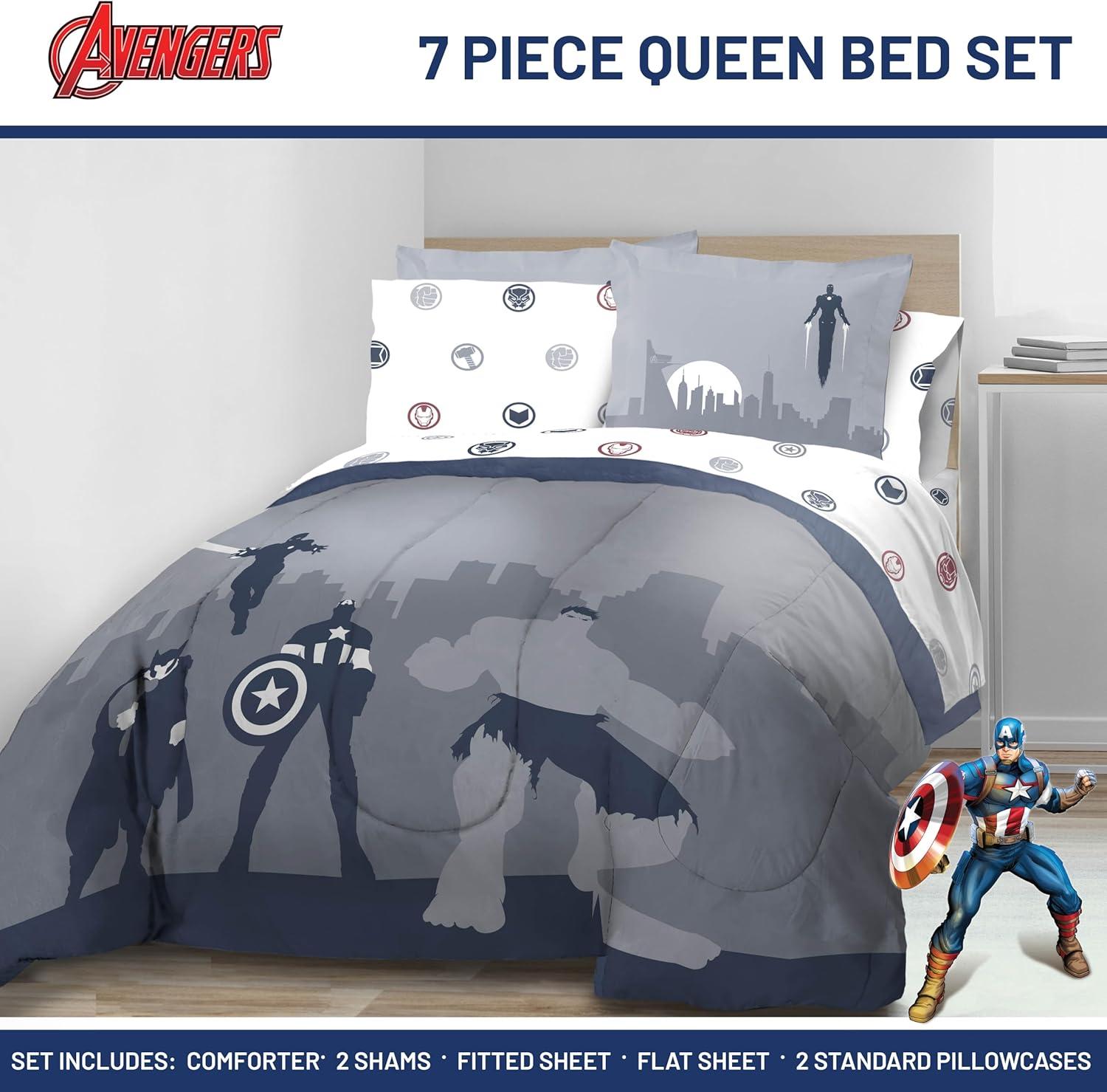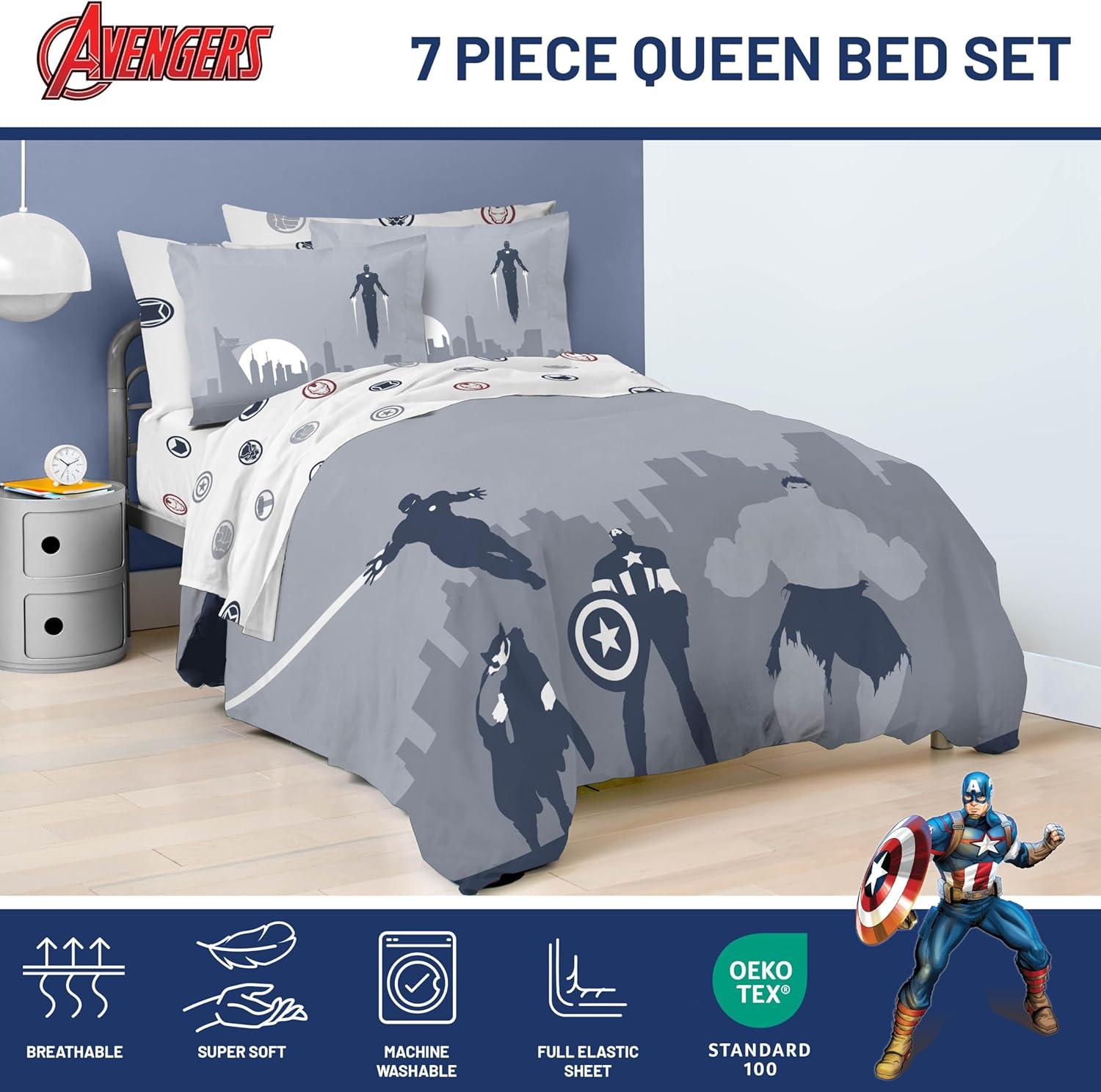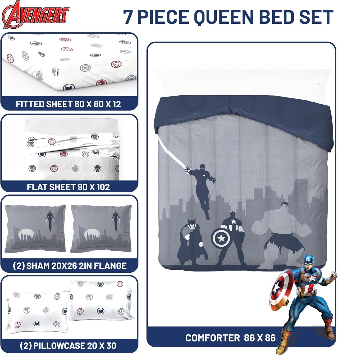 Transform your child's bedroom with our exciting 5-Piece Twin Bedding Set! This complete bedding collection brings favorite Avengers to life, turning bedtime into an adventure. Our set includes a cozy comforter (64″ x 86″), a fitted sheet with 10″ deep pockets (39″ x 75″ x 10″), a flat sheet (66″ x 96″), a decorative pillow sham (20″ x 26″), and a standard pillowcase (20″ x 30″). Each piece is designed to create a comfortable and stylish sleep environment for your loved one. Crafted from premium 100% brushed microfiber polyester, this bedding set offers the perfect blend of softness and durability. The breathable fabric ensures a restful night's sleep, helping you wake up refreshed and ready for new adventures. Featuring vibrant designs with Captain America, Hulk, Thor and Iron Man, this set sparks imagination and adds a playful touch to any room decor. You will love snuggling up with your favorite friends every night. Parents will appreciate the easy-care nature of this set. It's machine washable and long lasting, keeping the colorful designs looking great wash after wash. Simply machine wash in cold water and tumble dry on low heat. Perfect for everyday use, sleepovers, or as a thoughtful gift for birthdays and holidays. Suitable for both boys and girls, this versatile bedding set is more than just bedding – it's a ticket to dreamland adventures! Give your loved one the gift of magical nights and restful sleep with our Avengers Twin Bedding Set. It's the ideal addition to any room, combining comfort, style, and beloved superheroes in one fantastic package.