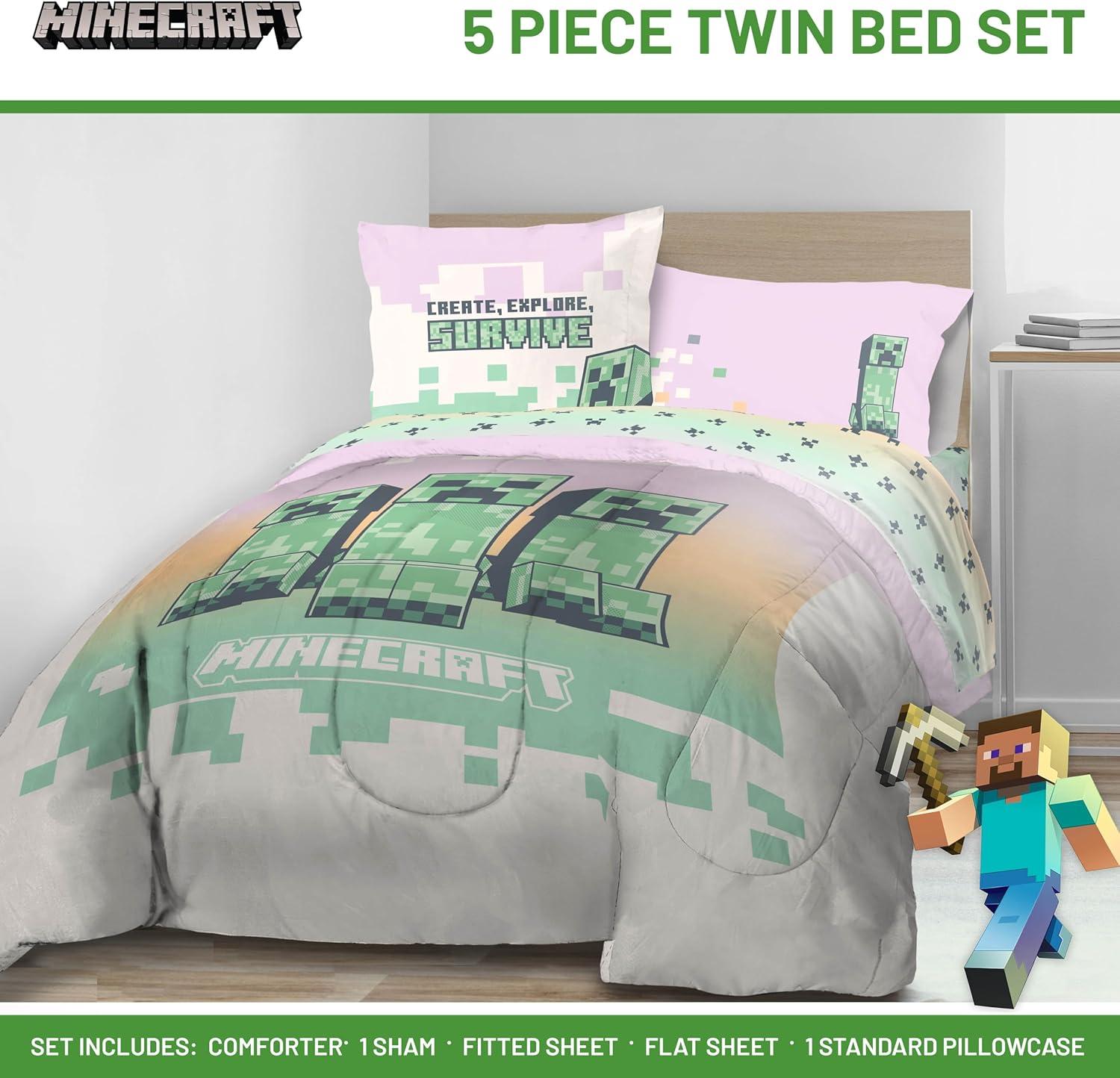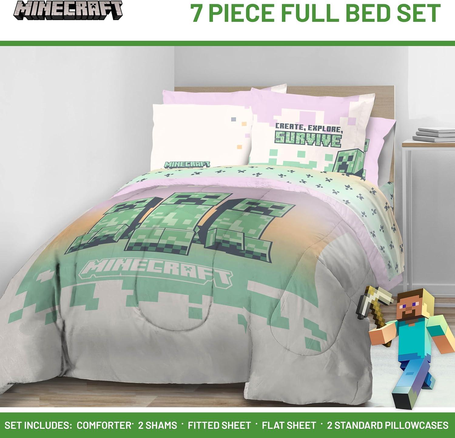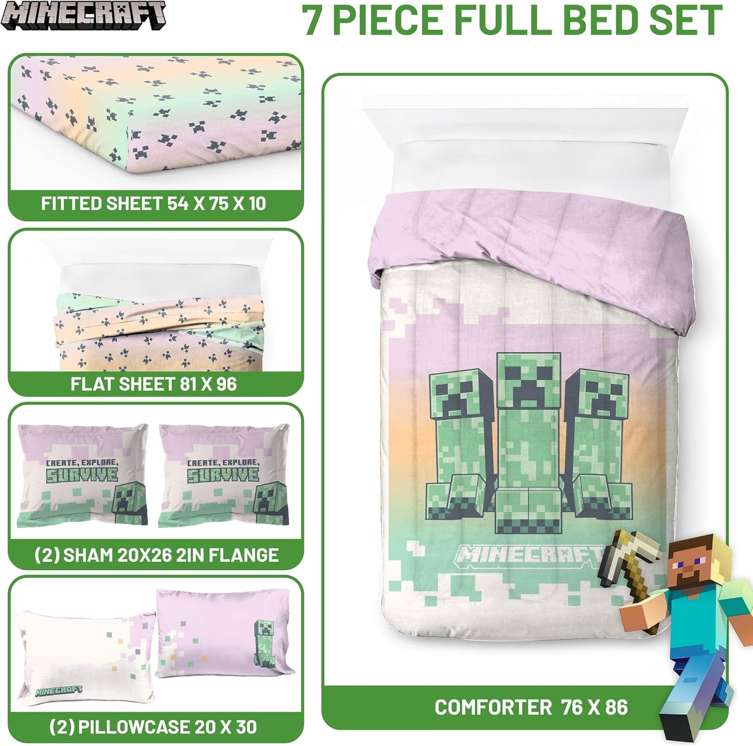 Jay Franco Marvel Deadpool Queen Size Comforter Set - 7 Piece Bedding Includes Sheet Set and Pillow Covers - Gray and Red Super Soft Cozy Bedding(Pink - Minecraft 01)