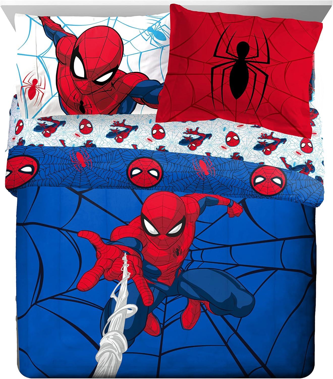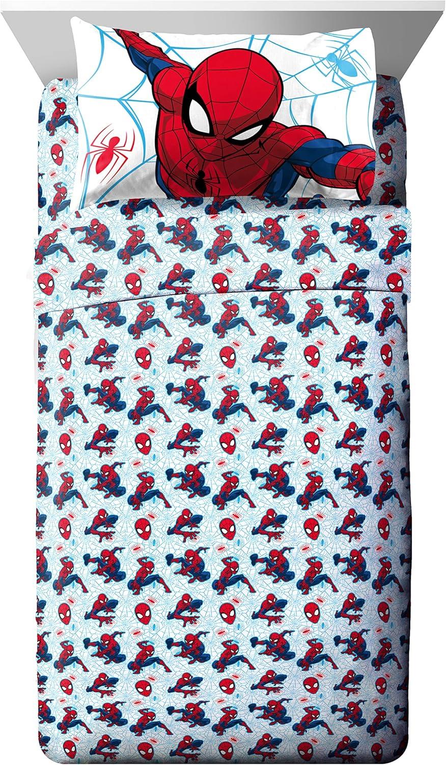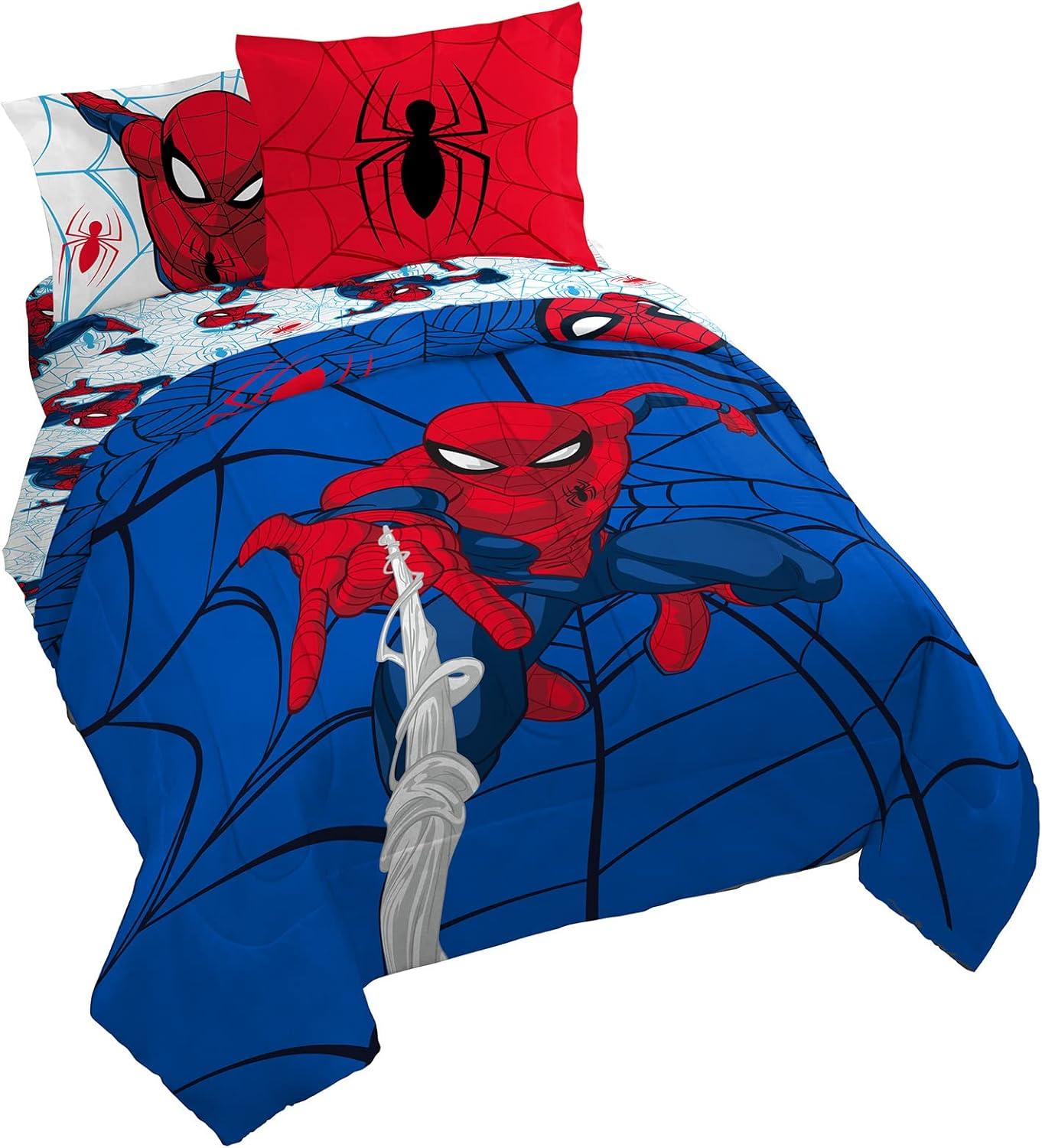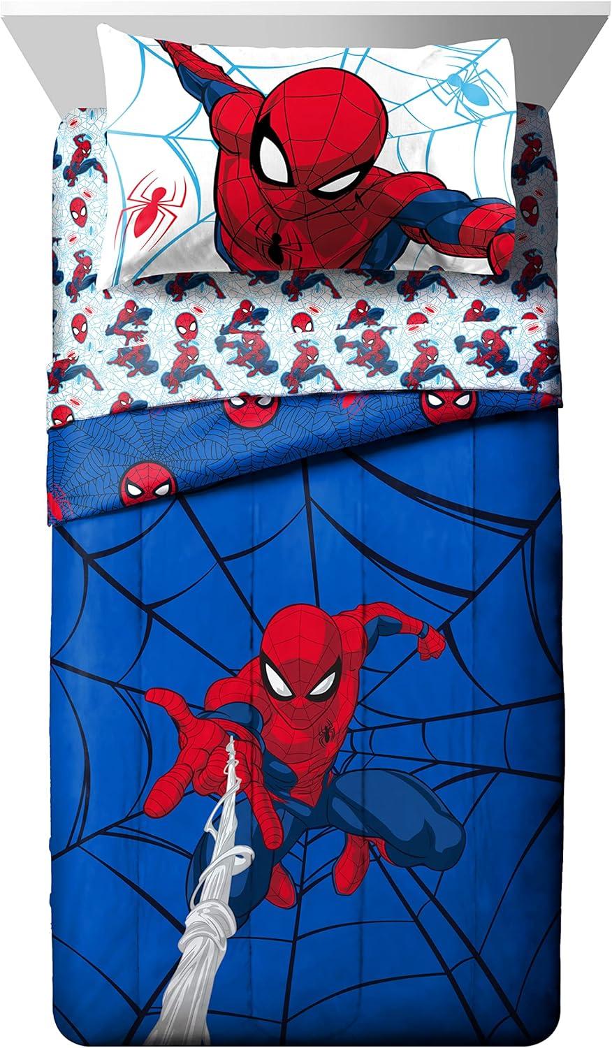 PERFECT FIT & FUN DESIGN – Twin bed set includes (1) 64 x 86 inch twin comforter, (1) 39 x 75 inch fitted sheet, (1) 66 x 96 inch flat sheet, (1) 20 x 30 inch standard pillowcase, and (1) 20 x 26 inch sham. Add a touch of decorative enchantment to your room with our fashionable and super soft Spiderman bed set.