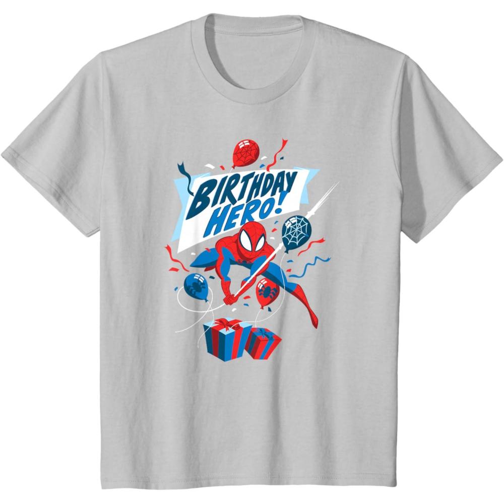 Have an amazing birthday wearing this Spider-Man birthday tee that showcases Spidey swinging through the festivities in heroic style. Perfect for Super Hero fans and birthday fun, this Marvel tee is fit for an action-packed celebration. Available in youth and adult sizes. Find it in a t-shirt, premium t-shirt, tank top, v-neck, long sleeve tee, hoodie, and sweatshirt.