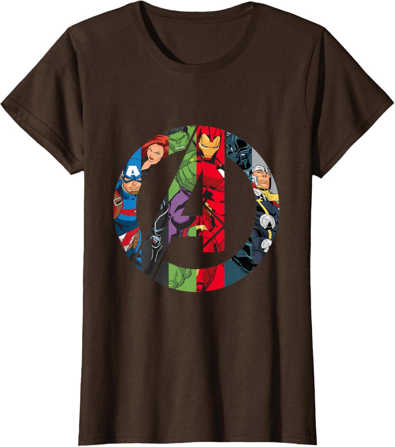 The Avengers come together on this awesome “A” logo graphic tee shirt. Captain America, Black Widow, Hulk, Iron Man, Black Panther, and Thor are illustrated inside the Avengers logo in their classic comic style. This cool t-shirt is sure to add some Super Hero power to your wardrobe.