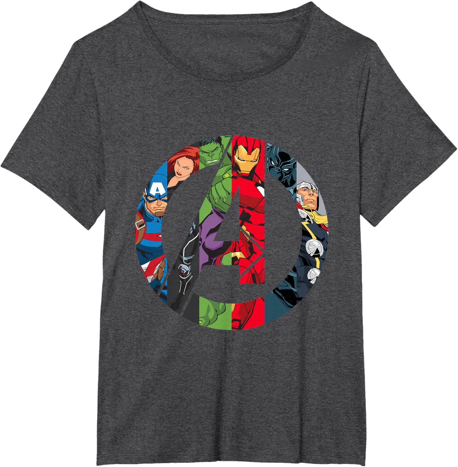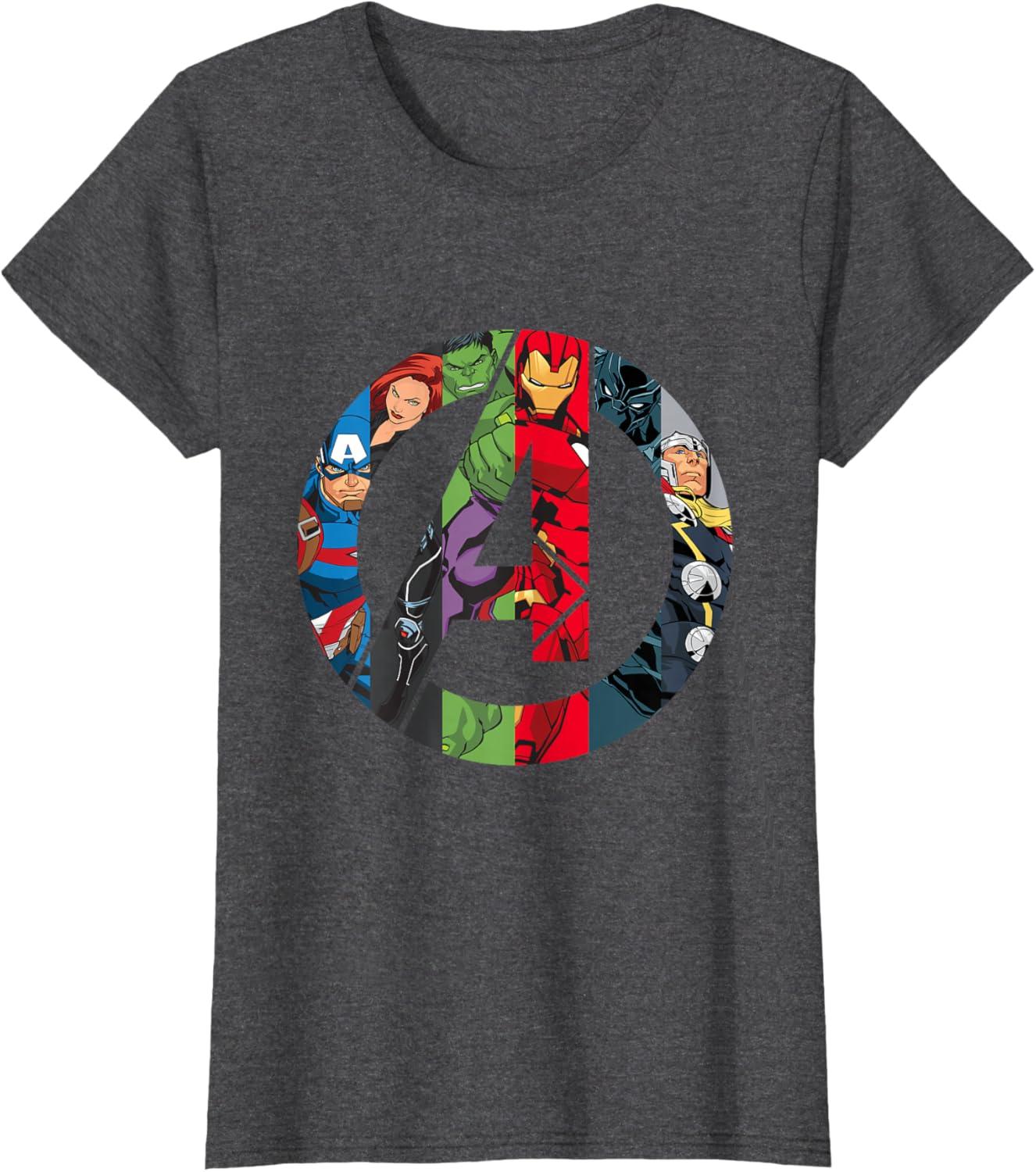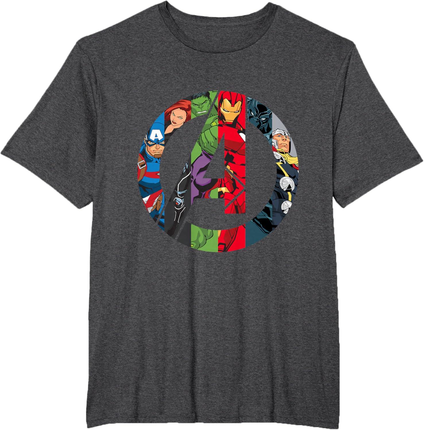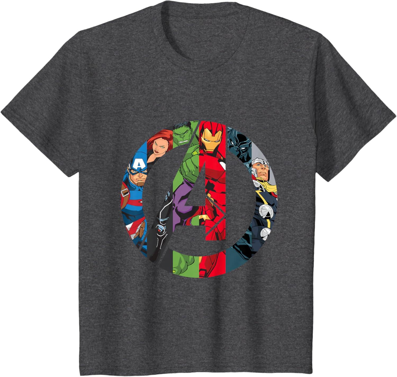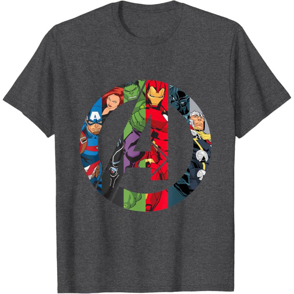 The Avengers come together on this awesome “A” logo graphic tee shirt. Captain America, Black Widow, Hulk, Iron Man, Black Panther, and Thor are illustrated inside the Avengers logo in their classic comic style. This cool t-shirt is sure to add some Super Hero power to your wardrobe.