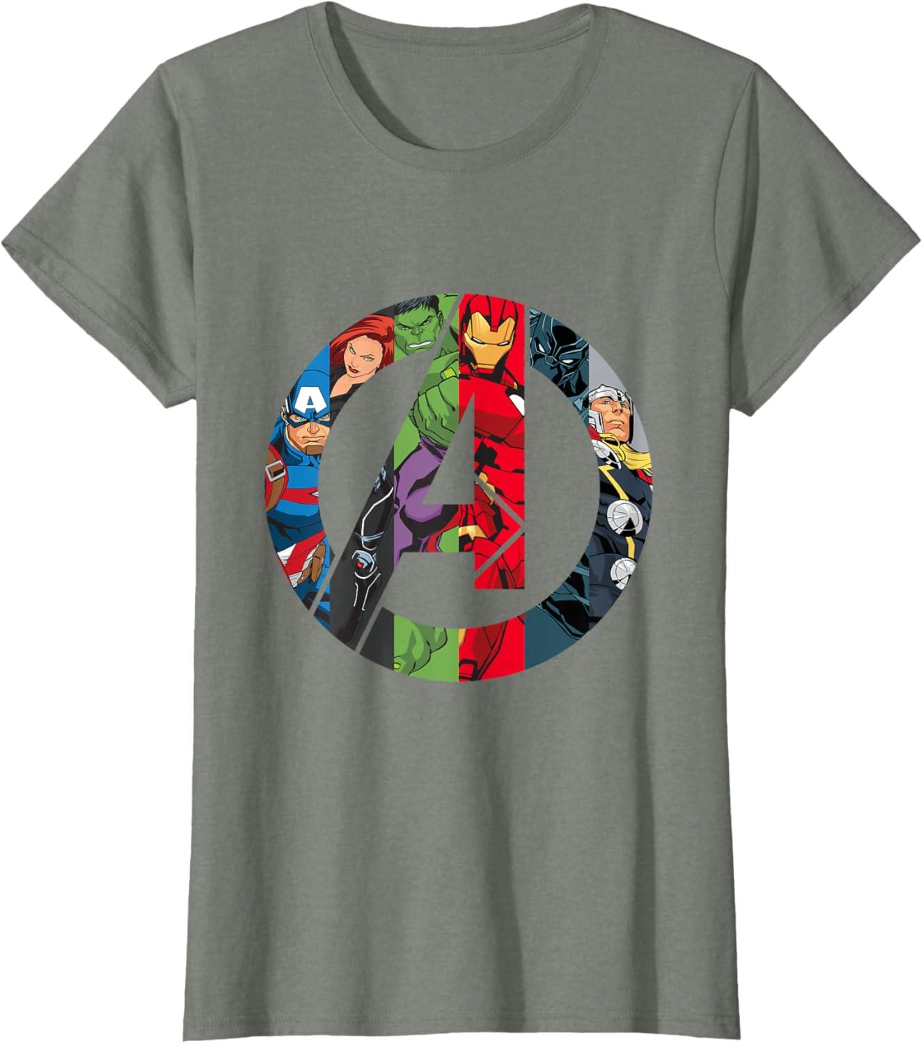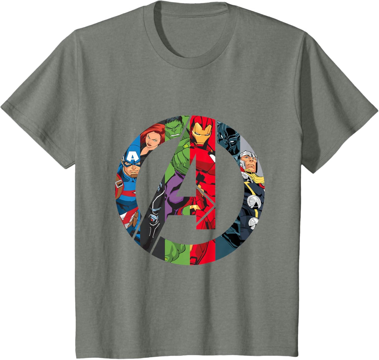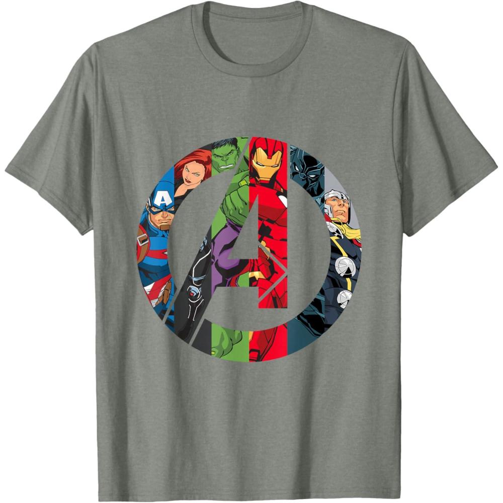 The Avengers come together on this awesome “A” logo graphic tee shirt. Captain America, Black Widow, Hulk, Iron Man, Black Panther, and Thor are illustrated inside the Avengers logo in their classic comic style. This cool t-shirt is sure to add some Super Hero power to your wardrobe.