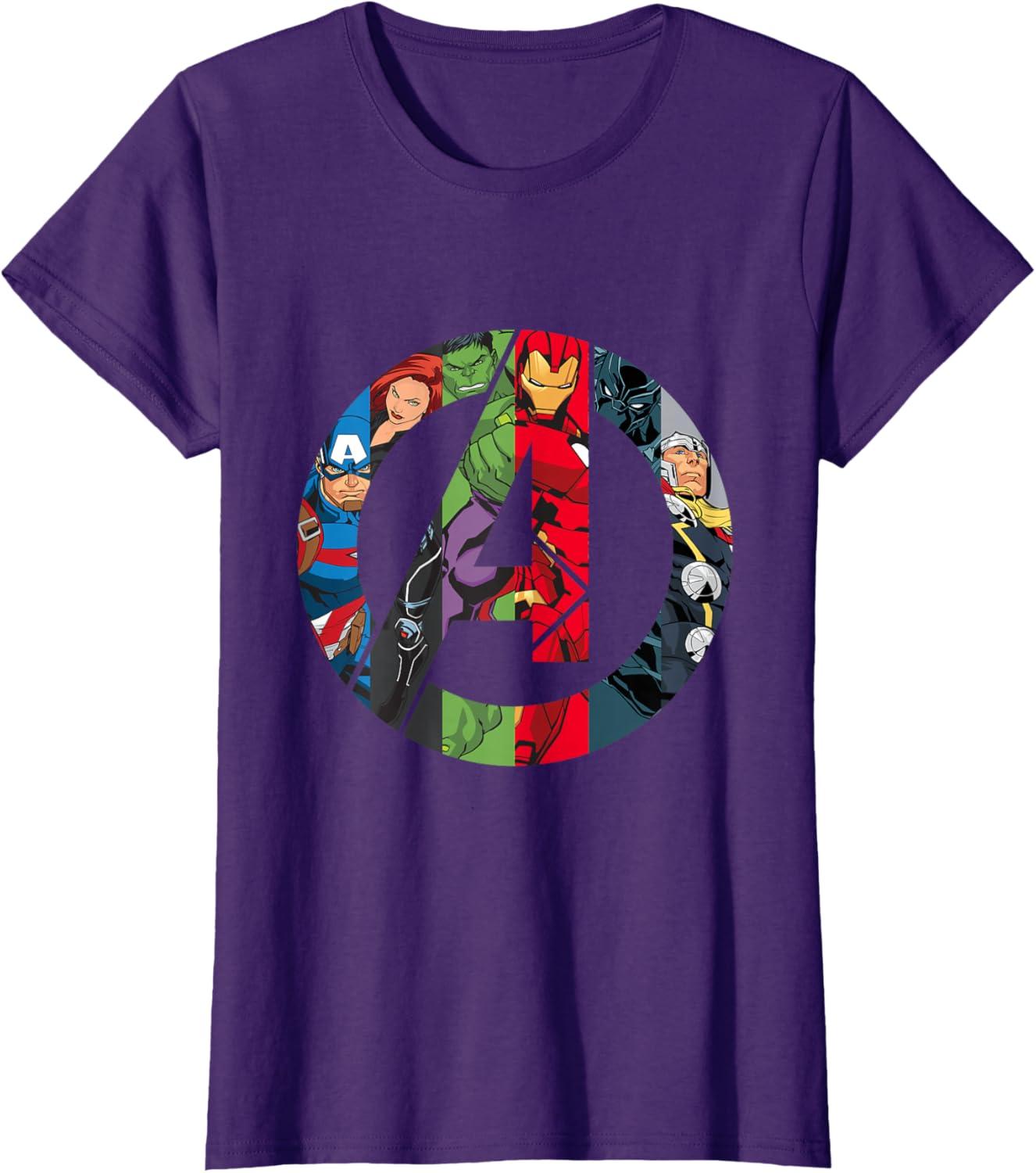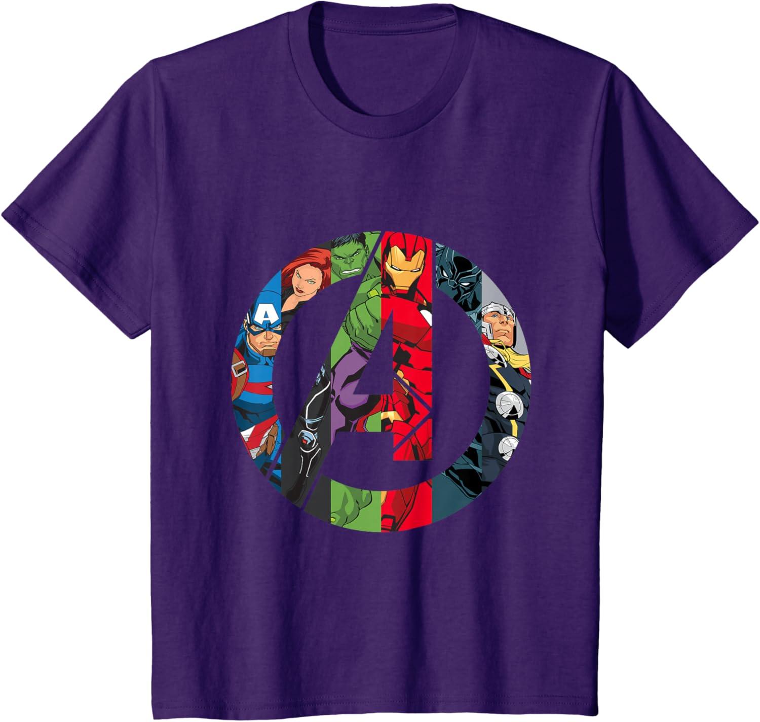 The Avengers come together on this awesome “A” logo graphic tee shirt. Captain America, Black Widow, Hulk, Iron Man, Black Panther, and Thor are illustrated inside the Avengers logo in their classic comic style. This cool t-shirt is sure to add some Super Hero power to your wardrobe.