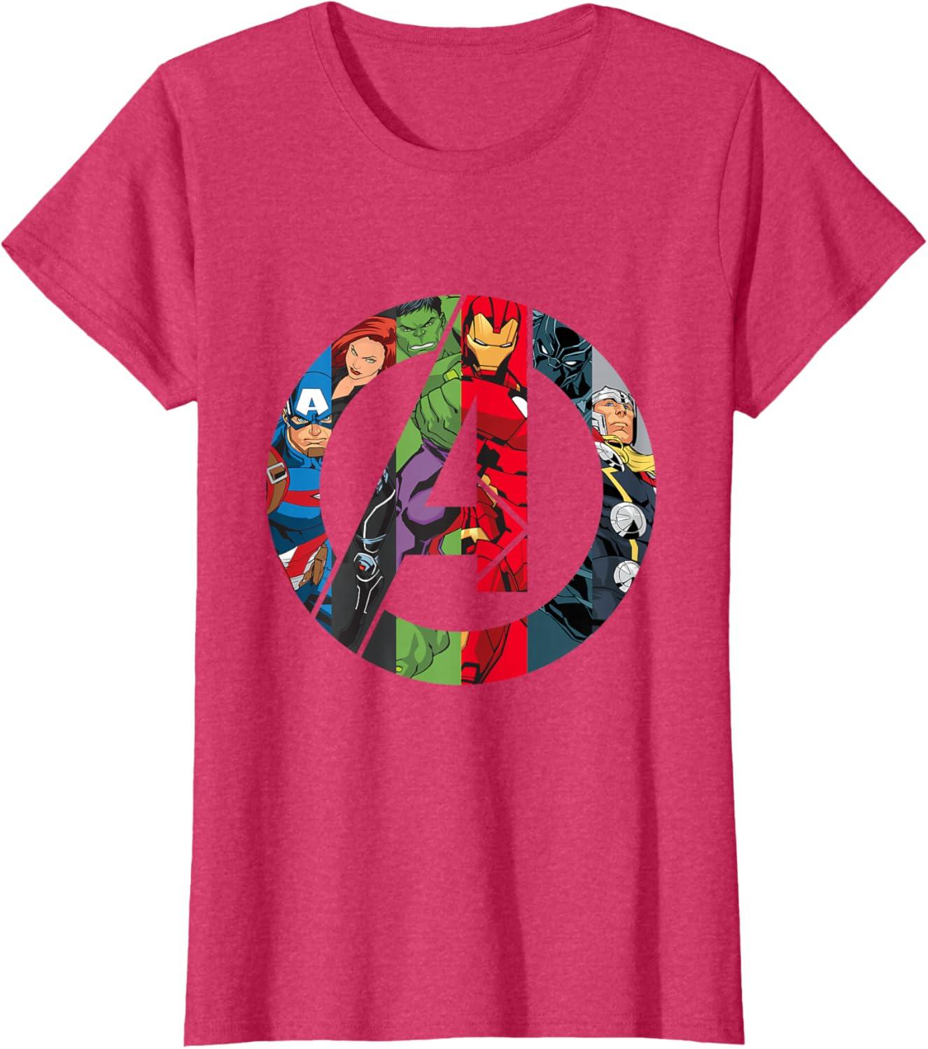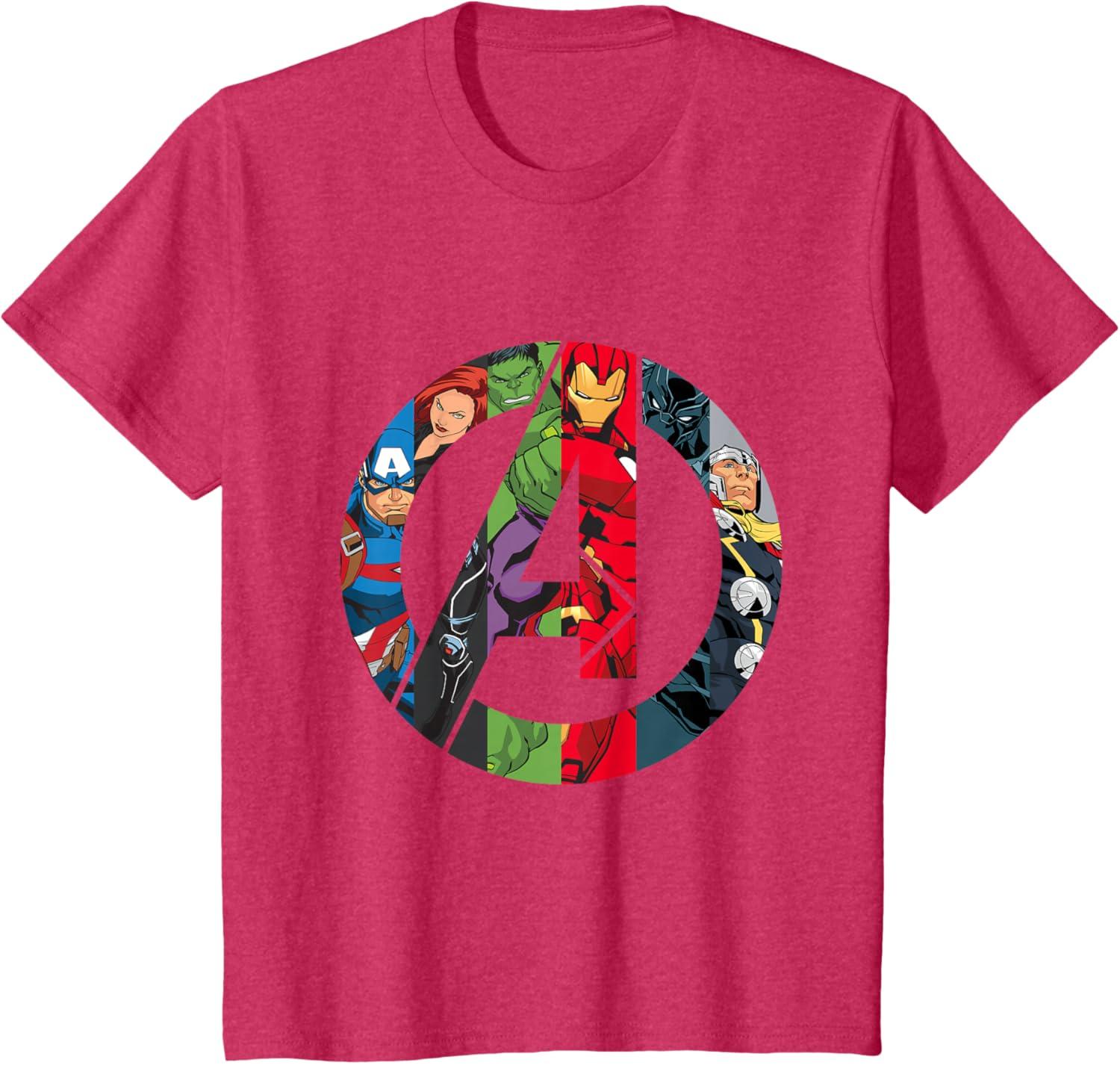 The Avengers come together on this awesome “A” logo graphic tee shirt. Captain America, Black Widow, Hulk, Iron Man, Black Panther, and Thor are illustrated inside the Avengers logo in their classic comic style. This cool t-shirt is sure to add some Super Hero power to your wardrobe.