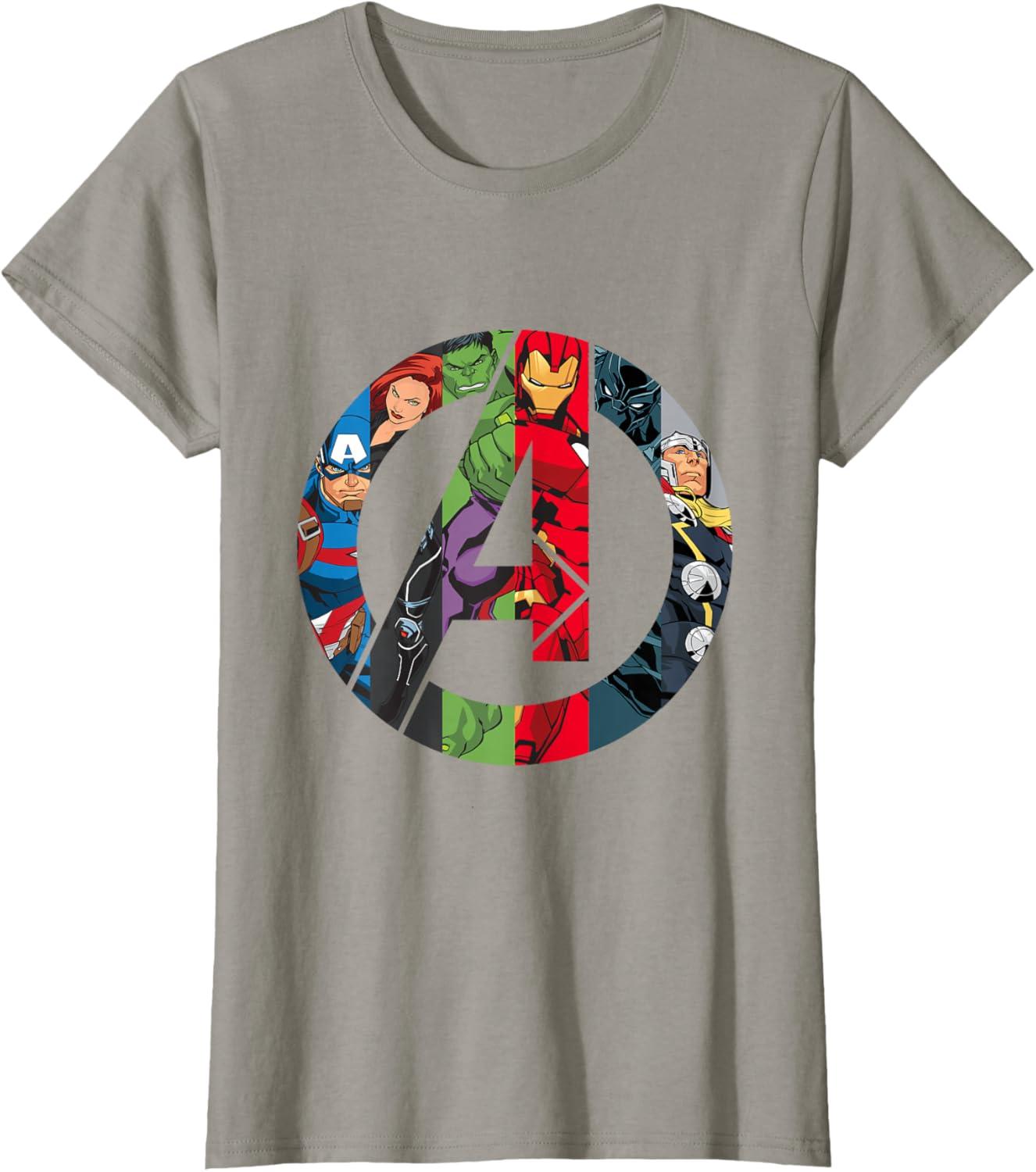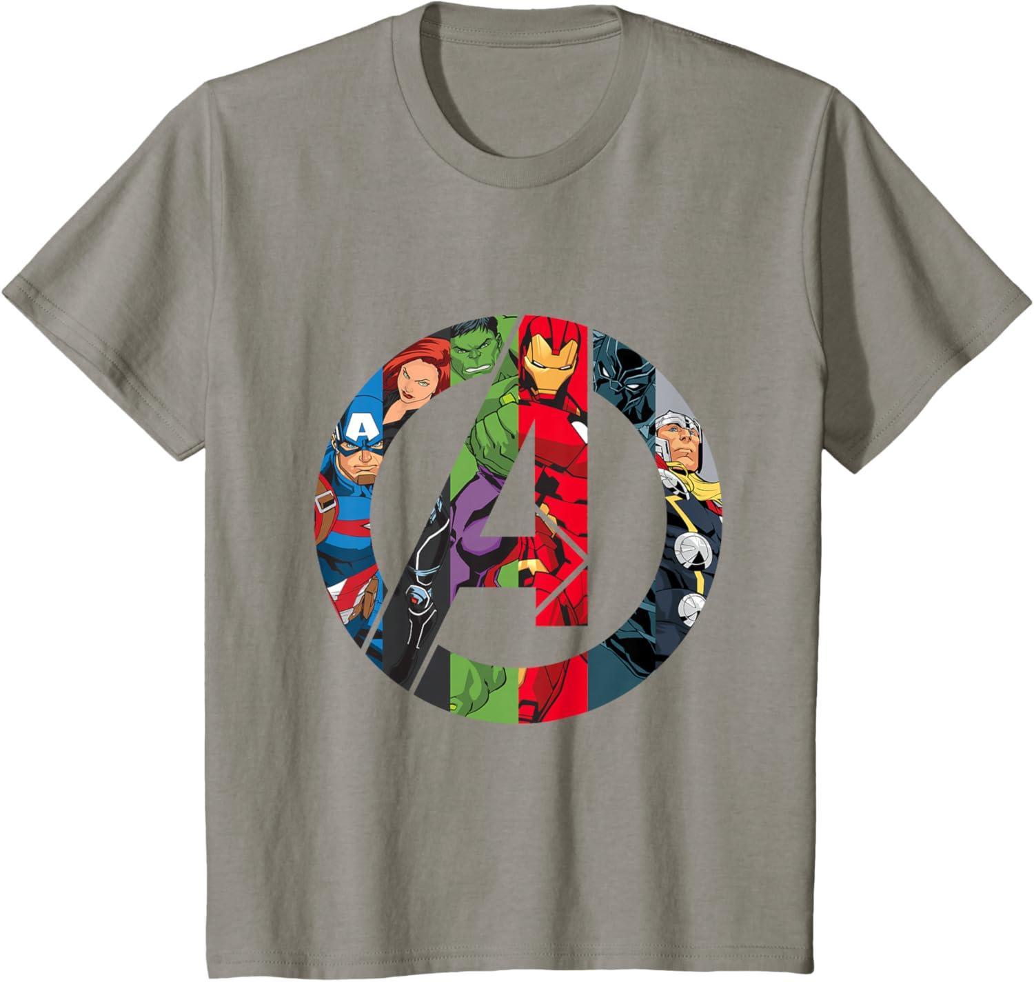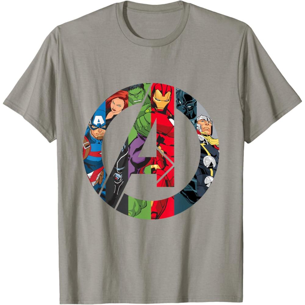 The Avengers come together on this awesome “A” logo graphic tee shirt. Captain America, Black Widow, Hulk, Iron Man, Black Panther, and Thor are illustrated inside the Avengers logo in their classic comic style. This cool t-shirt is sure to add some Super Hero power to your wardrobe.