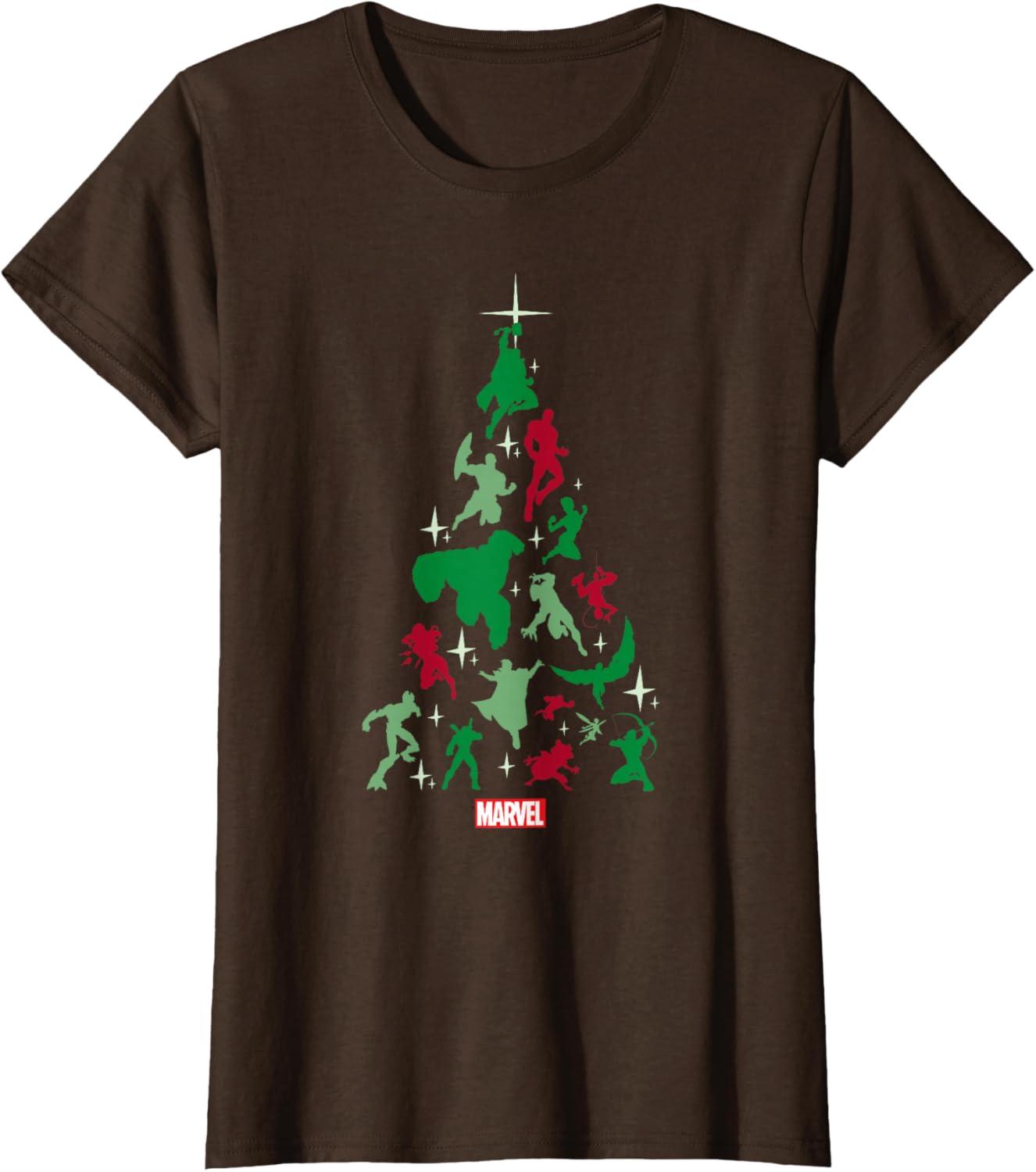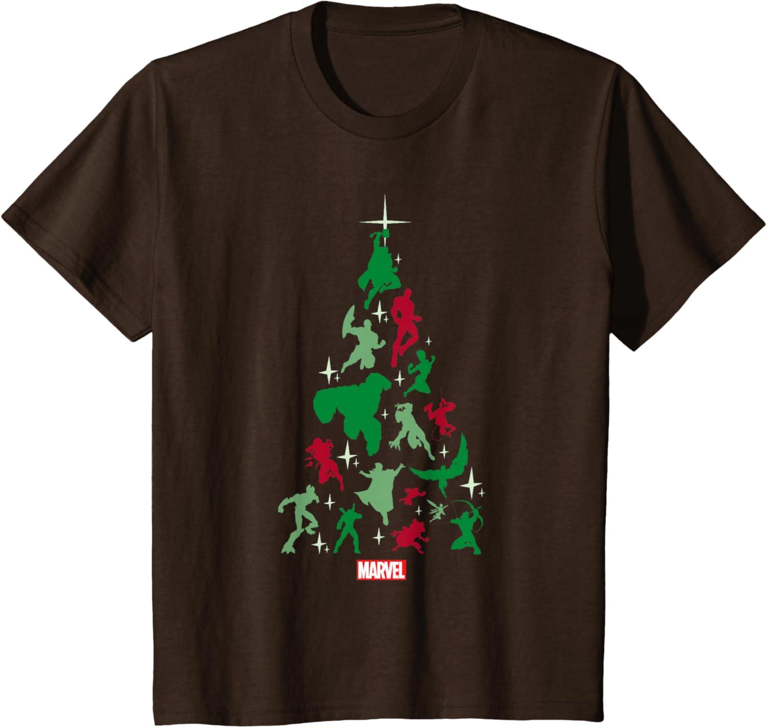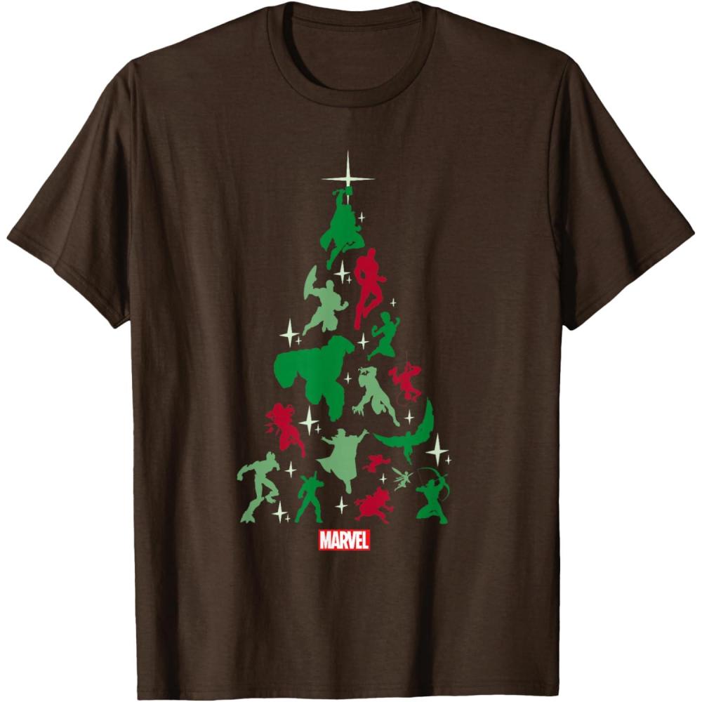 Your favorite Marvel Universe Super Heroes shape a holiday tree on this fearless graphic t-shirt design. Red and green silhouettes of Thor, Captain America, Iron Man, The Incredible Hulk, Captain Marvel, Spider-Man, Black Panther, Black Widow, Doctor Strange, Ant-Man, Wasp, Falcon, Groot, Deadpool, Rocket and Hawkeye suspend in space with the Marvel logo at the bottom, creating the base of this epic Christmas tree.