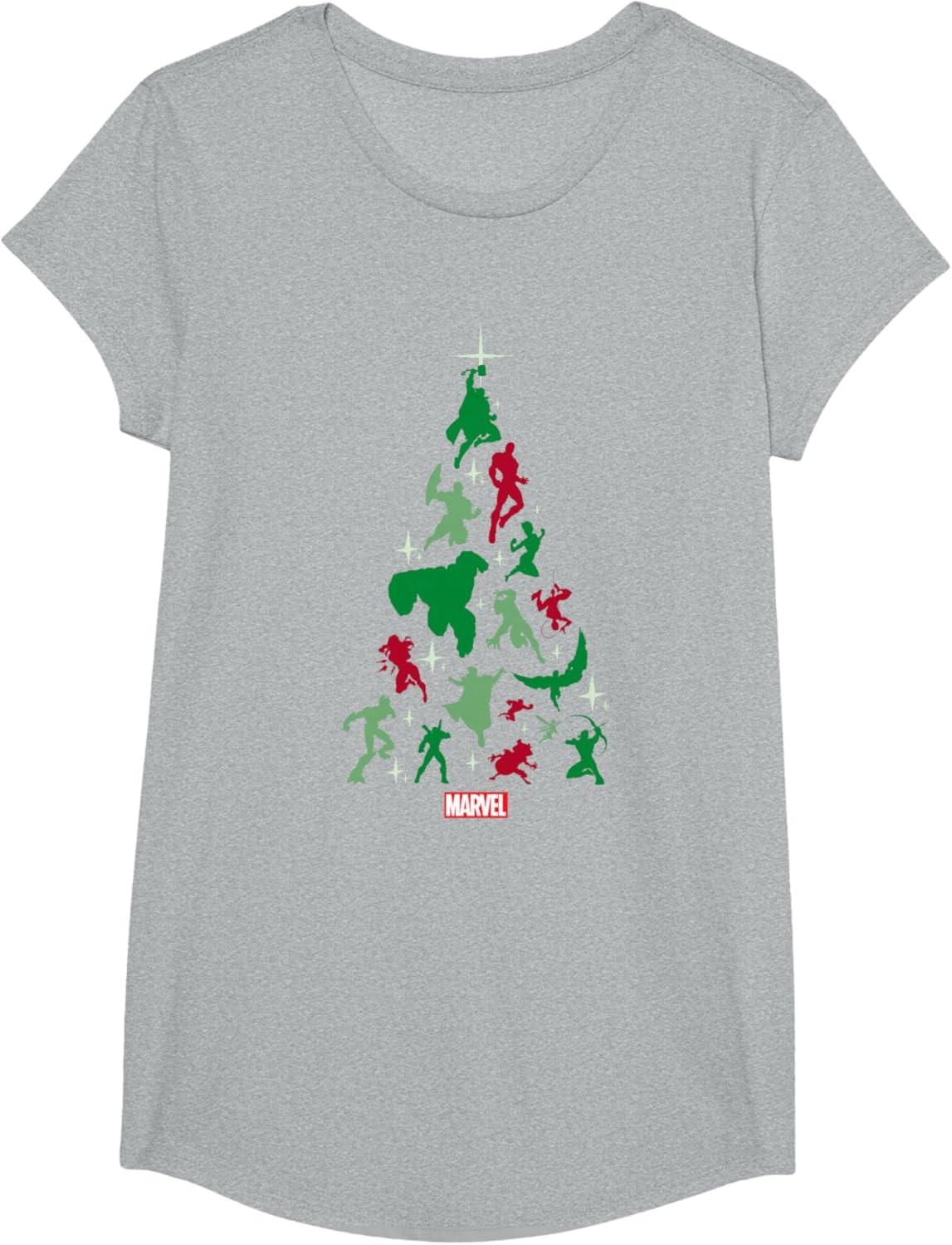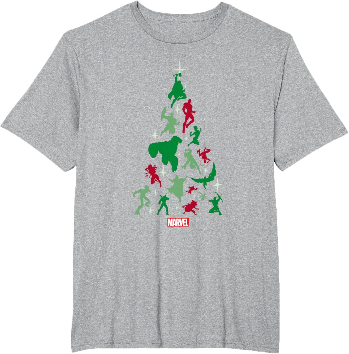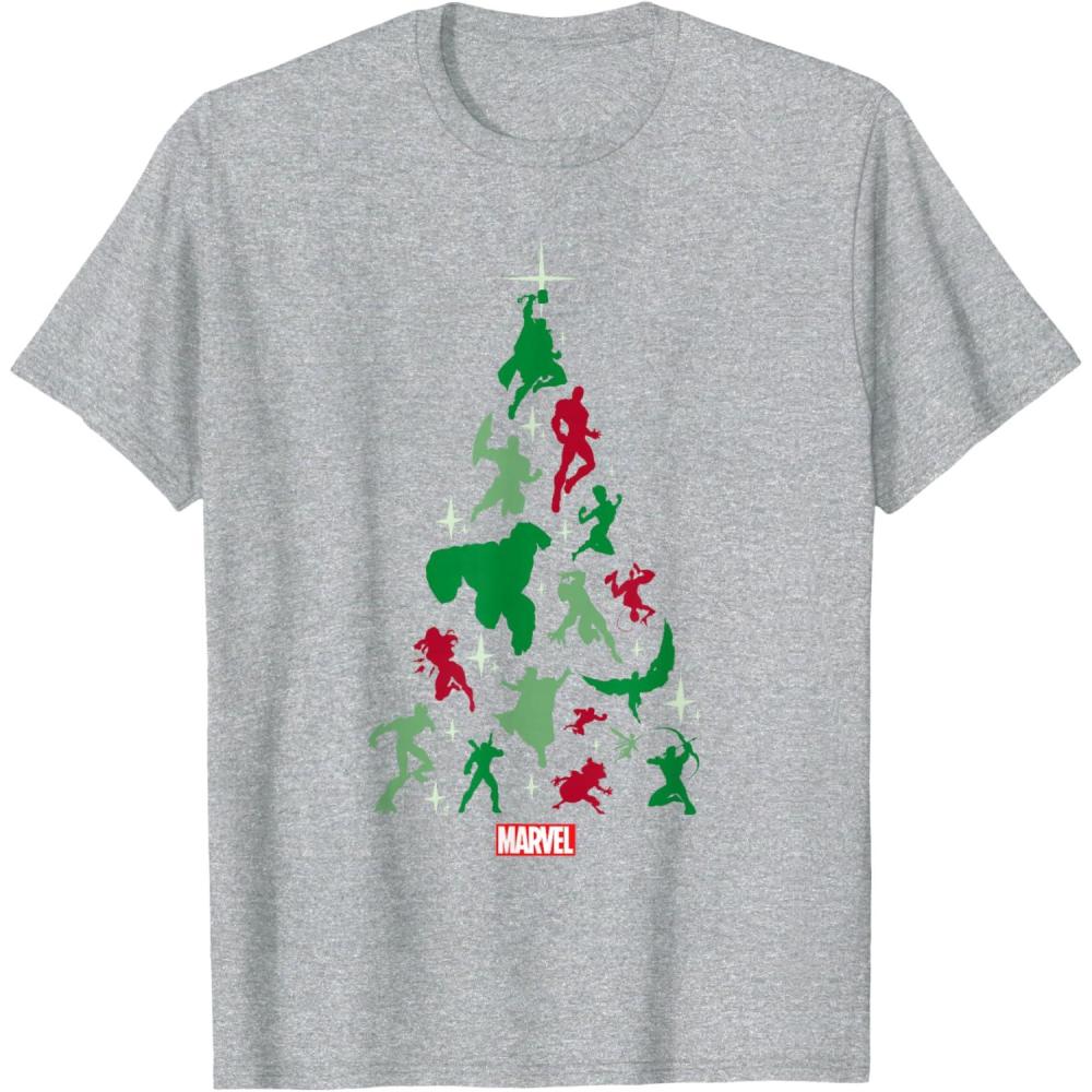 Your favorite Marvel Universe Super Heroes shape a holiday tree on this fearless graphic t-shirt design. Red and green silhouettes of Thor, Captain America, Iron Man, The Incredible Hulk, Captain Marvel, Spider-Man, Black Panther, Black Widow, Doctor Strange, Ant-Man, Wasp, Falcon, Groot, Deadpool, Rocket and Hawkeye suspend in space with the Marvel logo at the bottom, creating the base of this epic Christmas tree.