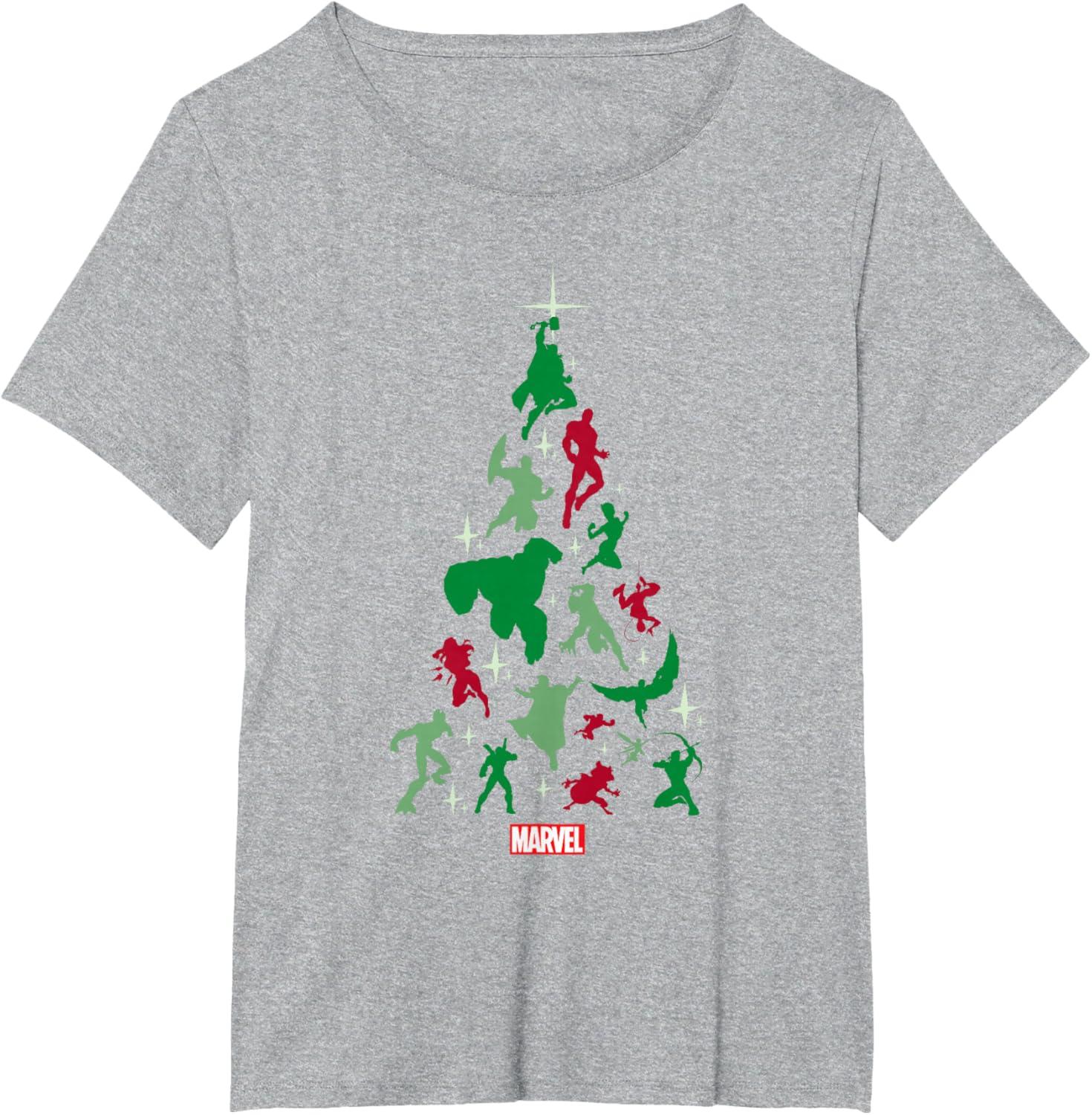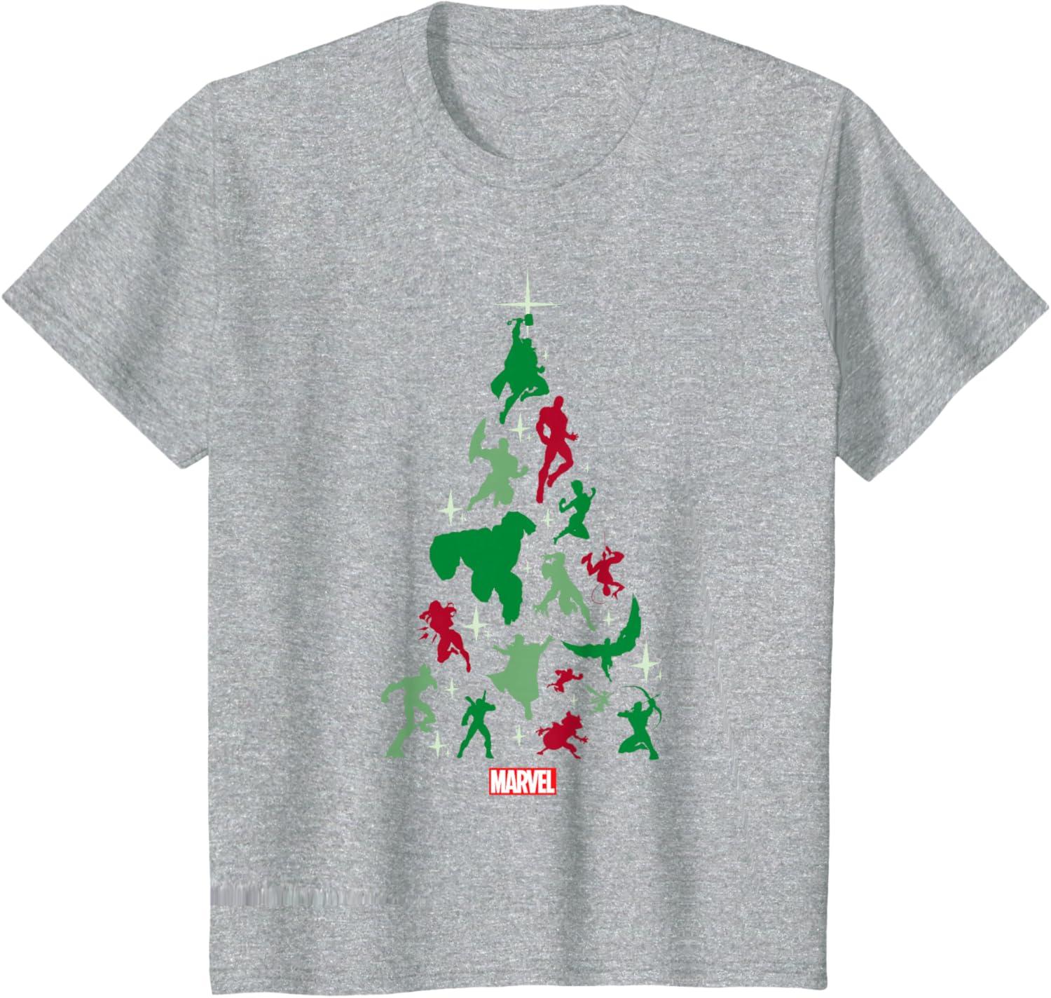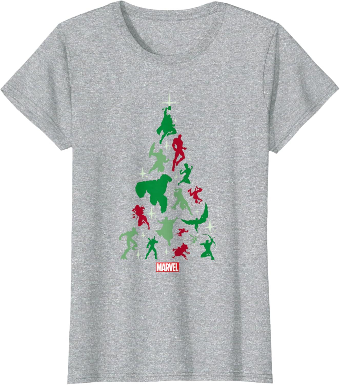 Your favorite Marvel Universe Super Heroes shape a holiday tree on this fearless graphic t-shirt design. Red and green silhouettes of Thor, Captain America, Iron Man, The Incredible Hulk, Captain Marvel, Spider-Man, Black Panther, Black Widow, Doctor Strange, Ant-Man, Wasp, Falcon, Groot, Deadpool, Rocket and Hawkeye suspend in space with the Marvel logo at the bottom, creating the base of this epic Christmas tree.