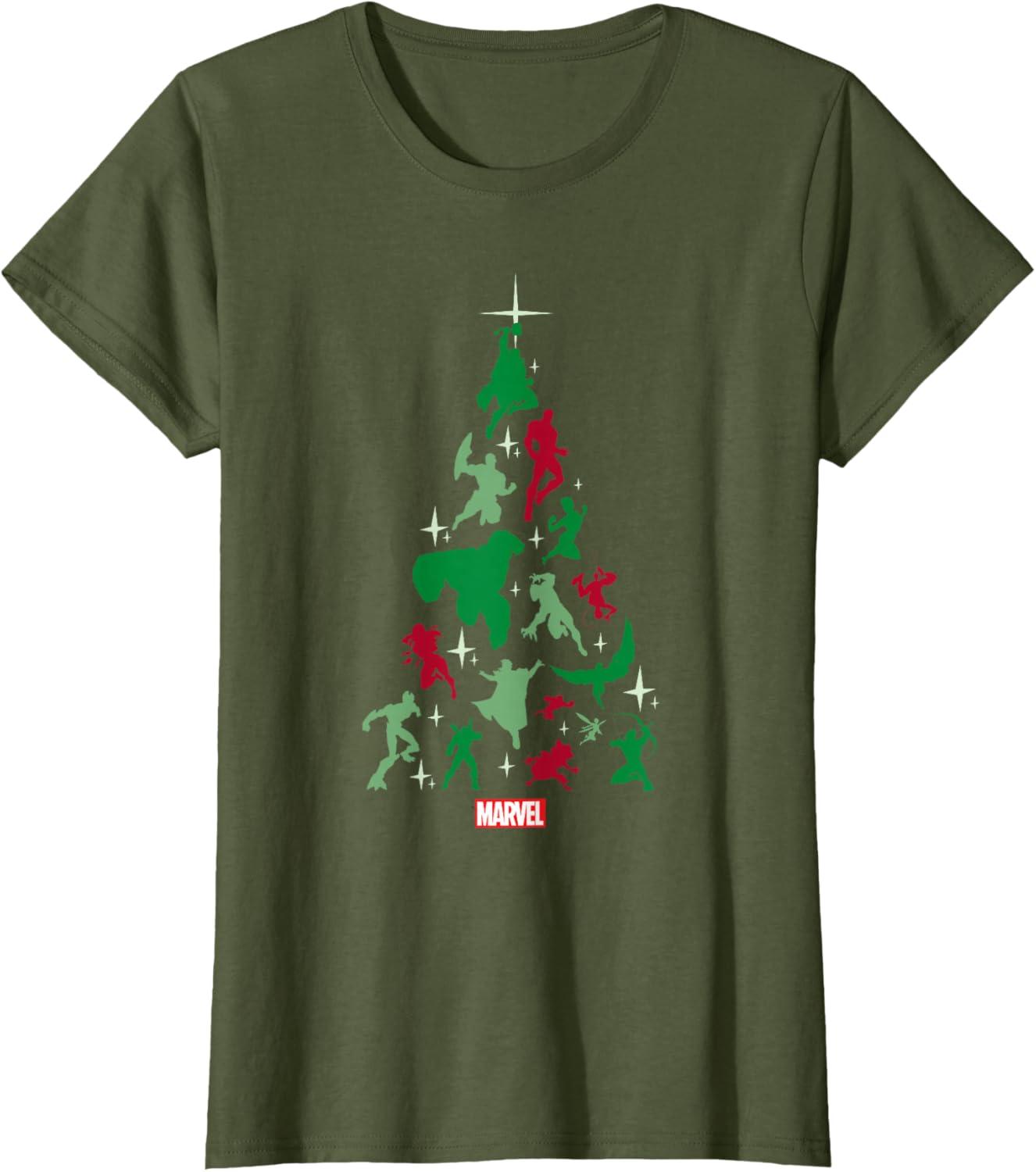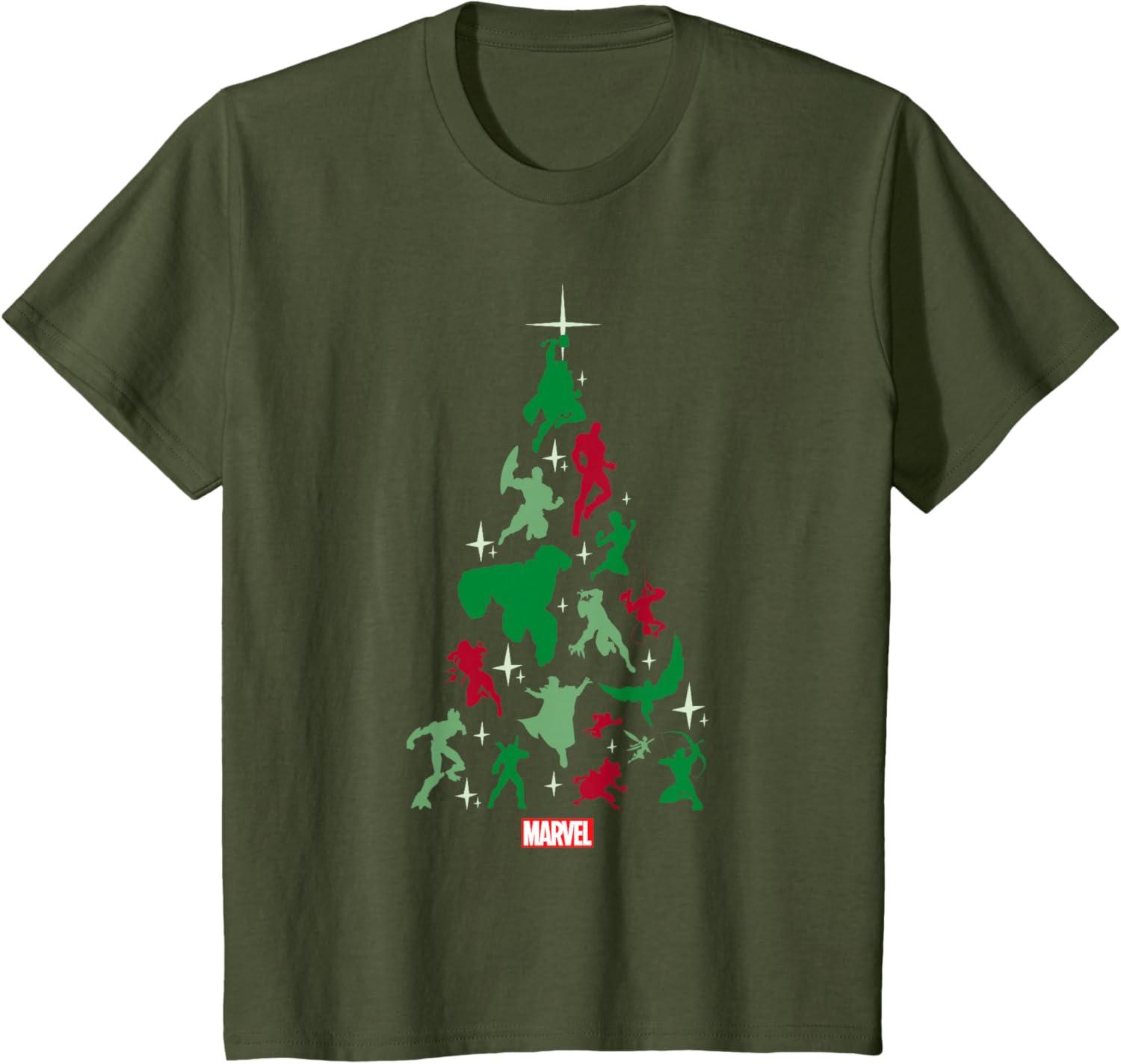 Your favorite Marvel Universe Super Heroes shape a holiday tree on this fearless graphic t-shirt design. Red and green silhouettes of Thor, Captain America, Iron Man, The Incredible Hulk, Captain Marvel, Spider-Man, Black Panther, Black Widow, Doctor Strange, Ant-Man, Wasp, Falcon, Groot, Deadpool, Rocket and Hawkeye suspend in space with the Marvel logo at the bottom, creating the base of this epic Christmas tree.