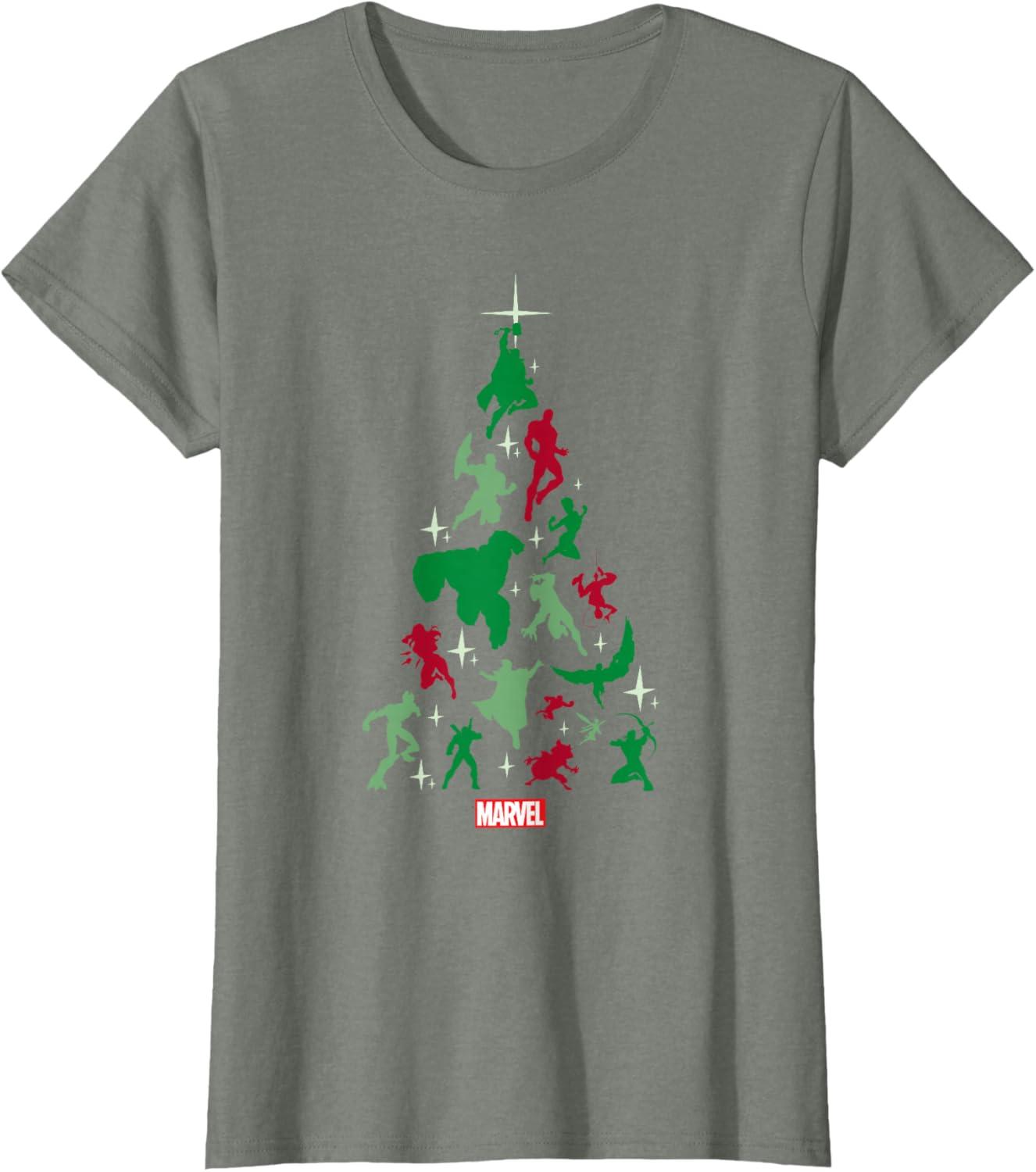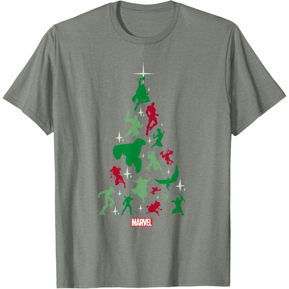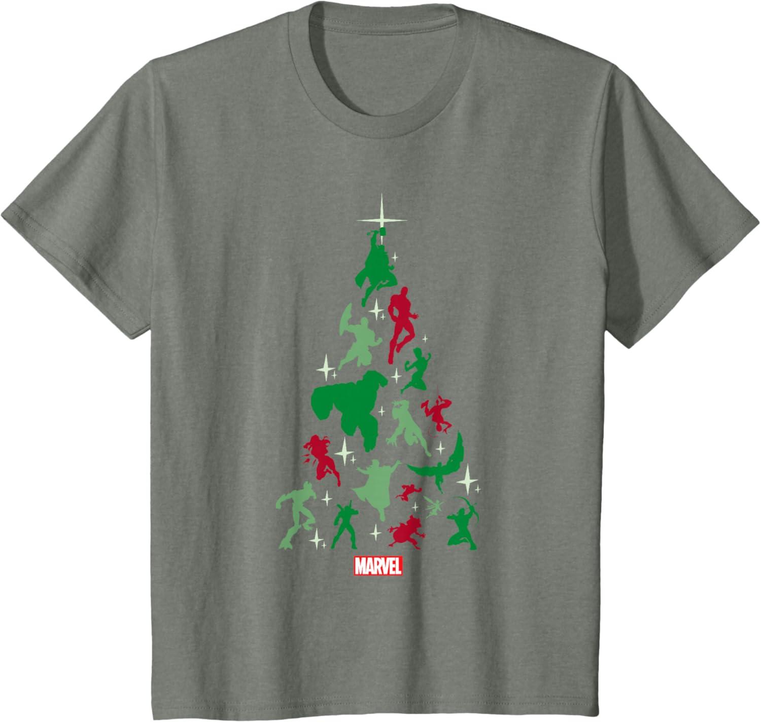 Your favorite Marvel Universe Super Heroes shape a holiday tree on this fearless graphic t-shirt design. Red and green silhouettes of Thor, Captain America, Iron Man, The Incredible Hulk, Captain Marvel, Spider-Man, Black Panther, Black Widow, Doctor Strange, Ant-Man, Wasp, Falcon, Groot, Deadpool, Rocket and Hawkeye suspend in space with the Marvel logo at the bottom, creating the base of this epic Christmas tree.