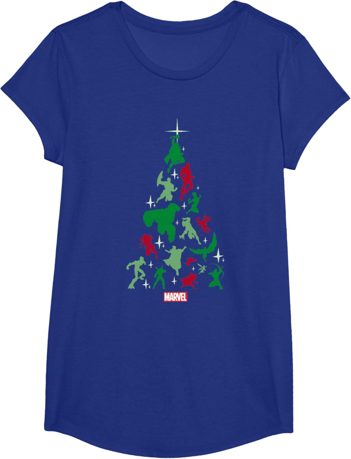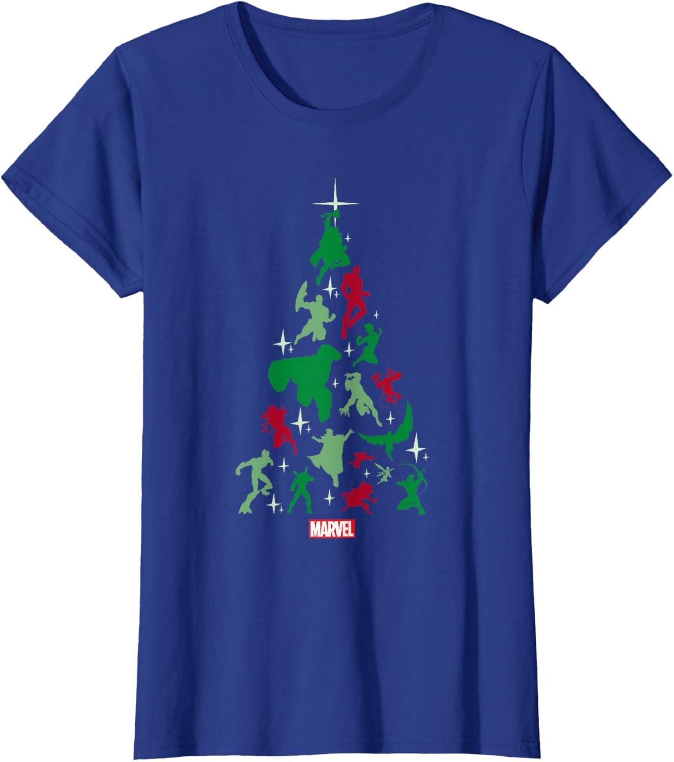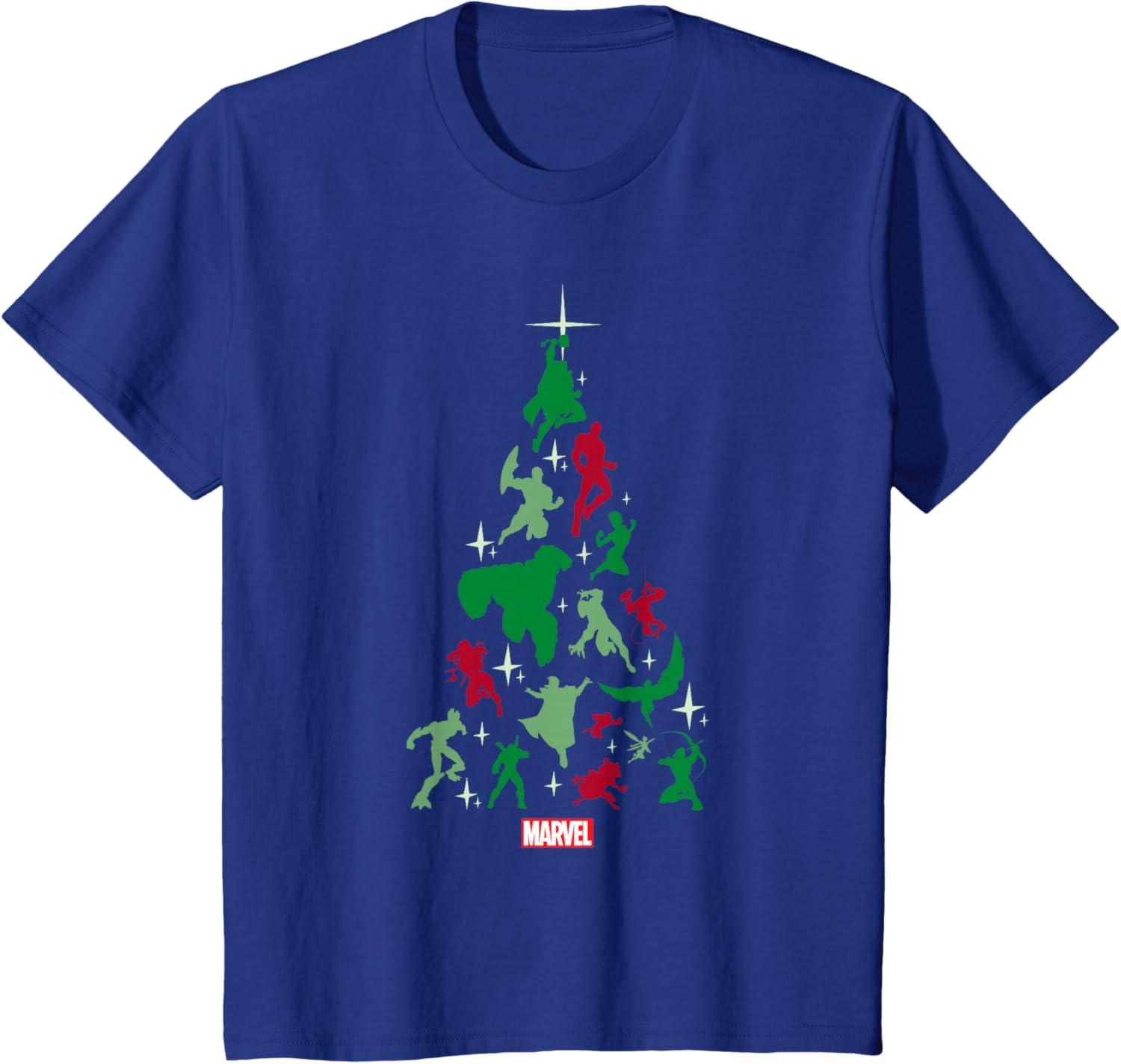 Your favorite Marvel Universe Super Heroes shape a holiday tree on this fearless graphic t-shirt design. Red and green silhouettes of Thor, Captain America, Iron Man, The Incredible Hulk, Captain Marvel, Spider-Man, Black Panther, Black Widow, Doctor Strange, Ant-Man, Wasp, Falcon, Groot, Deadpool, Rocket and Hawkeye suspend in space with the Marvel logo at the bottom, creating the base of this epic Christmas tree.