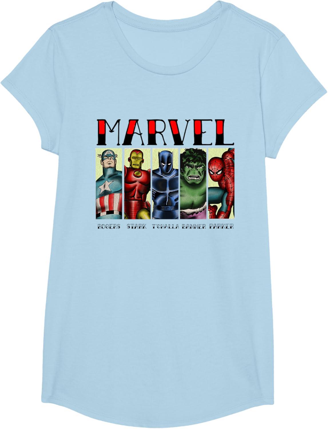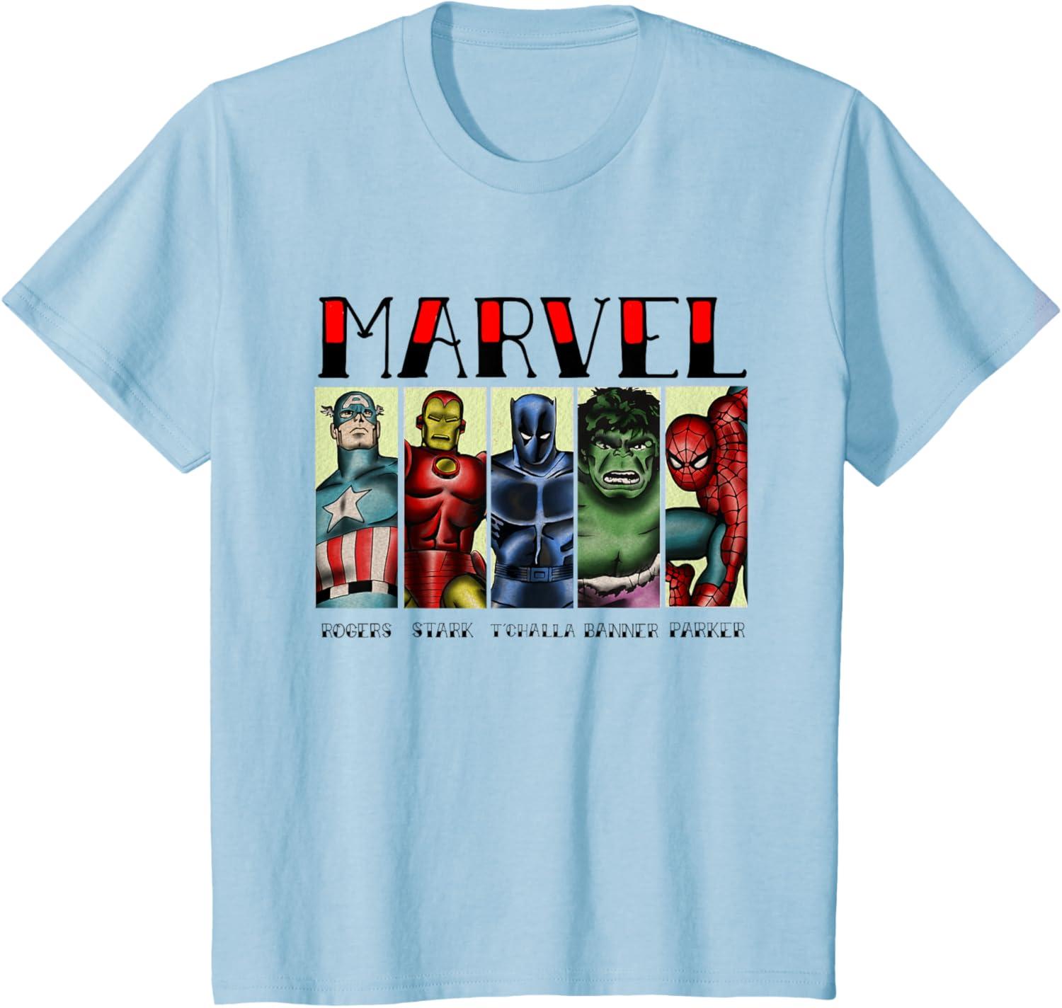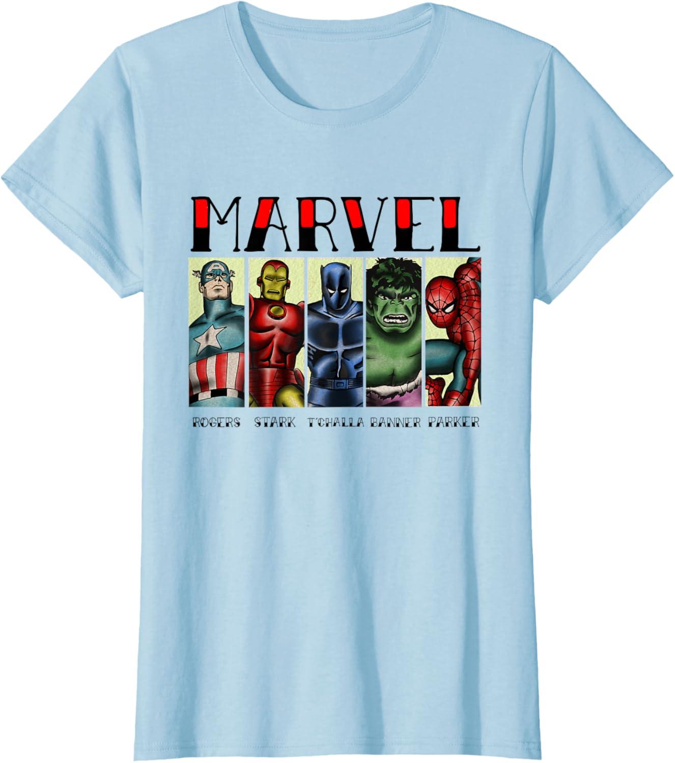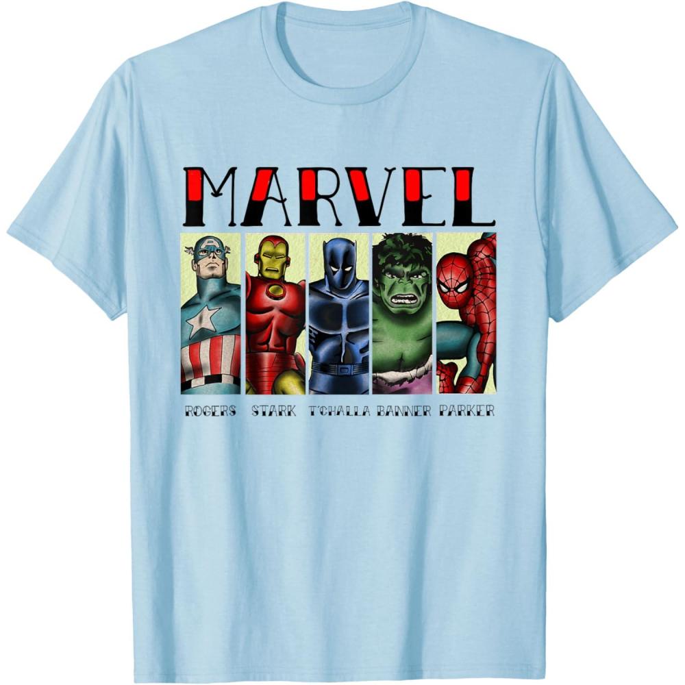 Marvel Avengers and Spider-Man Super Hero Real Names Retro T-Shirt(Baby Blue)