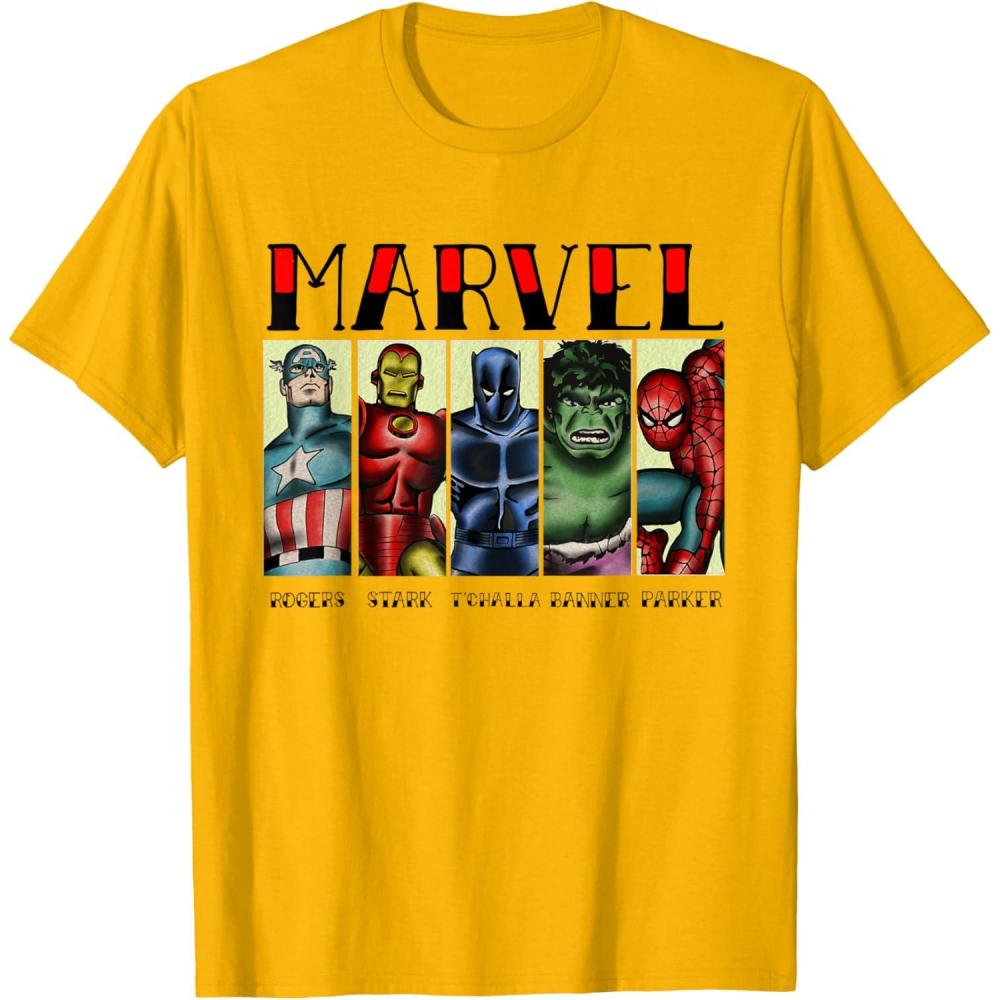Marvel Avengers and Spider-Man Super Hero Real Names Retro T-Shirt(Golden Yellow)