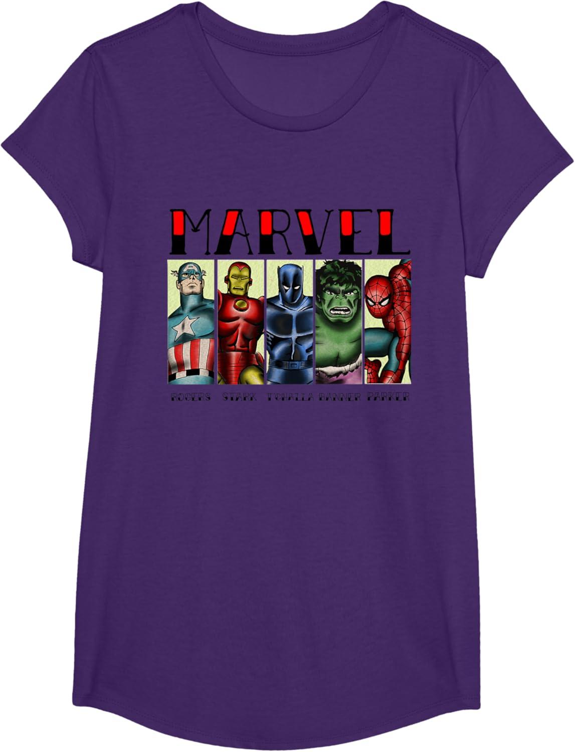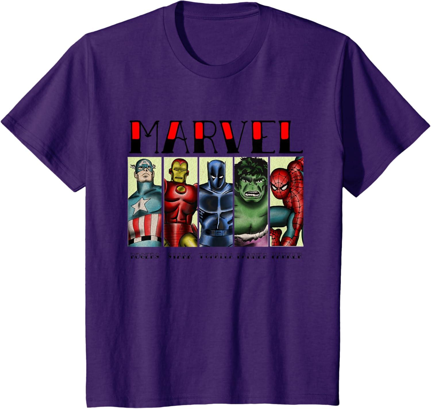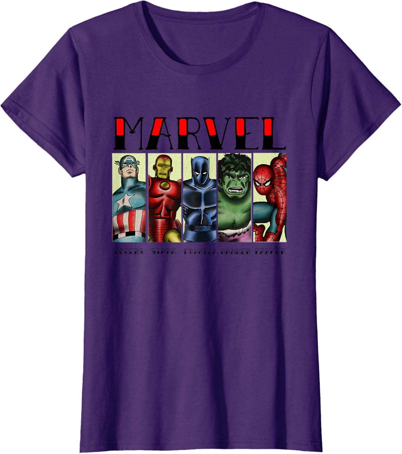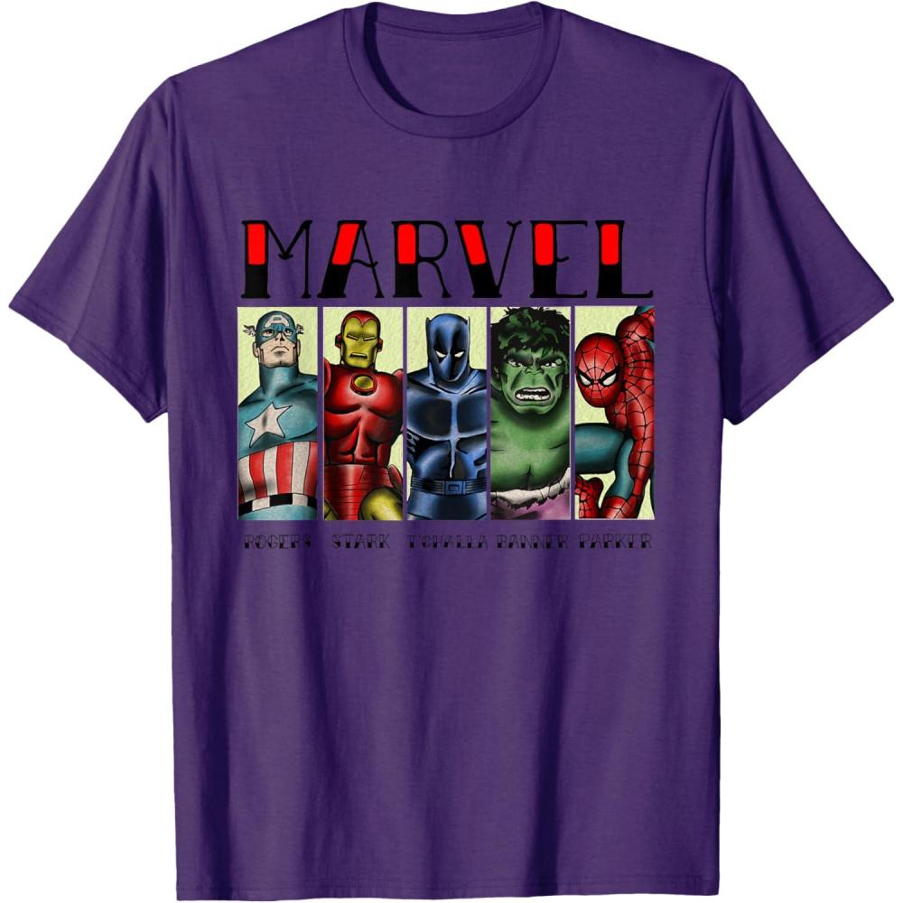 Marvel Avengers and Spider-Man Super Hero Real Names Retro T-Shirt(Purple)