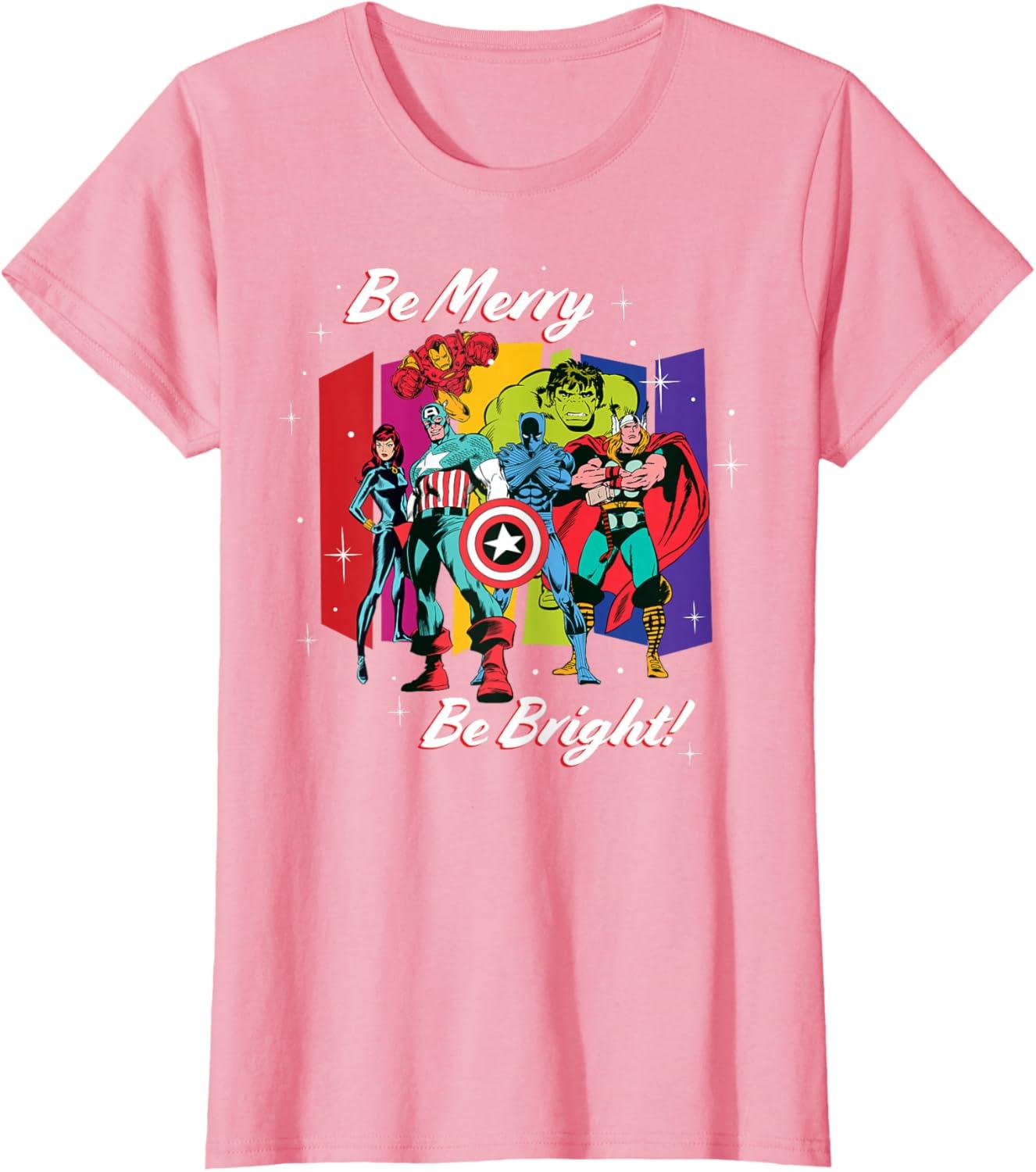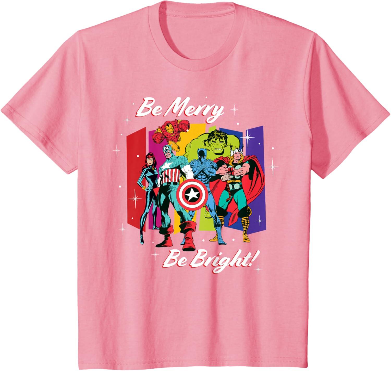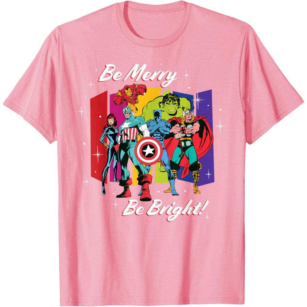 Avengers, assemble…for the holidays! Celebrate your super Christmas season with this official Marvel tee or hoodie, featuring the classic comic Avengers team of Captain America, Iron Man, Black Widow, Thor, Hulk, and Black Panther in a vintage ‘70s art style, complete with starry color bars and the holiday message “Be Merry, Be Bright!” A great Christmas gift for a Marvel Super Heroes or Avengers fan! Planning a winter holiday trip to Avengers Campus at Disney California Adventure Park or another super destination? Get multiples to coordinate and match with friends and family for a hero-sized Christmas celebration! Available in youth and adult sizes. Find it in a t-shirt, premium t-shirt, tank top, v-neck, long sleeve tee, hoodie, and sweatshirt.