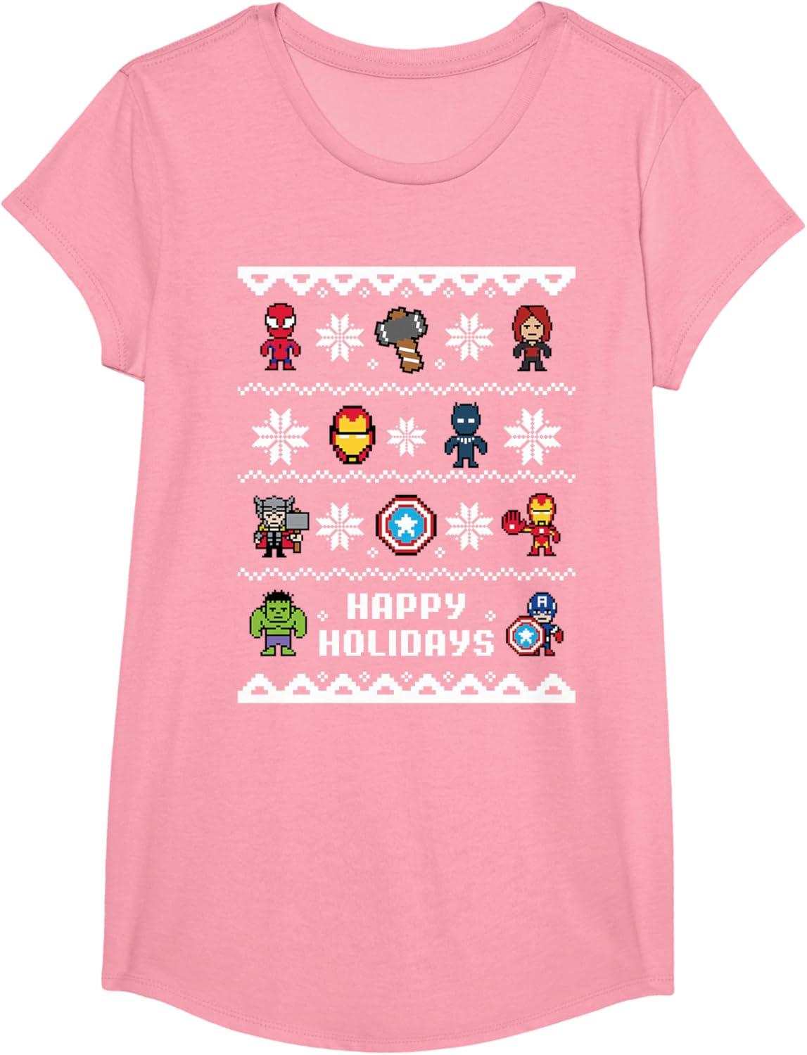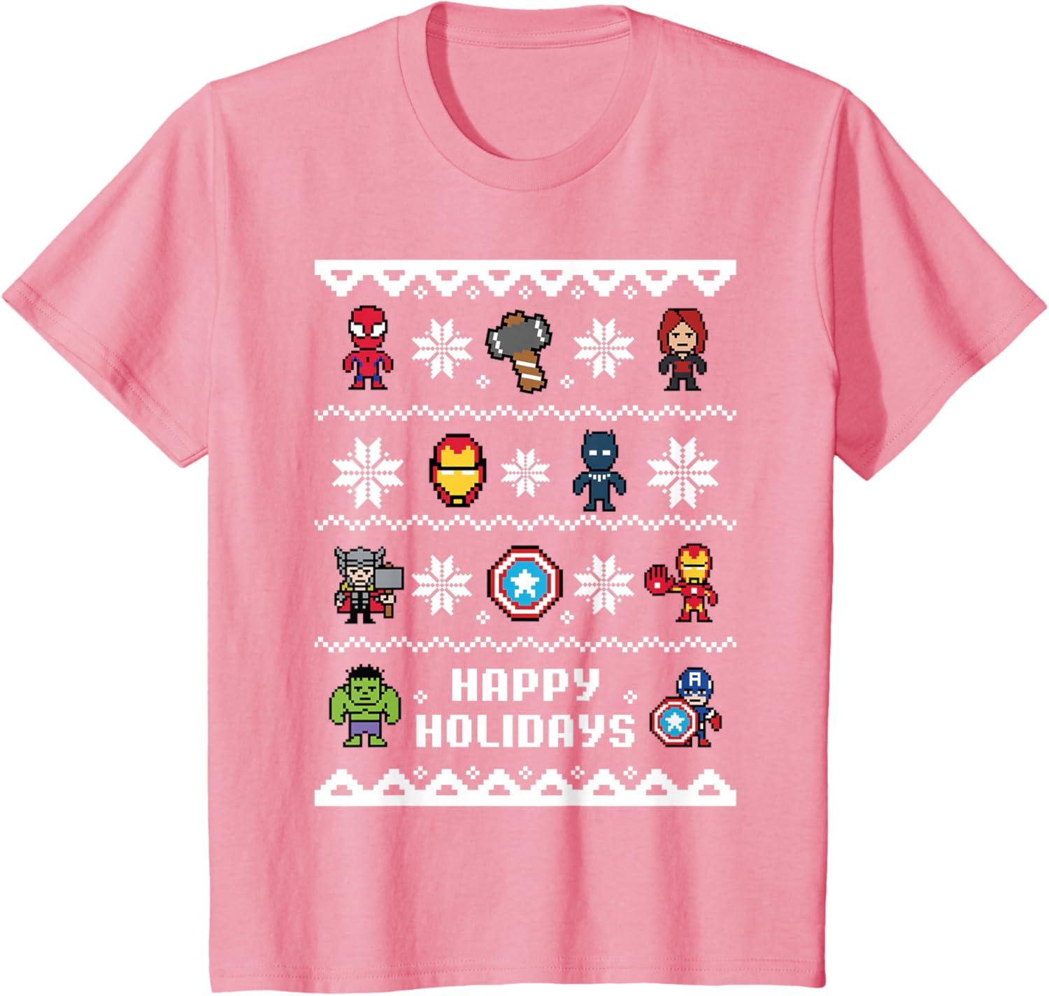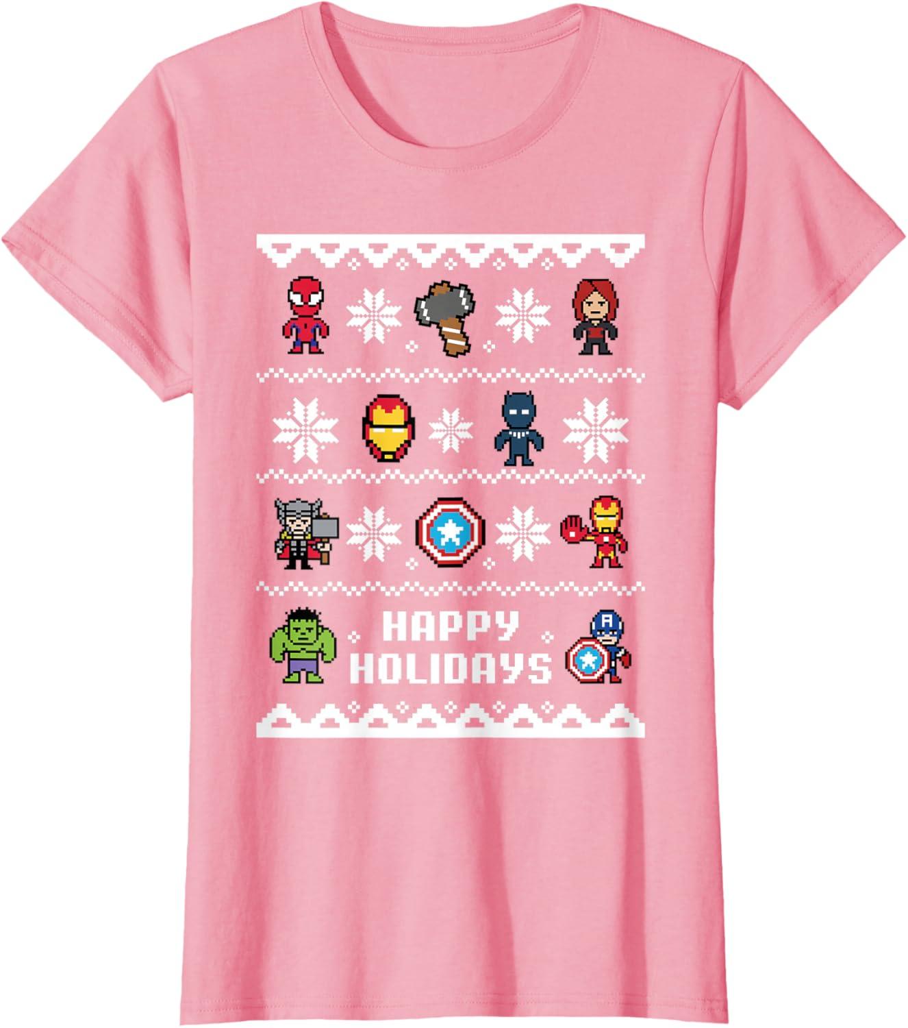 Avengers Assemble to Wish You Happy Holidays on This Festive Marvel T-shirt! Featuring an ugly Christmas sweater design showcasing Spider-Man, Black Widow, Iron Man, Black Panther, Thor, Captain America, and Hulk among winter snowflakes, this Holiday Avengers t-shirt is a must-have for the merry season. Available in youth and adult sizes. Get it in a t-shirt, premium t-shirt, tank top, v-neck, long sleeve tee, and sweatshirt, all right here on Amazon.
