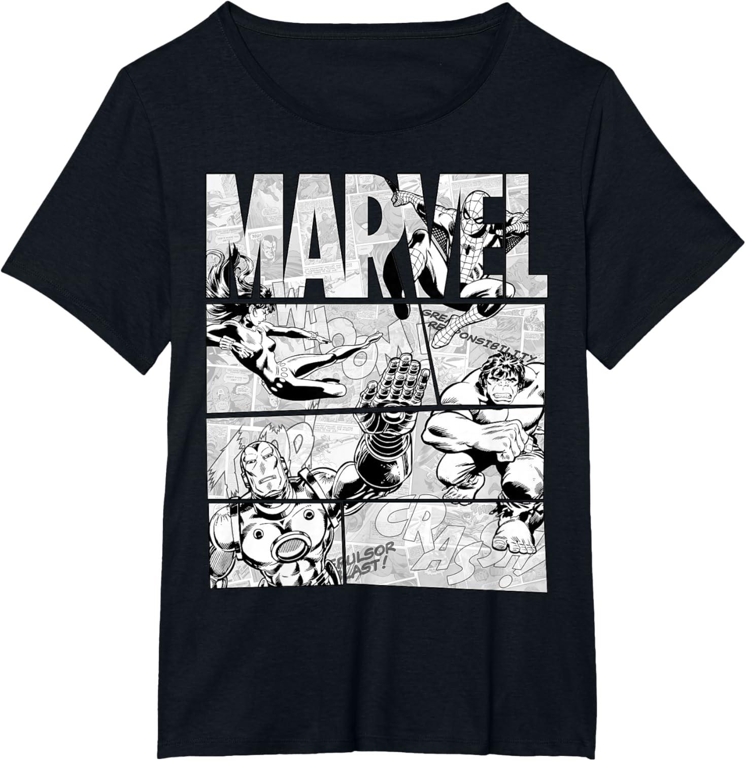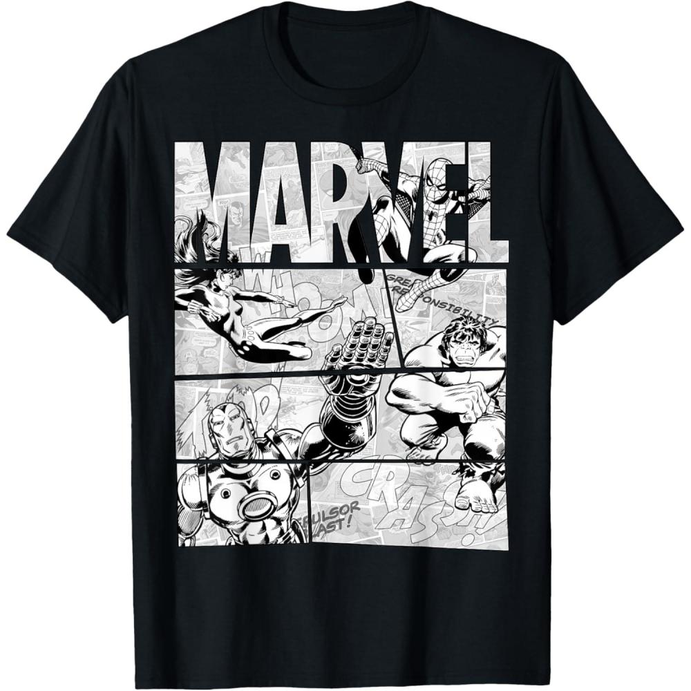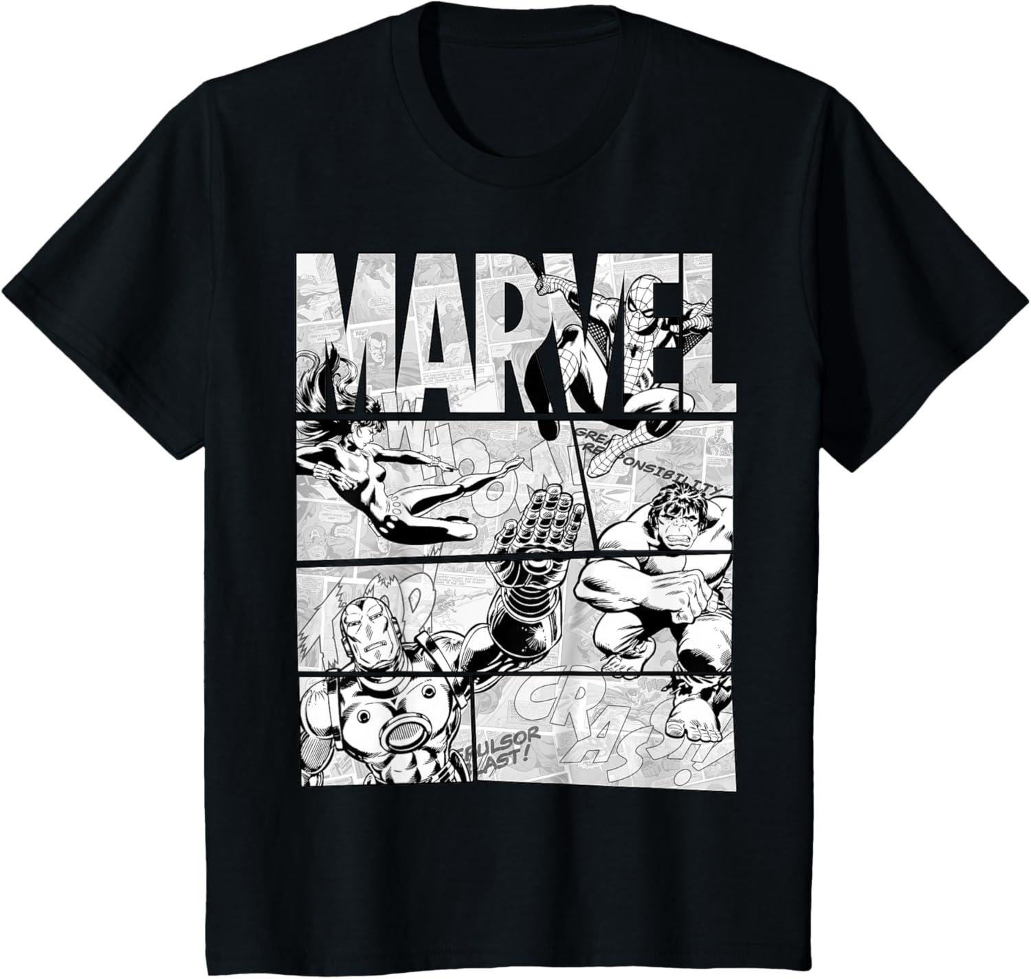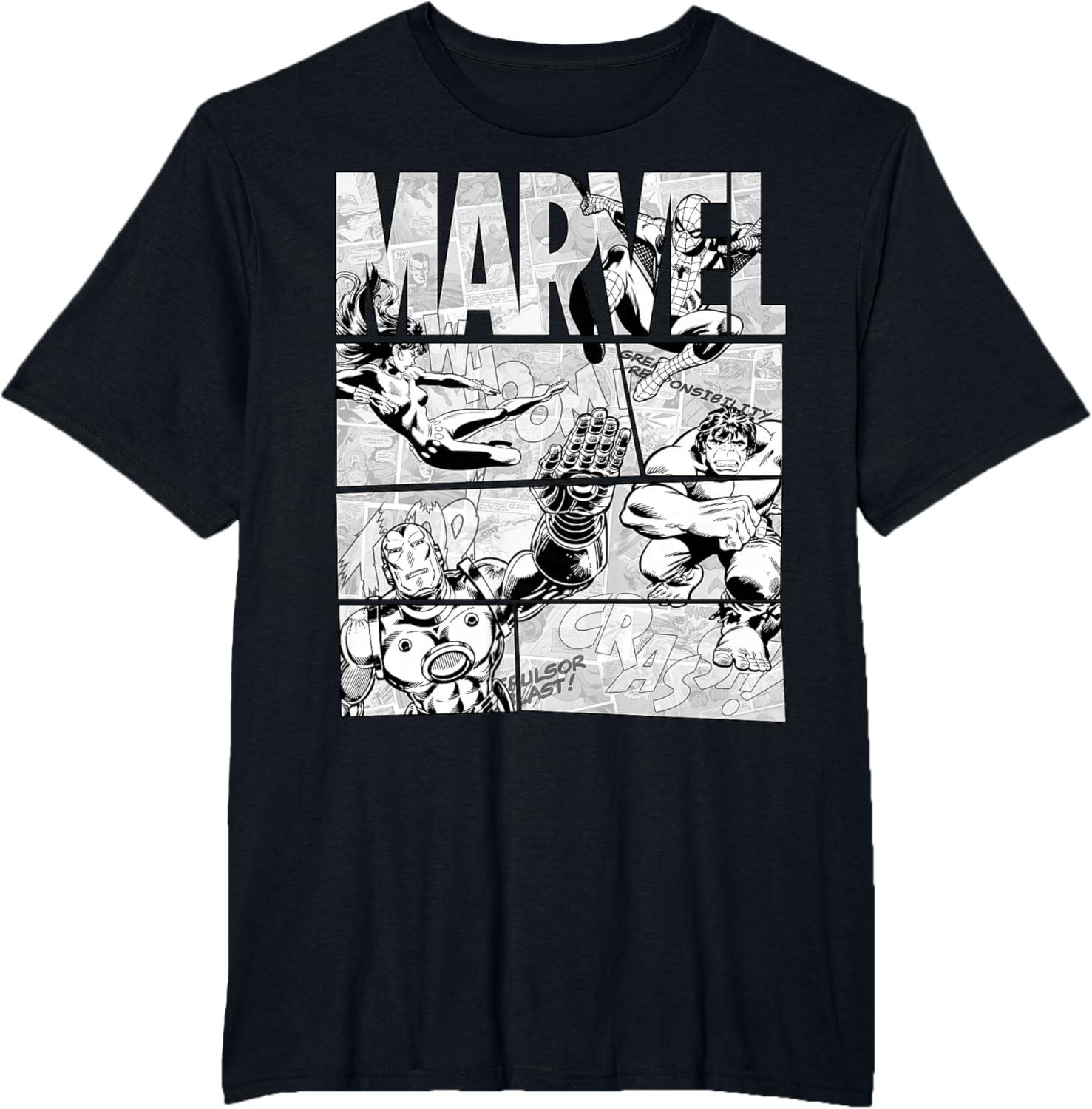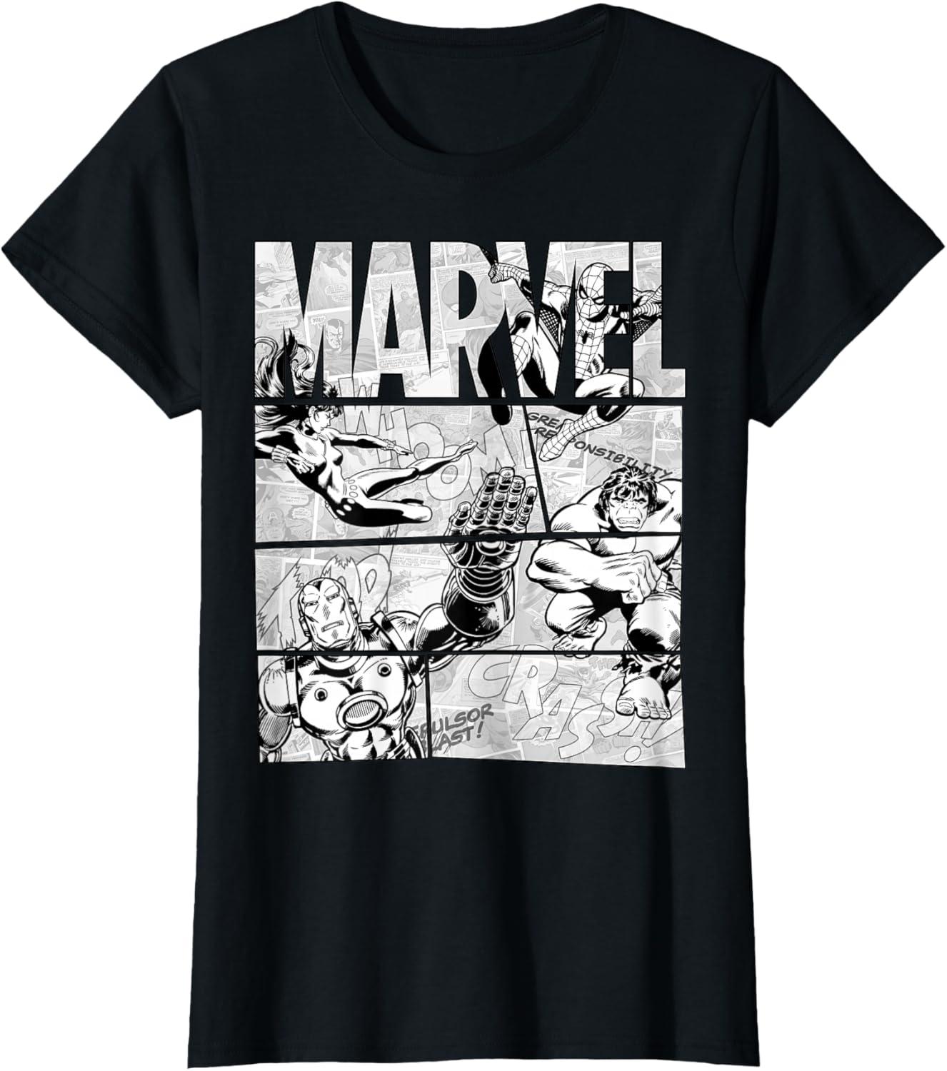 Marvel Avengers Retro Black and White Comic Graphic Short Sleeve T-Shirt(Black)