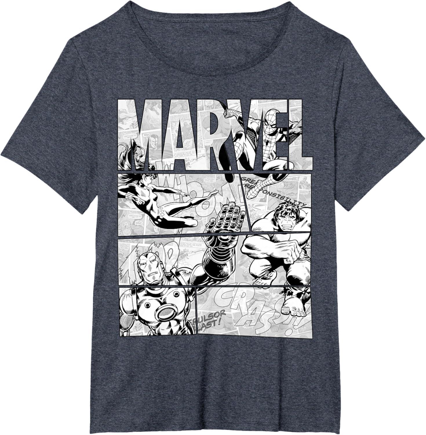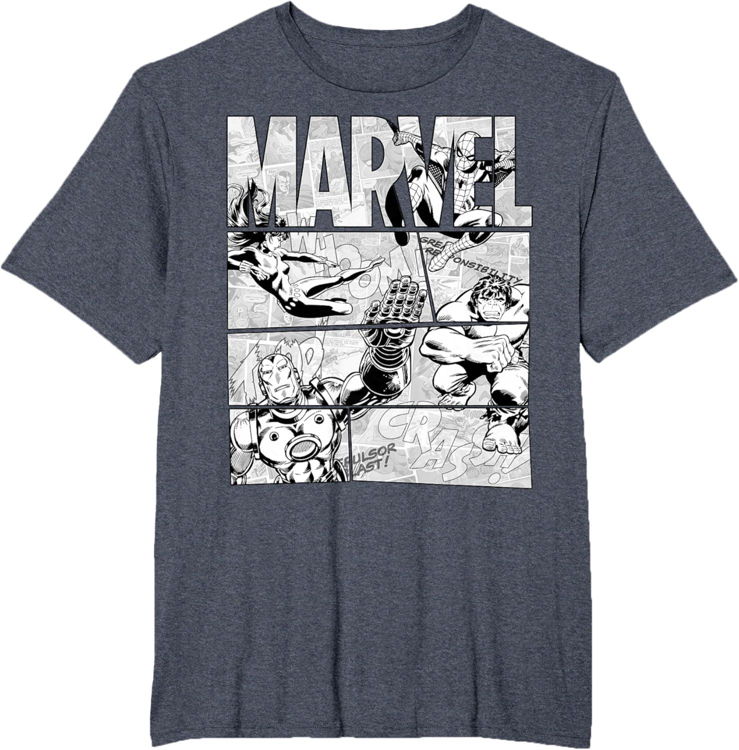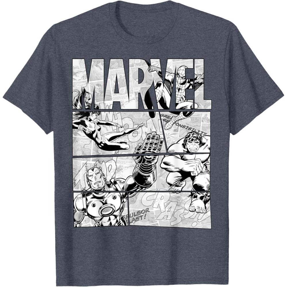 Marvel Avengers Retro Black and White Comic Graphic Short Sleeve T-Shirt(Dark Heather Grey)