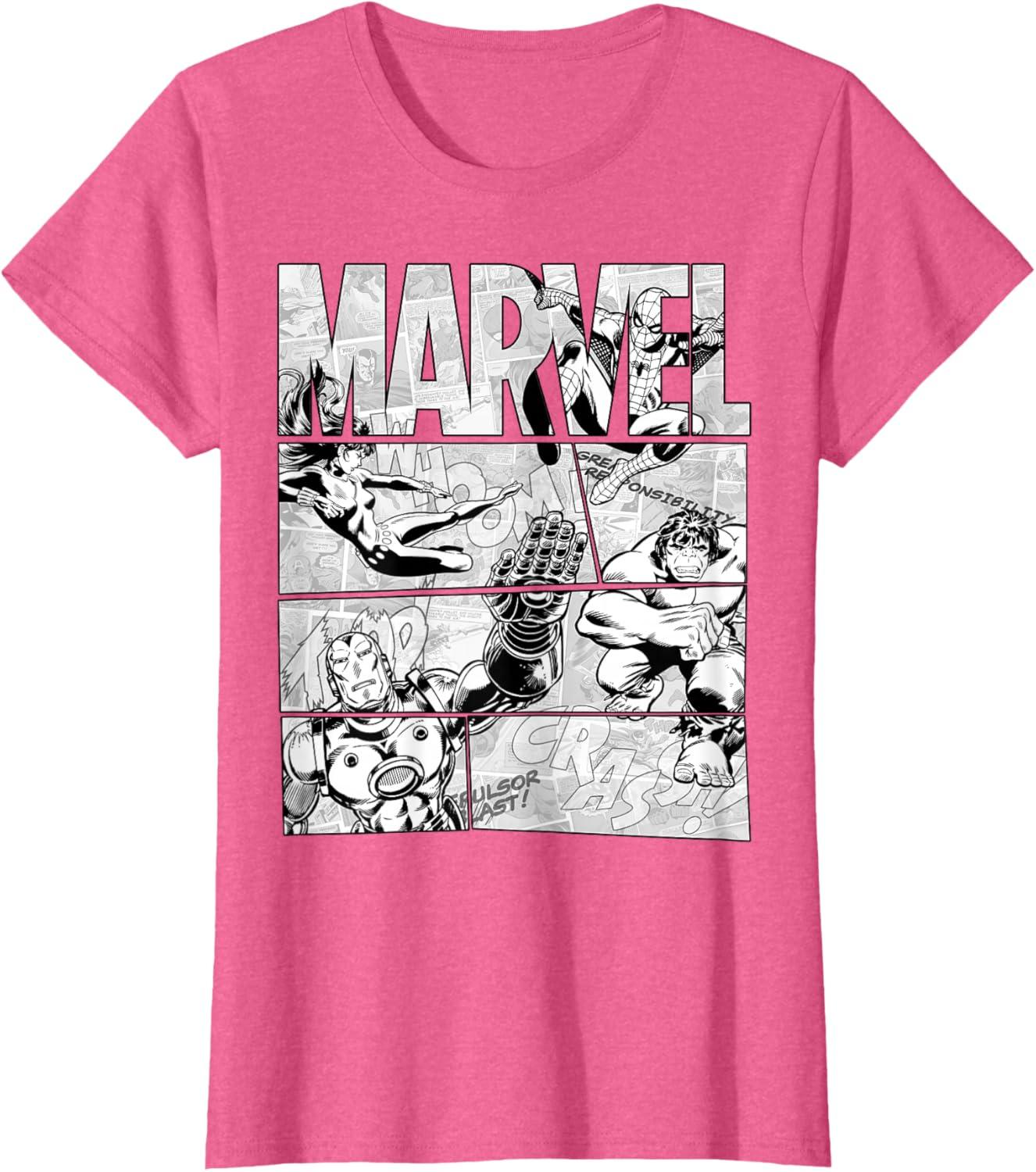 Marvel Avengers Retro Black and White Comic Graphic Short Sleeve T-Shirt(Pink Heather)