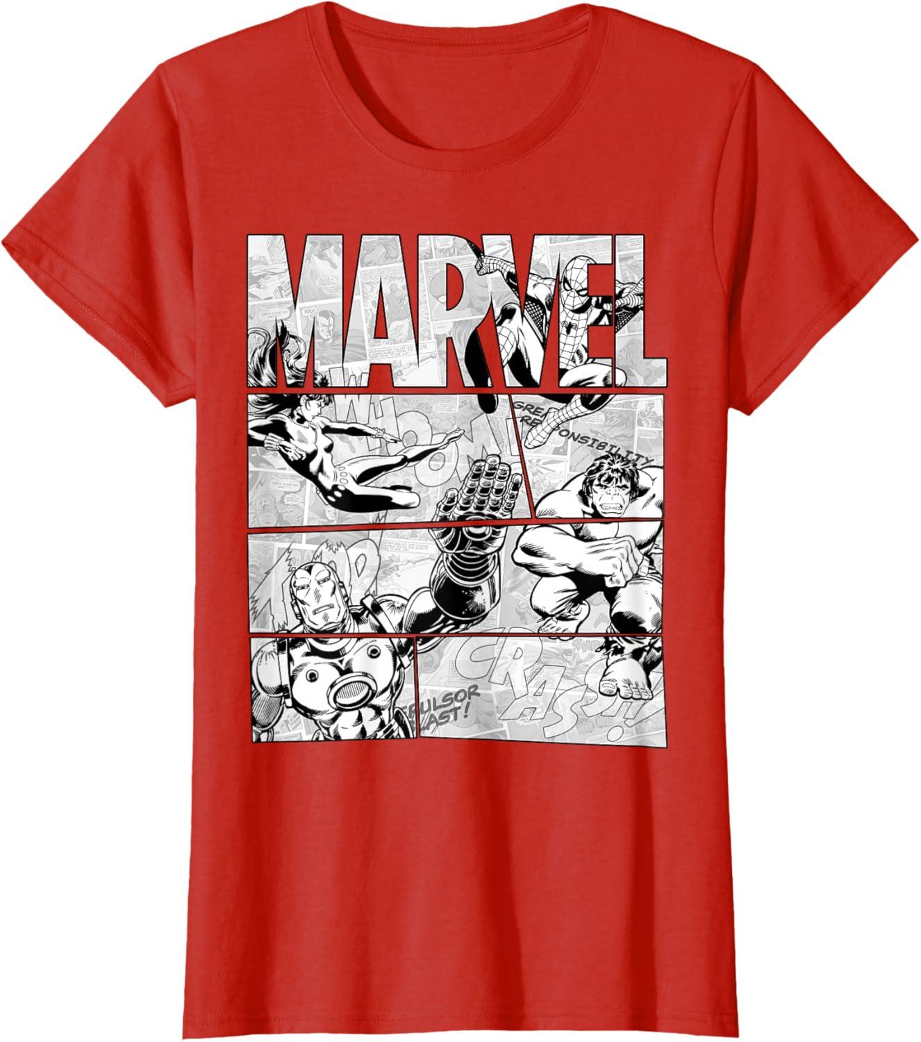 Marvel Avengers Retro Black and White Comic Graphic Short Sleeve T-Shirt(Red)
