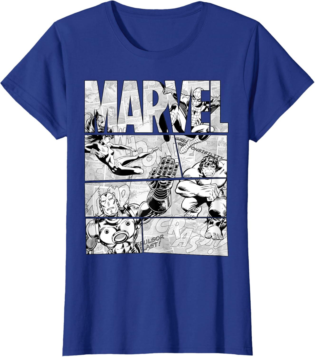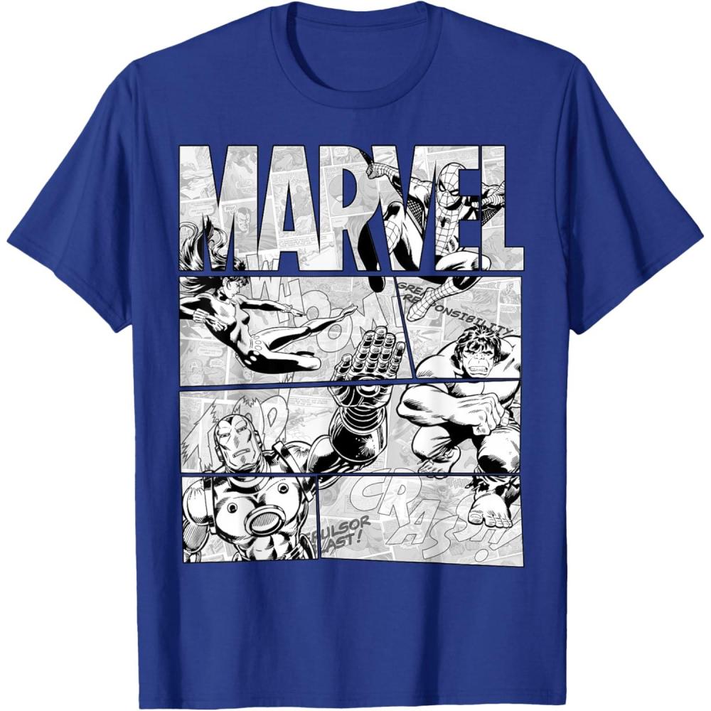 Marvel Avengers Retro Black and White Comic Graphic Short Sleeve T-Shirt(Royal Blue)
