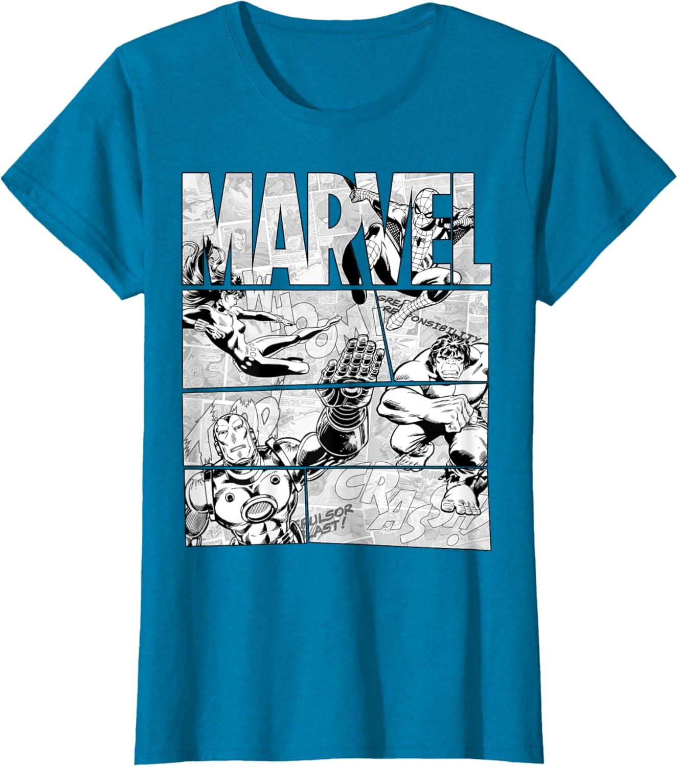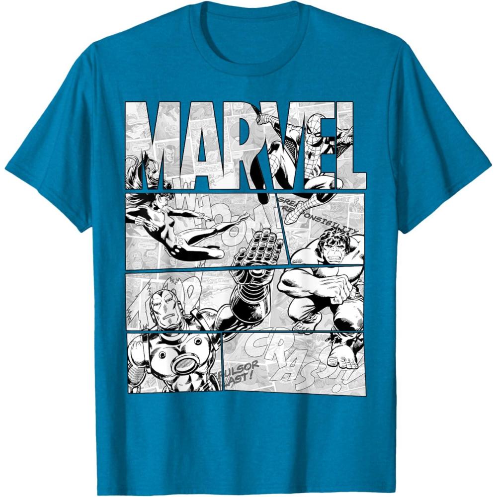 Marvel Avengers Retro Black and White Comic Graphic Short Sleeve T-Shirt(Sapphire Blue)
