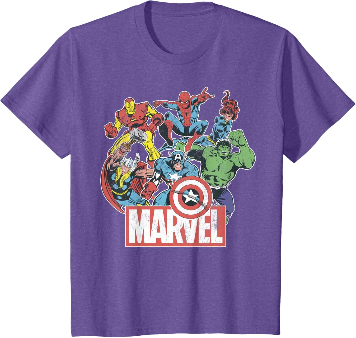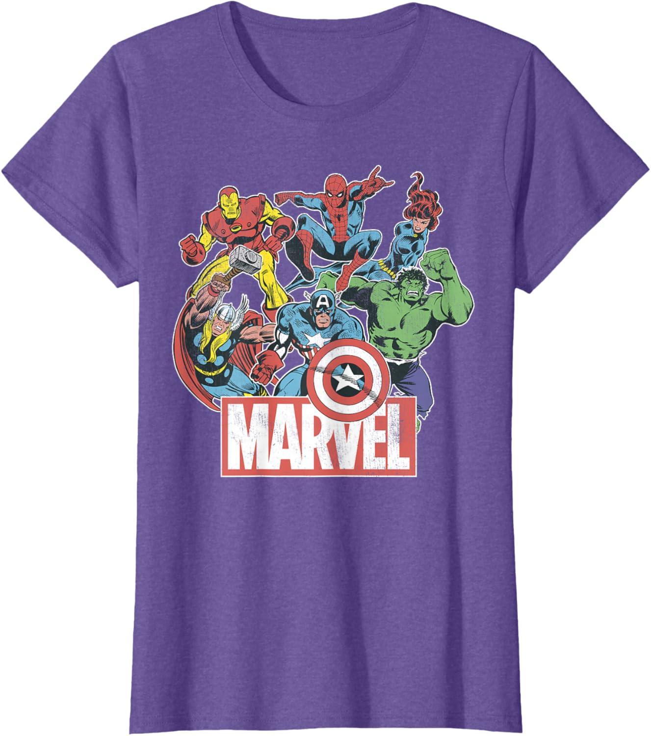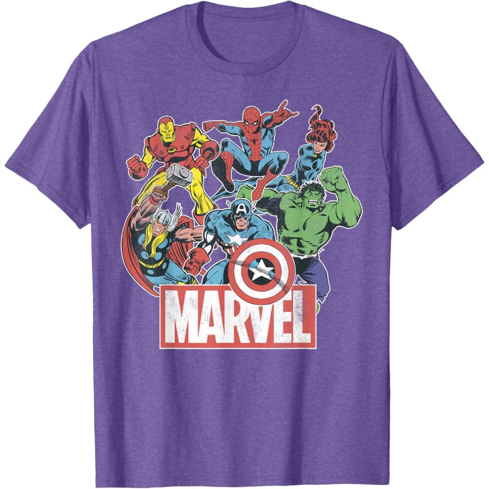 Marvel Avengers Team Retro Comic Vintage Graphic T-Shirt(Purple Heather)