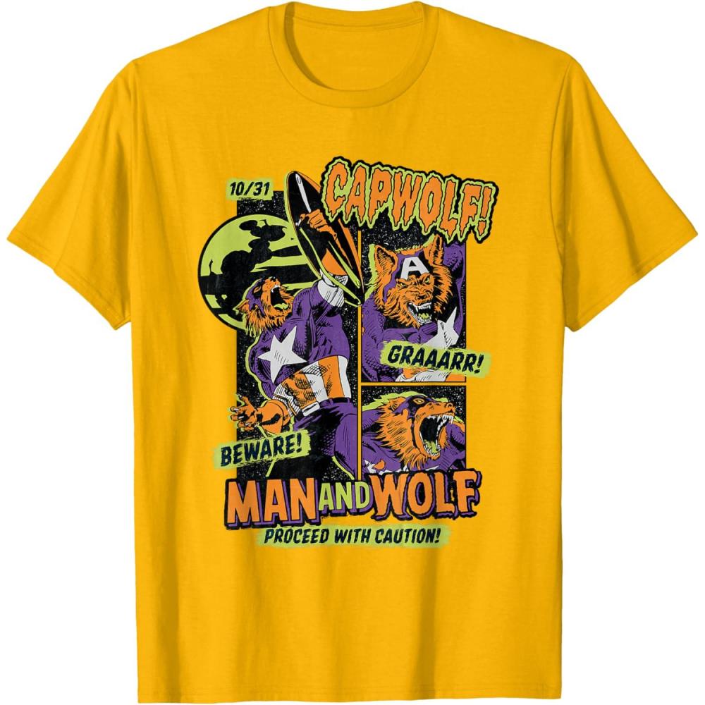 When the full moon rises on Halloween night, Captain America becomes the savage creature known as Capwolf! This official Marvel tee or hoodie features spooky illustrated Marvel Comics art of Steve Rogers transformed into a werewolf, with the Halloween date of 10/31 and the text “Capwolf! Graaarr! Beware! Man and Wolf — Proceed with Caution!” A great Halloween gift for a Marvel Super Heroes fan, and perfect for a superhero themed costume party or Halloween trick-or-treating. Planning a fall trip to Avengers Campus at Disney California Adventure Park, Disneyland, Walt Disney World, or another super destination? Get multiples of this eye-catching graphic tee design and wear matching Marvel Halloween t-shirts with friends and family groups for even more superhero-sized fun! Available in youth and adult sizes. Find it in a t-shirt, premium t-shirt, tank top, v-neck, long sleeve tee, hoodie, and sweatshirt.